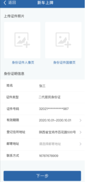 ①上传车主本人身份证照片,填写邮寄地址,核查并选择指标,确认上牌信息;