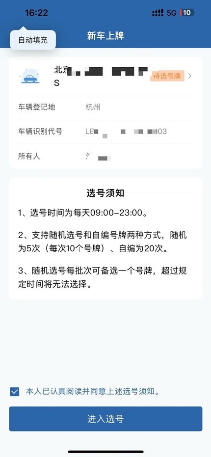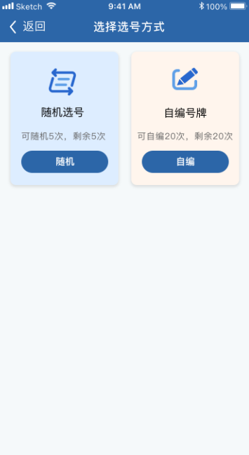 选号环节嵌入业务办理流程,车主可使用原号或者预选号。选号提供随机选号(50选1)和自编自选(20次)两种方式。