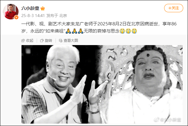 8月3日下午,六小龄童在个人微博发文称,87版《西游记》中的如来佛饰演者,一代影、视、剧艺术大家朱龙广老师于2025年8月2日在北京因病逝世,享年86岁。