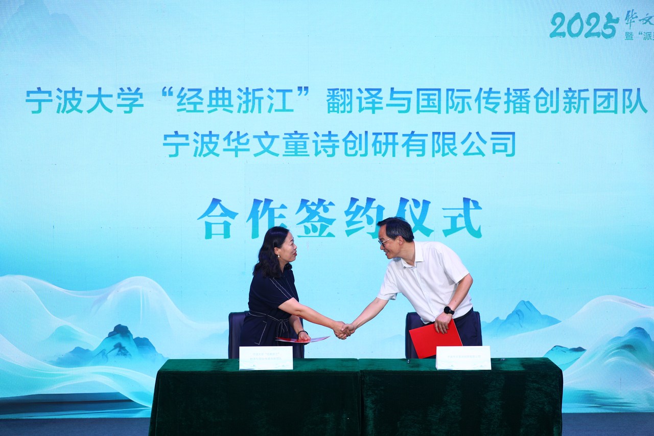 在主题对谈环节中,宁波大学外国语学院博士生导师辛红娟、澳门教业中学校长贺诚、马来西亚儿童文学作家刘雅琳博士及中国著名儿童诗人雪野围绕“人工智能时代的华文童诗教育及国际传播”展开深入探讨。“华文童诗不仅是儿童文学的重要组成部分,更是中华文化走向世界的重要载体。”辛红娟表示。主题对谈后,还举行了宁波华文童诗创研有限公司、经典浙江翻译与国际传播创新团队合作签约仪式,计划推出多语种童诗选集,让华文童声传向更广阔的世界。