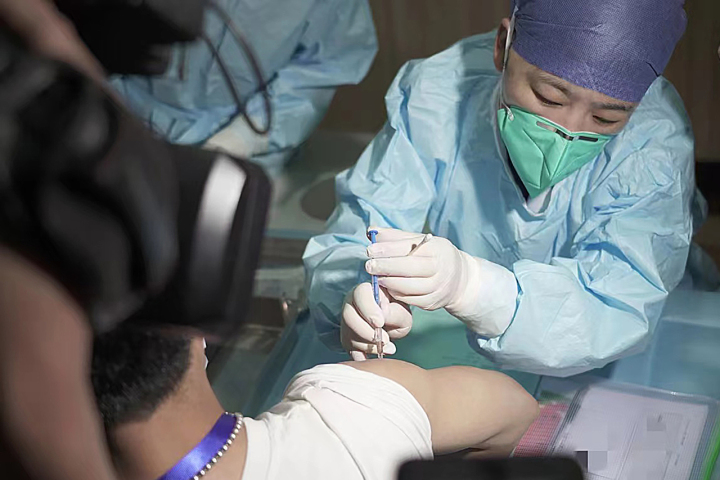 5月1日,一名临床试验志愿者在杭州注射奥密克戎变异株新冠病毒灭活疫苗。 图源新华社