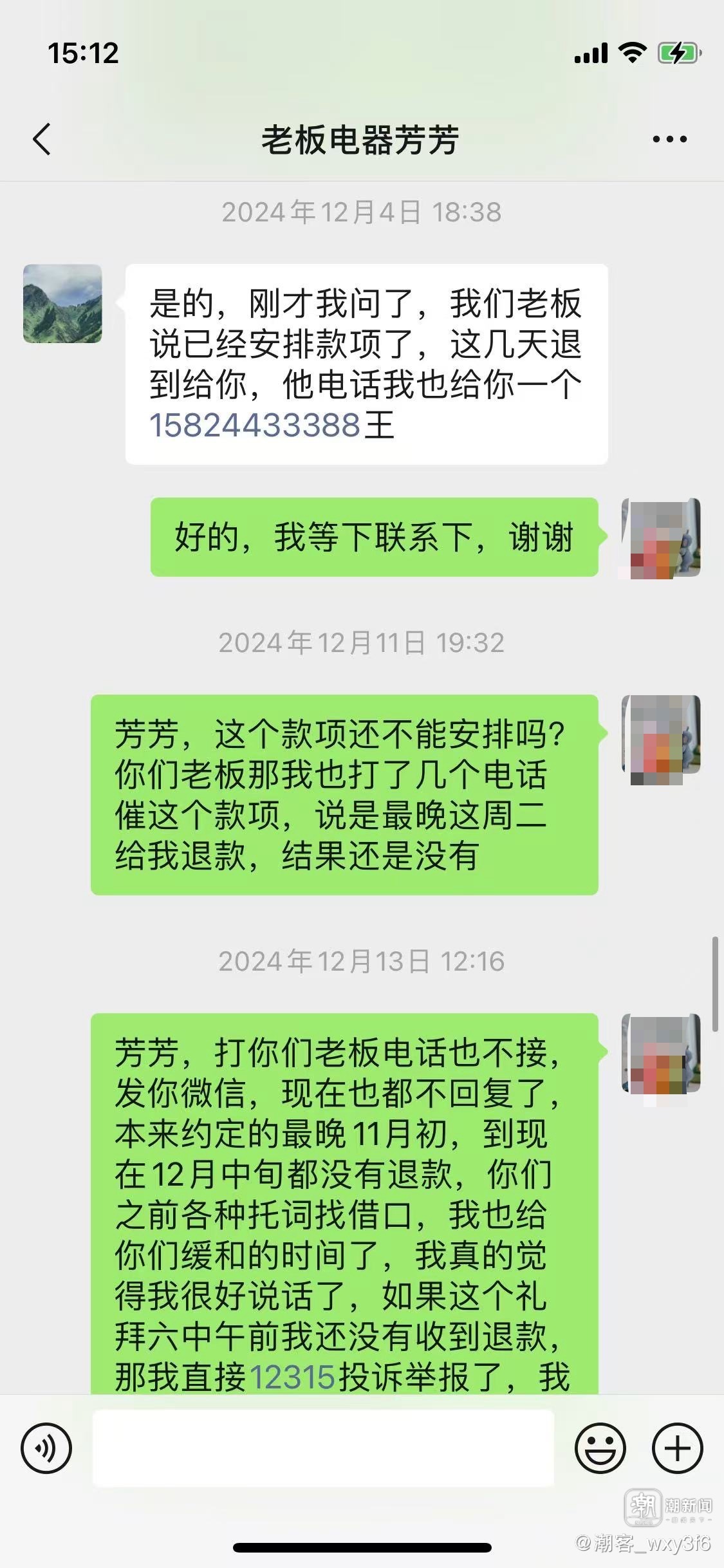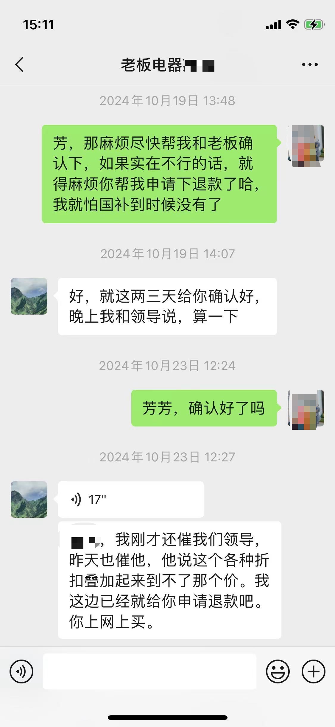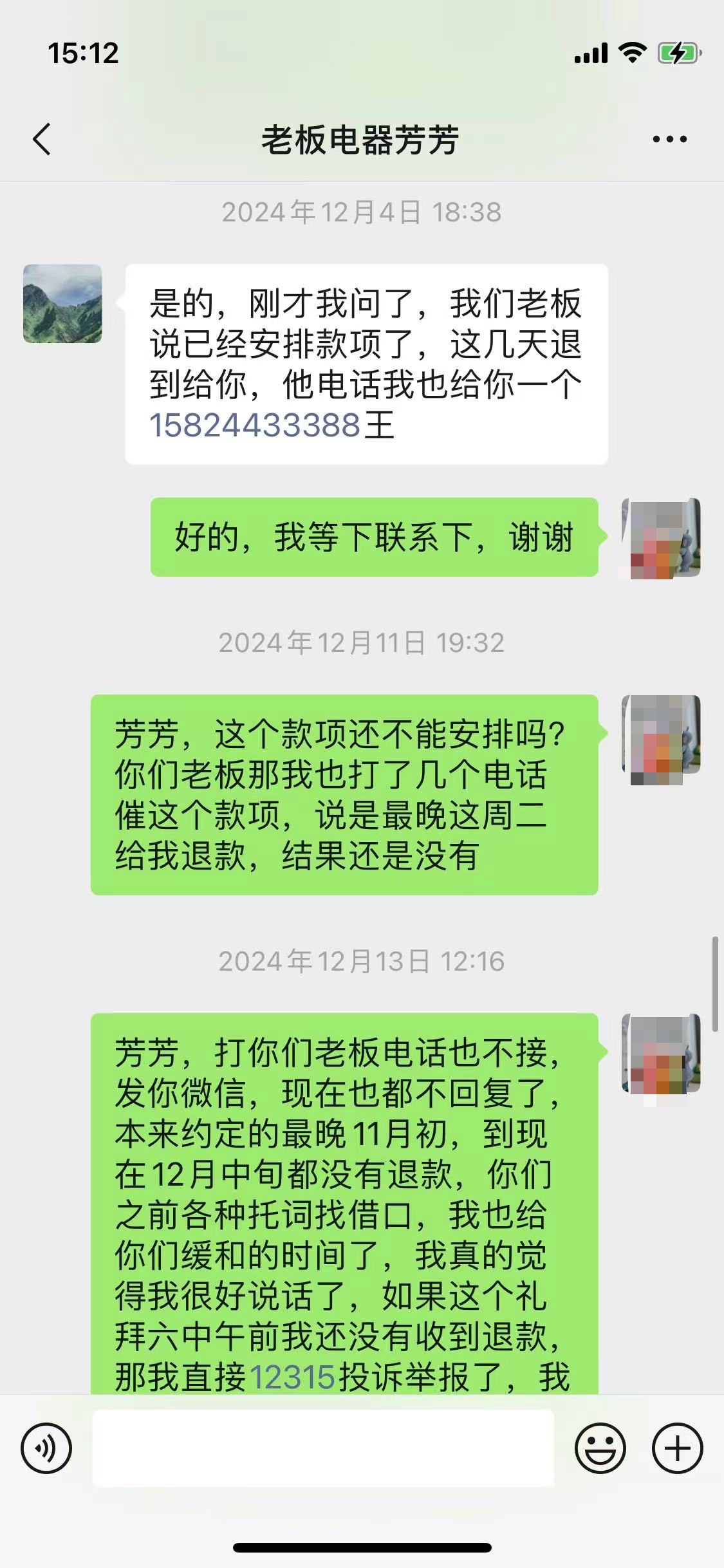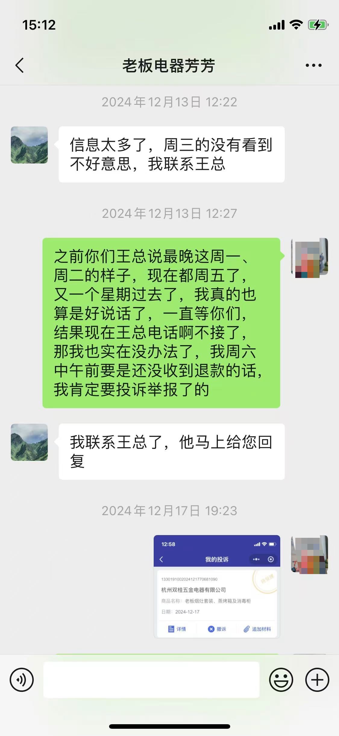 2024年6月9日,本人于杭州市钱塘区恒大建材市场C馆老板电器门店购买烟灶、消毒柜、蒸烤箱,共支付13160元。后因国补政策推行,因上述产品市场价下浮较大,经与门店协商,承诺最晚将于11月初全额退还货款。但之后,门店老板跑路失联,时至今日,未退还任何货款。