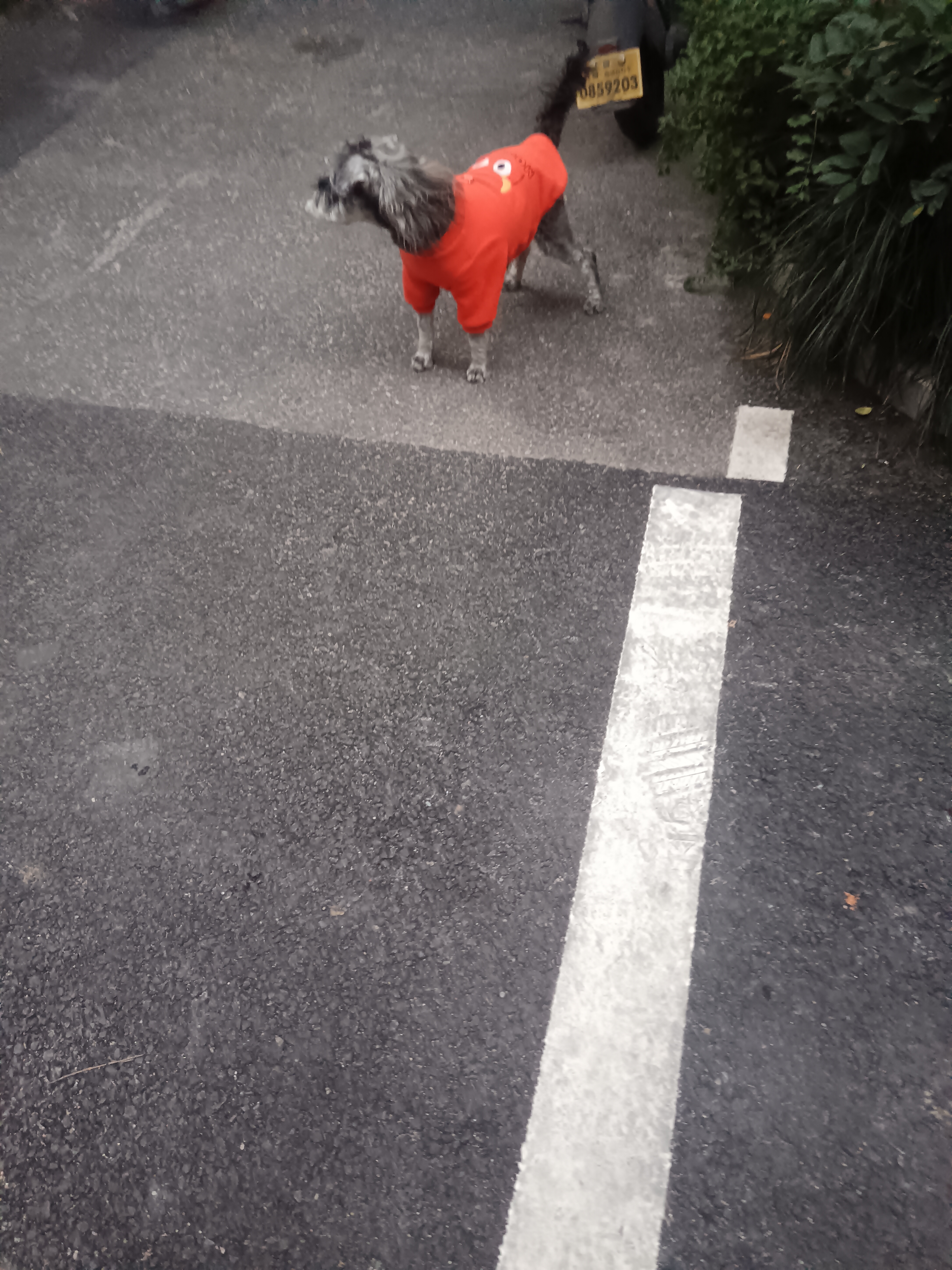 小狗穿红衣遛弯,卡在停车线瞅车牌,绿植灰地配一脸,今日份萌犬街拍get!