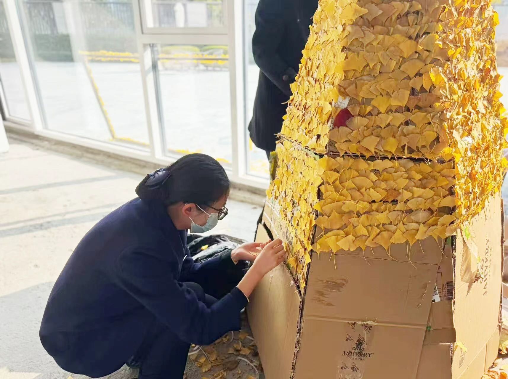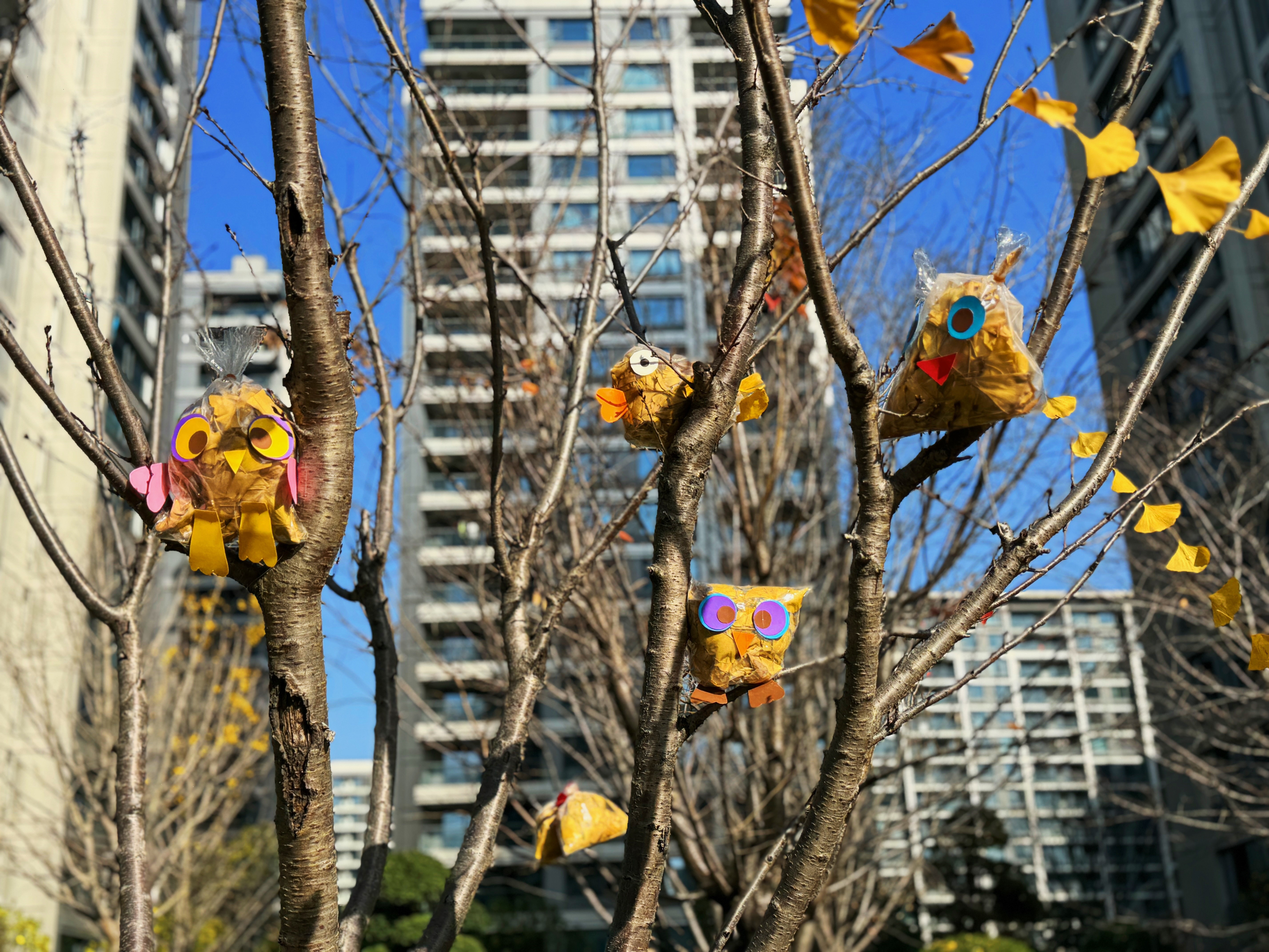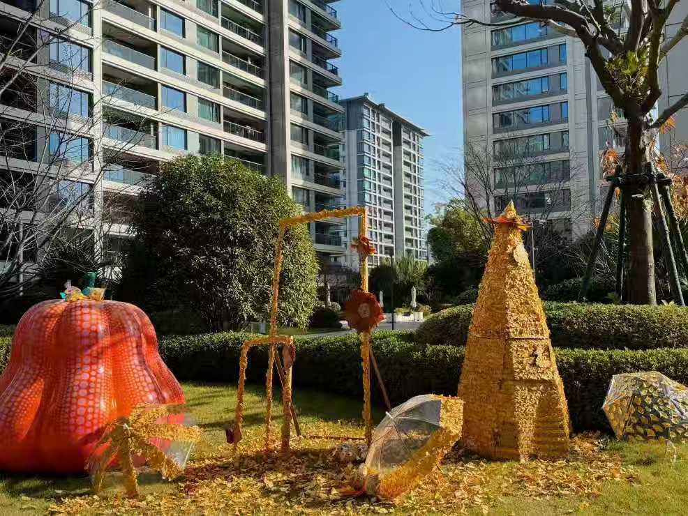 银杏叶还能这么玩!杭州一小区留住了“秋天” 眼下杭州已经入冬,但是在上城区的栖江揽月轩,整个小区还洋溢着浓浓的秋意,各种各样由金黄色的银杏叶做成的艺术小品,点缀在园区的各个角落—— 憨态可掬的“银杏猫头鹰”停驻在枝头; 乖萌可爱的“银杏小鸡”在草坪上探头探脑; 雅致的“银杏画框”把风景和人一起定格; 盛满落叶的银杏伞撑起一隅秋光; 还有一串串风铃般的“银杏叶串”摇曳在风中…… 据悉,这些银杏叶艺术小品,都是小区物业服务中心的工作人员创作的。入冬前,小区里的银杏叶铺了满地金黄,在打扫它们的时候,物业服务中心突发奇思妙想:何不将这秋日限定之美,化为邻里间可共赏、可共情的记忆? 于是,物业工作人员将这些银杏叶都收集起来,经过筛选后,以巧手与匠心制作了这一系列可爱的秋日小品,把季节的馈赠融入了业主们每日归家的风景中。 最先发现变化的是孩子们,他们围着作品雀跃,细细观察,并兴奋地收集落叶尝试自己创作。年轻父母们在记录的同时,也加入互动的队伍。更有老人感慨:“住过这么多小区,第一次看到物业把秋天‘留’下来的。” 这份用心的创意,成为孩子们的一次“美学实践”,也让邻里间多了交流的话题。