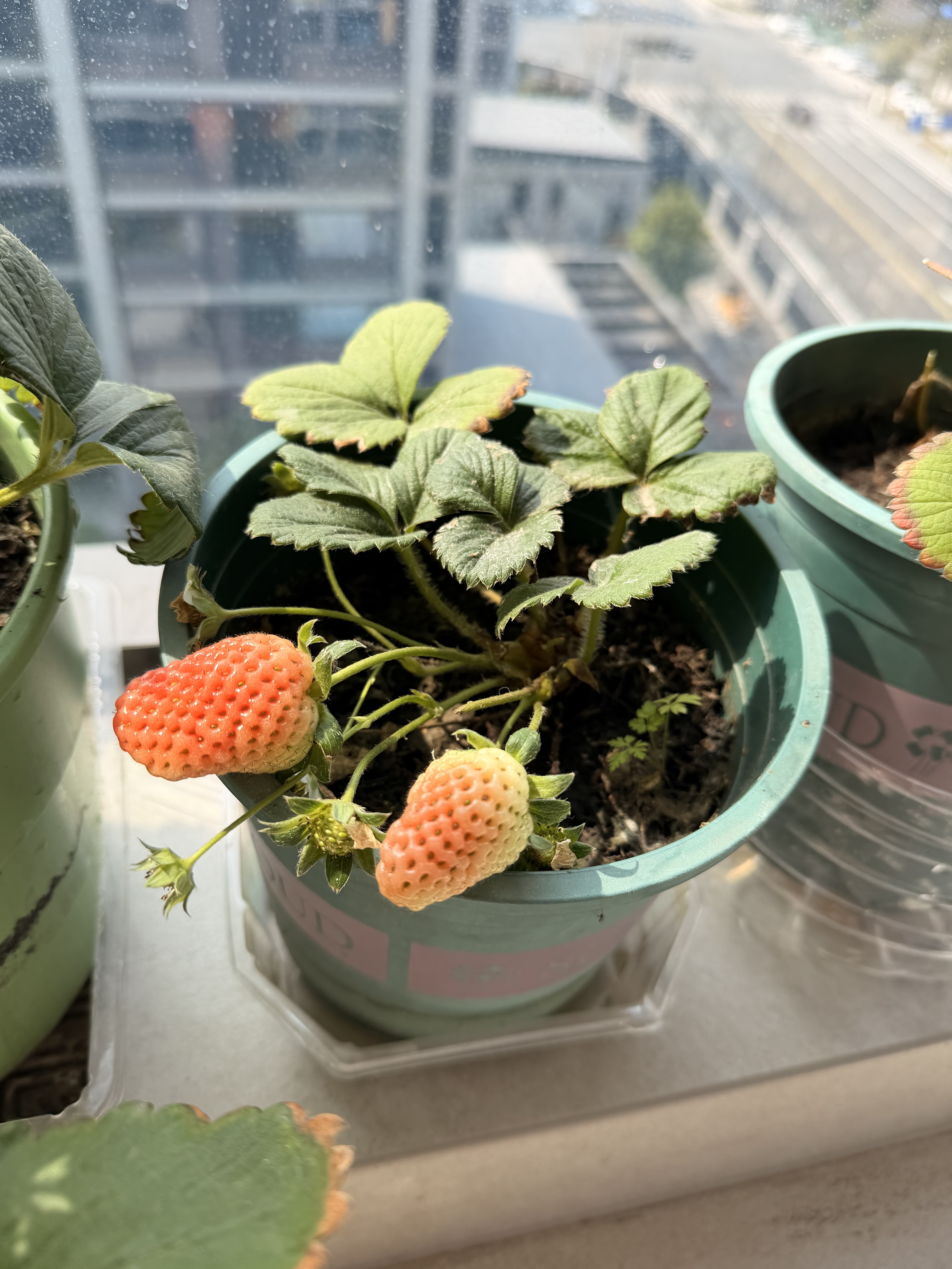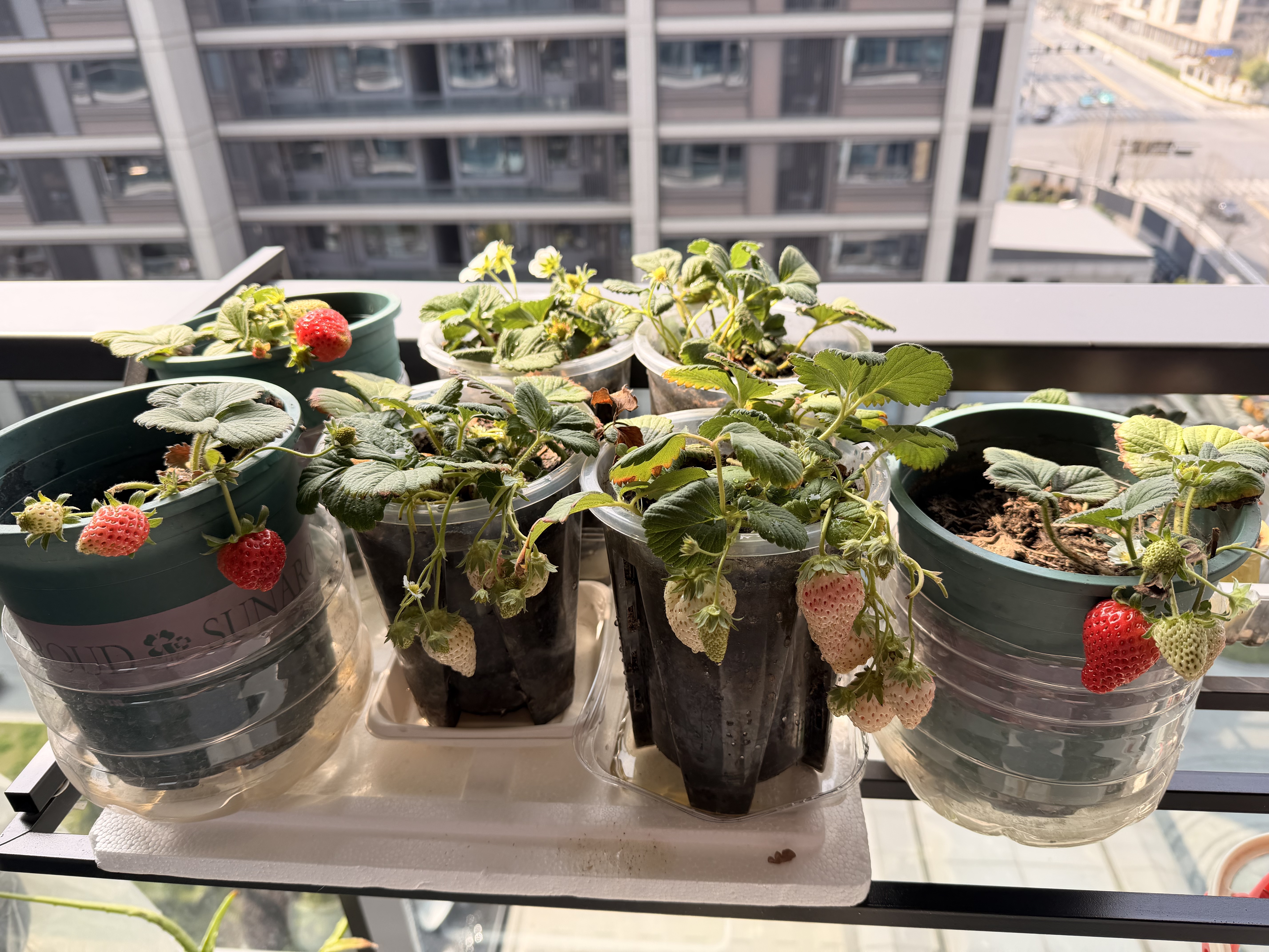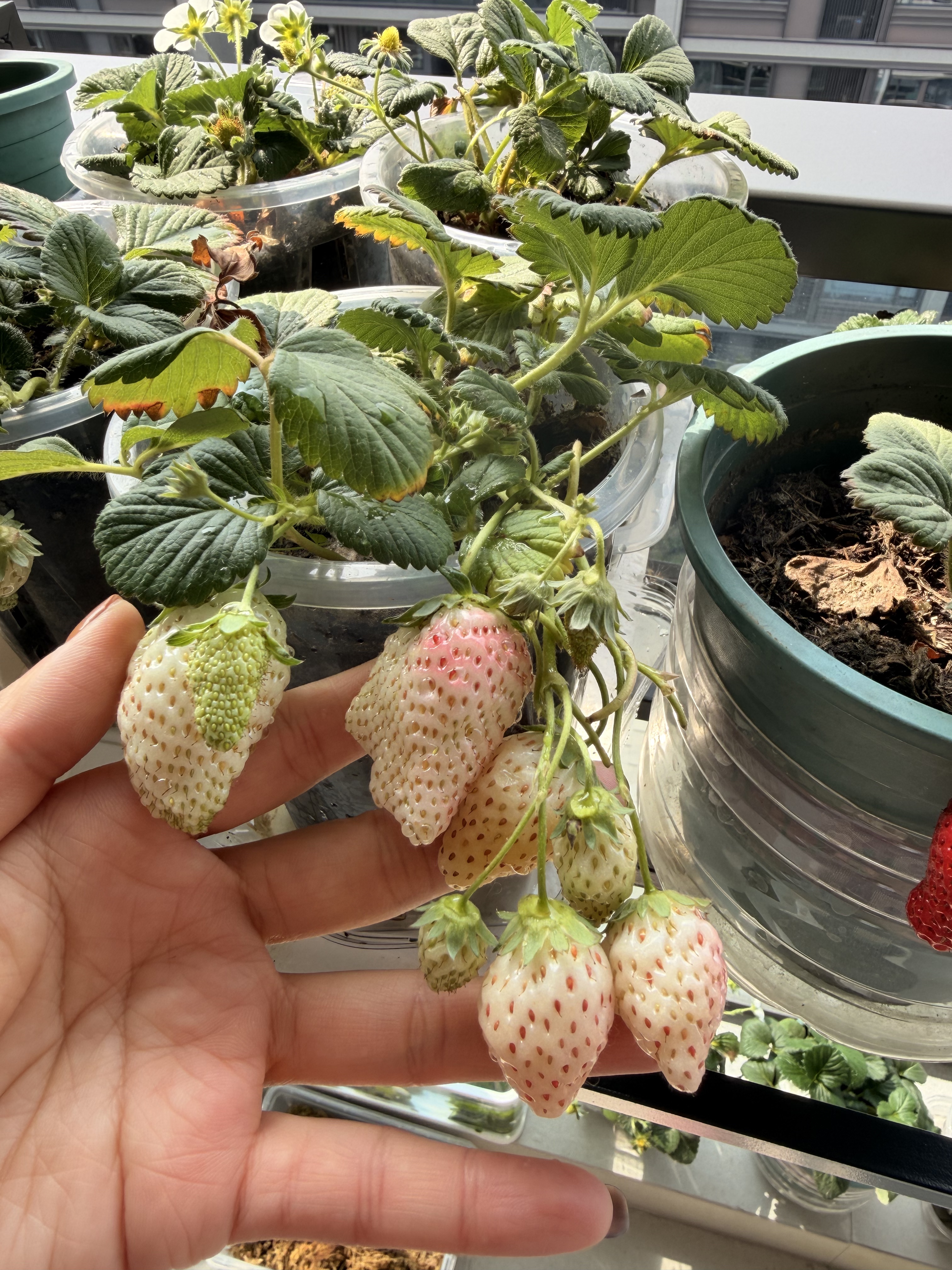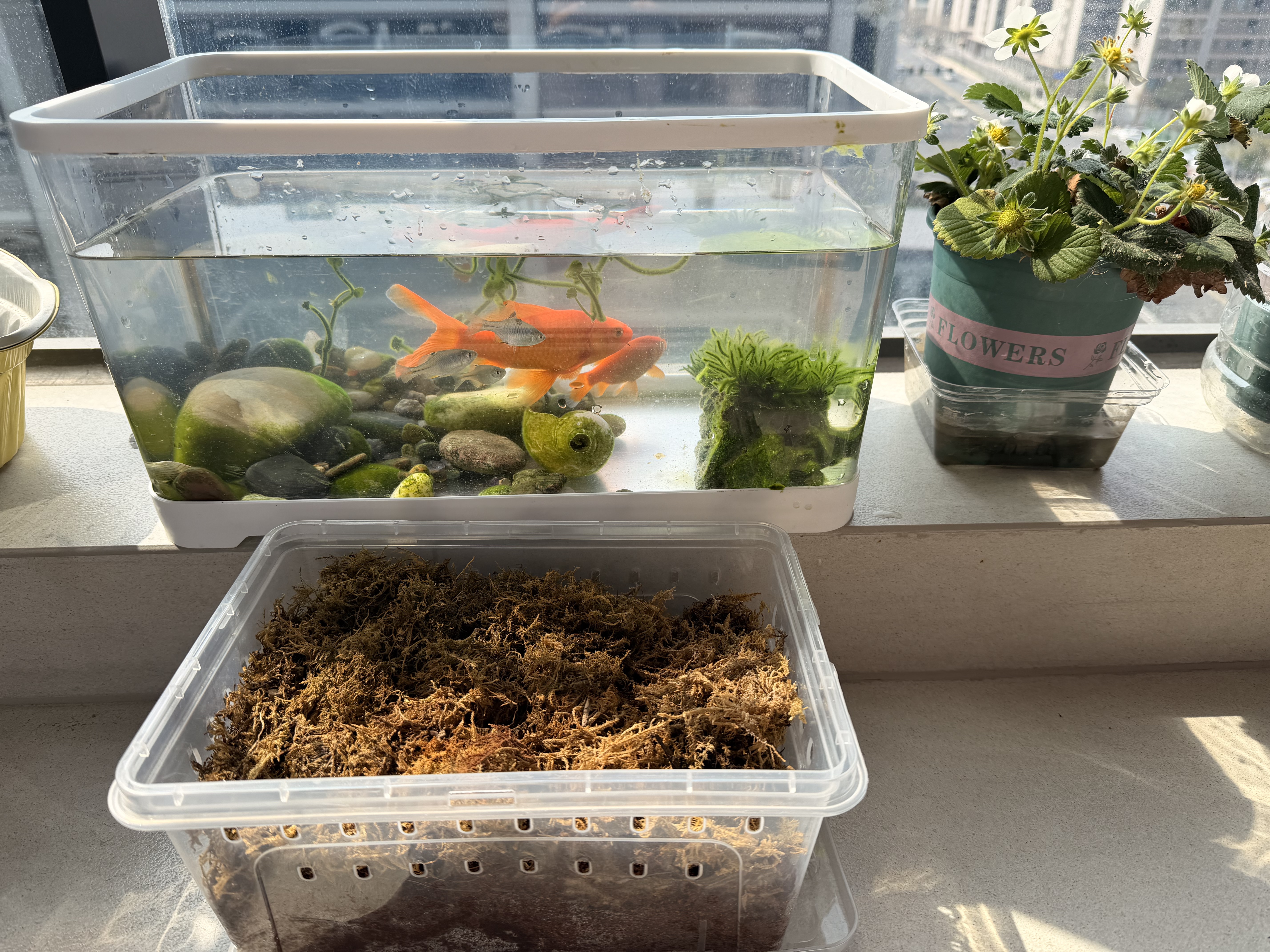 女儿的草莓园,想吃就摘一颗,还有金鱼跟乌龟(还在冬眠),家中最有爱的角落~
