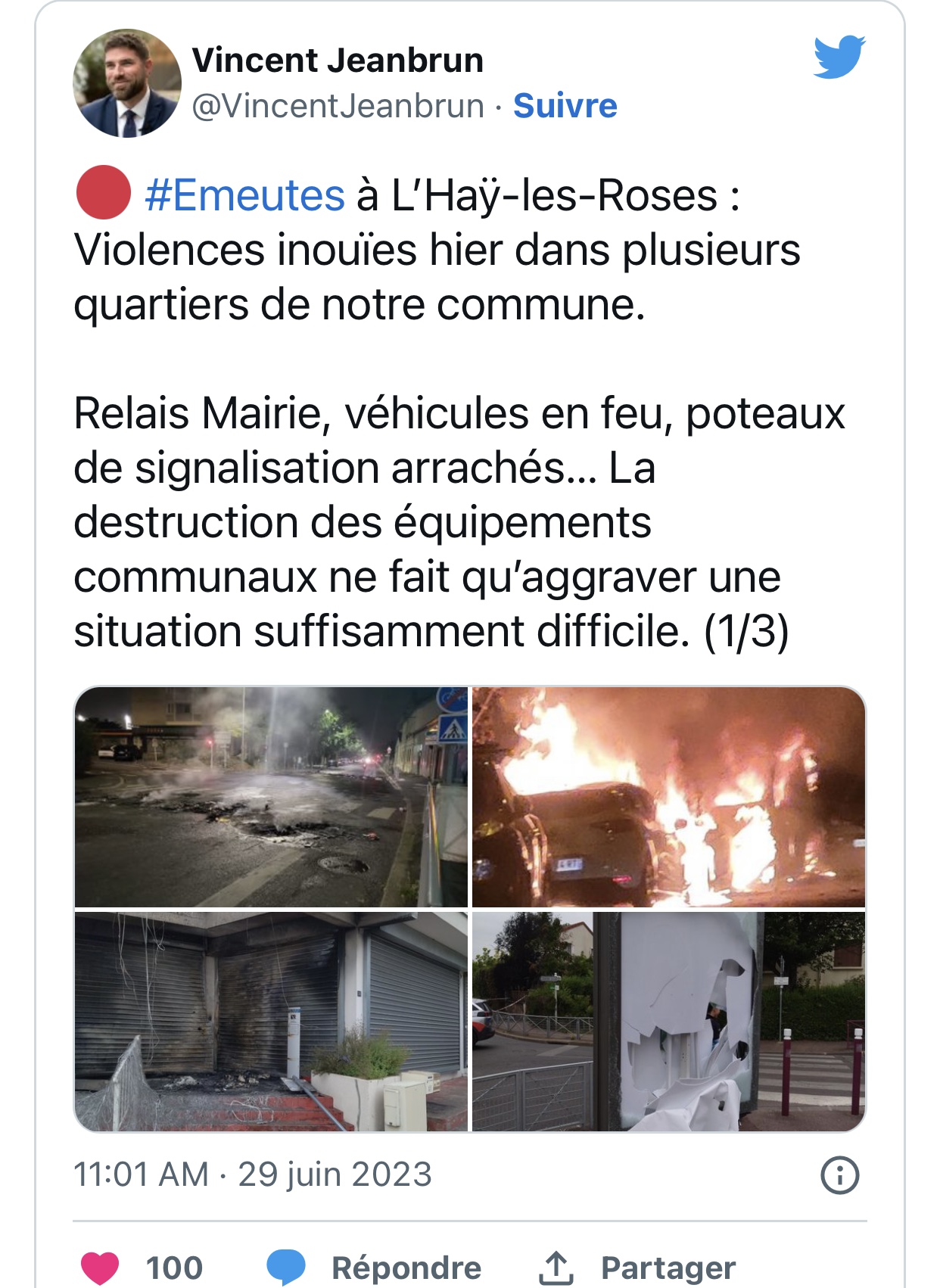 为什么法国市长会成为暴徒攻击的目标?(巴黎海芬日记第974篇) 2023年7月3日星期一 巴黎晴朗宁静 最新信息:法国大小城市的市长今天中午聚集在各自的市政府前,呼吁市民支持。 法媒说:7 月 4 日星期二,马克龙总统邀请了220 个受到暴力损害城镇的市长到爱丽舍宫来,以表明国家不会抛弃他们。 这一次,为啥为什么法国市长会成为暴徒攻击的目标? 法媒说:自上周二年轻的纳赫尔死亡后,法国每天晚上都会爆发骚乱,许多市长都成了目标。 在法国,市长都是民选的,市长长期以来也被视为 "最接近法国人民 "的政治人物,为啥这次都程了目标? 法媒说:这一事件标志着暴力事件跨越了一个新的门槛,并引发了政治阶层的一致反应。周六晚上,Les Républicains(LR)的l'Haÿ-les-Roses镇(Val-de-Marne)镇长Vincent Jeanbrun的家被一辆汽车袭击。他的妻子和两个年幼的孩子在家,其中的一个孩子受伤。该市长谴责这是一起无以描述的懦弱的暗杀企图。 但是他不是单独的案例:他的许多同行也成为了暴力的目标:蓬图瓦兹(Pontoise)、萨努瓦(Val-d'Oise)、沙勒维尔-梅齐耶(Charleville-Mézières)(阿登省)、圣皮埃尔-德科普斯(Saint-Pierre-des-Corps)(安德尔省)还是夏利(罗讷省)都发生了类似的事件。 这些原本应该是"最接近法国人民的政治家","以前骚乱者、叛乱者是攻击市政厅,而现在他们直接攻击市长,攻击他们的随行人员,攻击他们的家人……为什么?" 法媒分析说:"一些暴乱者将市长视为一种权威或共和国的象征,他们再也无法忍受"。 La Riche(Indre-et-Loire)的市长Philippe Ferreira-Pousos则认为:"这是一个释放暴力和侵略的借口,在我看来,这与这个非常悲惨的事件没有直接联系。“ 上周日,这位市长的汽车被骚乱者放火烧毁。 周二,法国总统马克龙将在爱丽舍宫接见220多位市长--他们都是受暴乱影响的城市的负责人。 在此之前,法国市长协会(AMF--法国市长协会)已经呼吁公众周一在法国各地的市政厅外集会,恳求 "公民和平"。(来源: https://www.bfmtv.com/politique/l-hay-les-roses-pontoise-charly-pourquoi-la-figure-du-maire-est-dans-le-viseur-des-emeutiers_AV-202307030294.html)