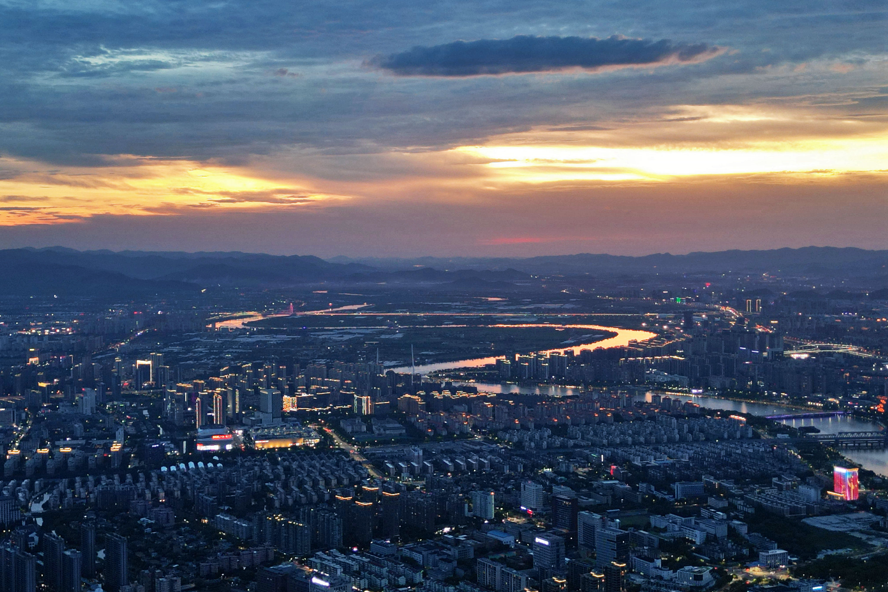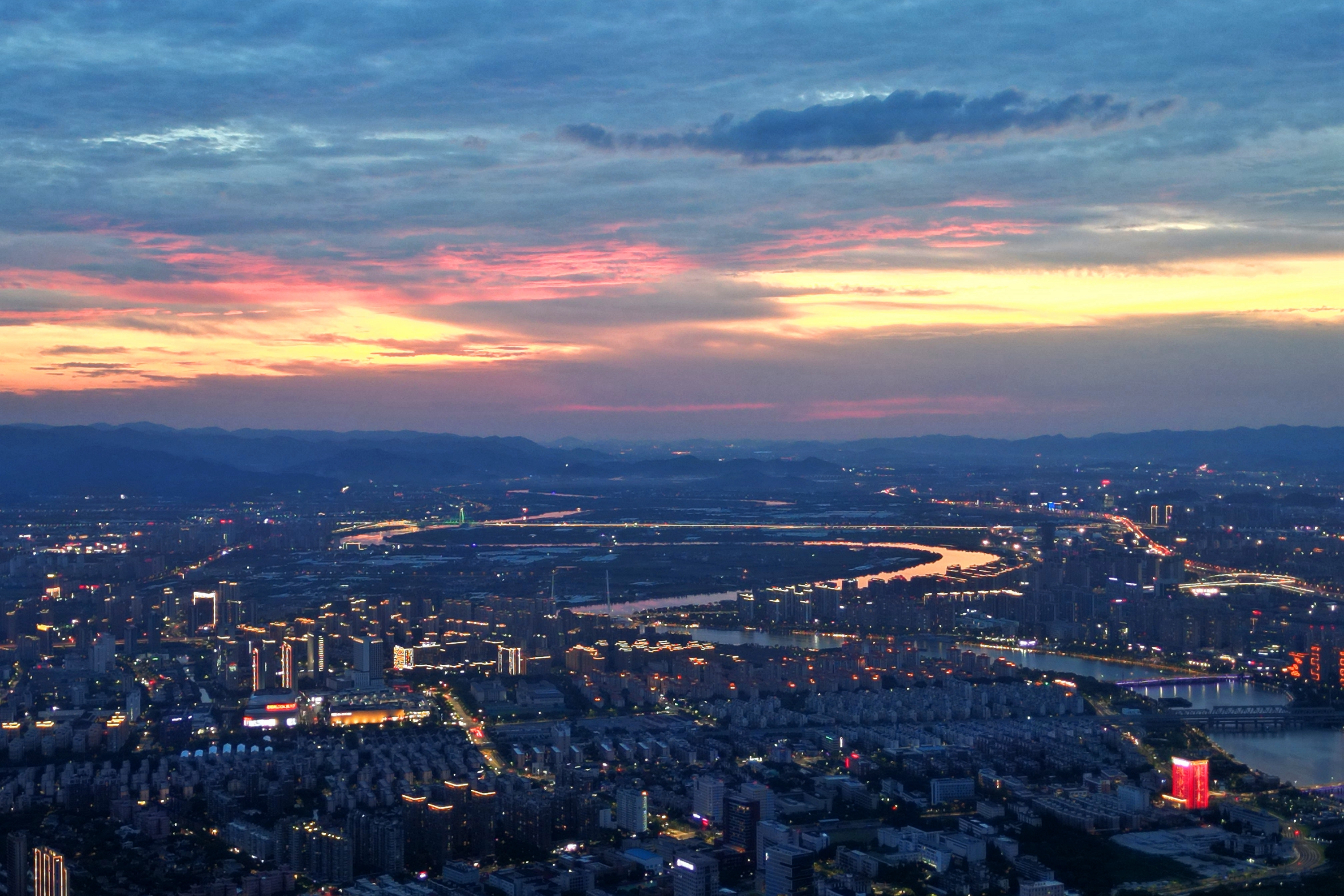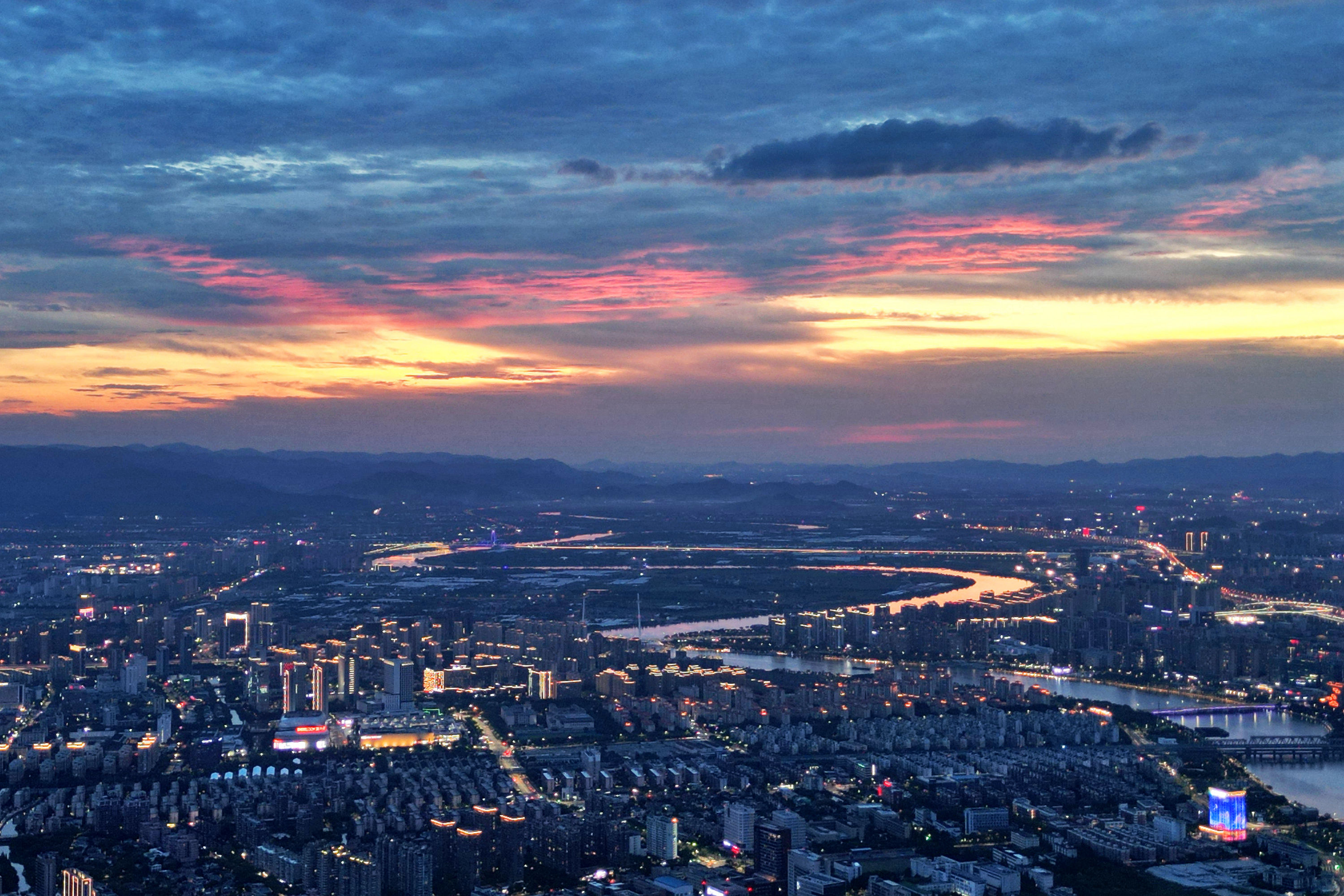 《云飞霞红,金龙卧姚江》近来,甬城“高炎值”天气活跃,热情似火,天空亦变得丰富多彩,或蓝天碧空,或大朵云彩,或电闪雷鸣,太阳还不时戴上光环。昨天傍晚时分,绚丽晚霞中火烧云站到了C位,将姚江渲染得金黄,宛如一条金龙静卧四明大地。