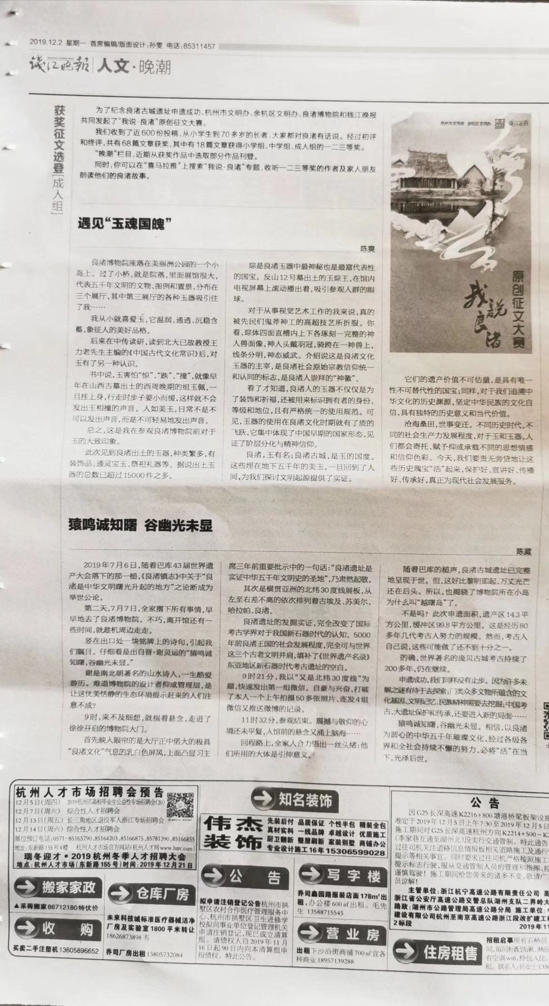 “琮琮”引出那年的故事 “琮琮”代表世界遗产良渚古城遗址,起名源于出土的代表性文物玉琮,头部装饰取自良渚文化标志性#好摄之友#符号“饕餮纹”(见图5),寓意不畏艰险,超越自我。 日月如梭。四年前的7月6日,良渚申遗成功,第二天即7月7日,我们全家一早去了良渚博物院参观。随后巧遇杭州市文明办、钱江晚报等几家联合举办有奖征文大赛,爽姐与我相约报名参赛。 结果公布:爽姐拿到惟一的一等奖,我紧随其后获二等奖。那年除奖金、证书、“喜马拉雅”朗读我们的良渚故事外,12月2日钱江晚报“晚潮”一整版,刊登陈家获奖作品。 “琮琮”实证了中华五千年的文明史。以其源自大地、象征丰收的金黄色与瞩目的“饕餮纹”元素,带给我们生命的张力和生活的美好。 相信以独特魅力亮相家门口亚运的“琮琮”,将不断带给你我好运!