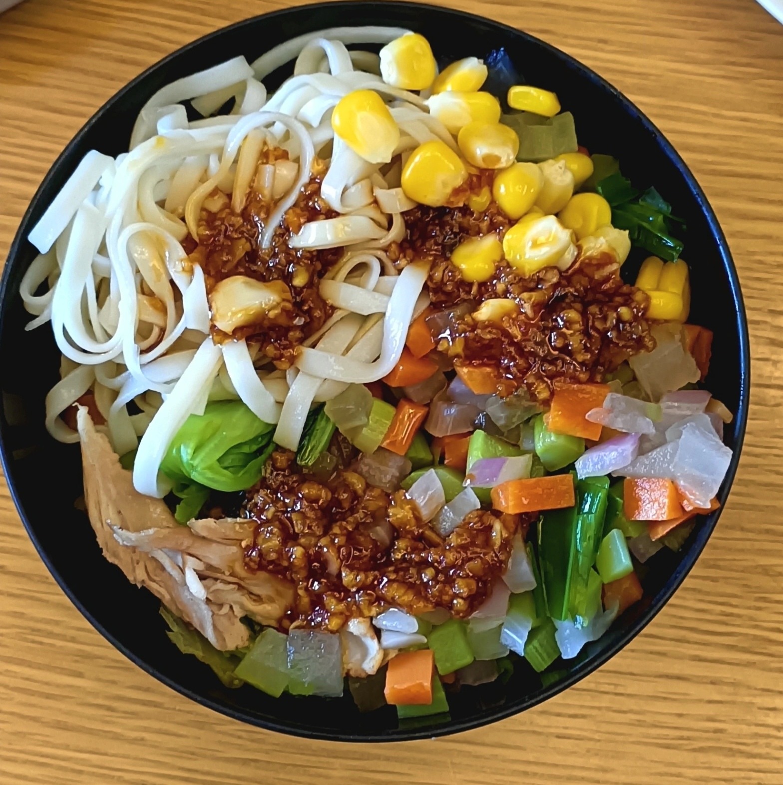 凉拌素面: 玉米粒、 胡萝卜丁、 冬瓜切丁、 莴苣切丁、 洋葱切丁、 生菜三片、 腐竹一根,开水里烫熟; 蒜泥、红椒、姜丝、五香粉吃热油爆炒后加入生抽、麻油,放凉后加入调味醋; 宽面二两煮熟,凉开水冲两遍。 凉拌素面就最好了。