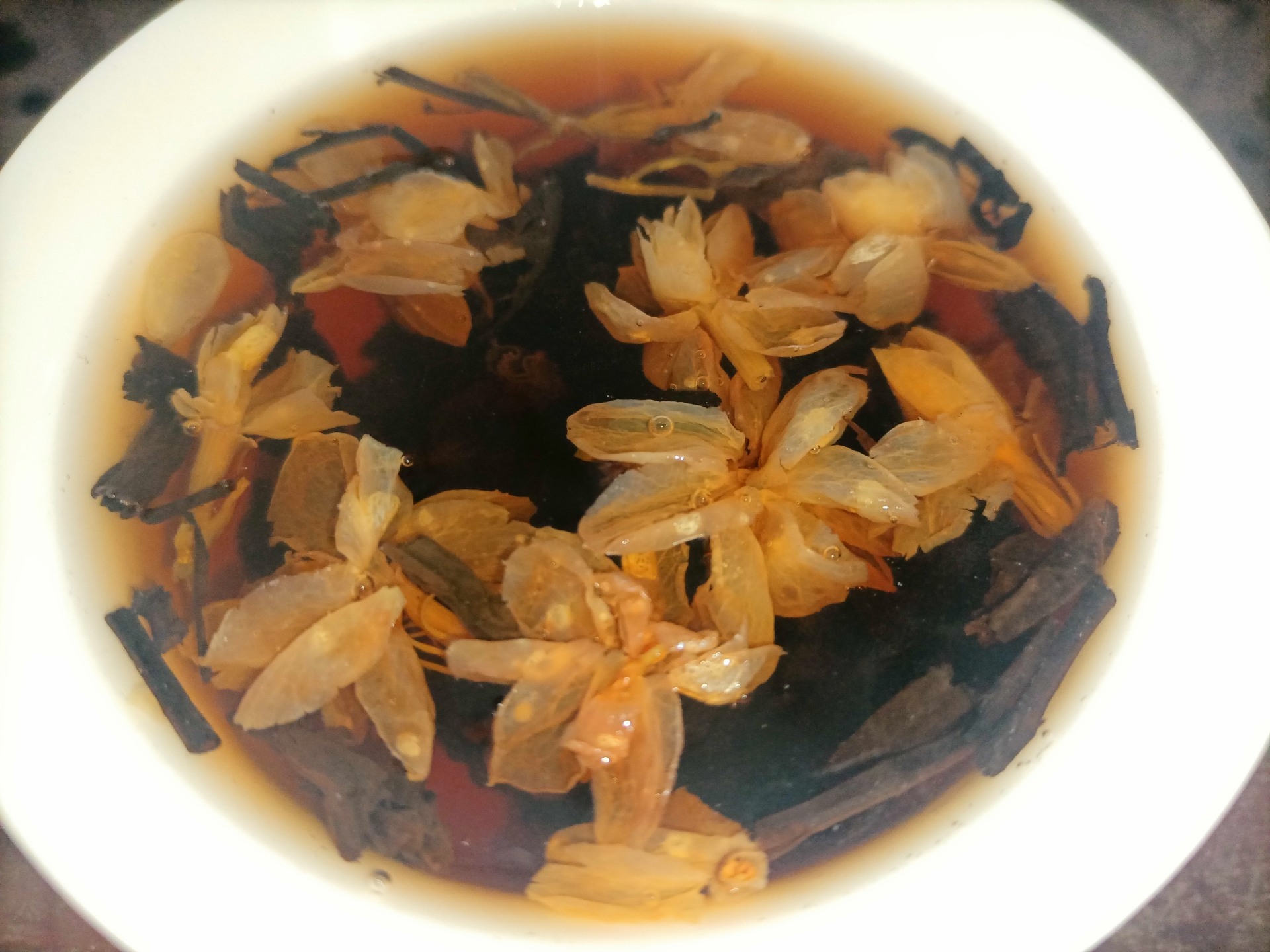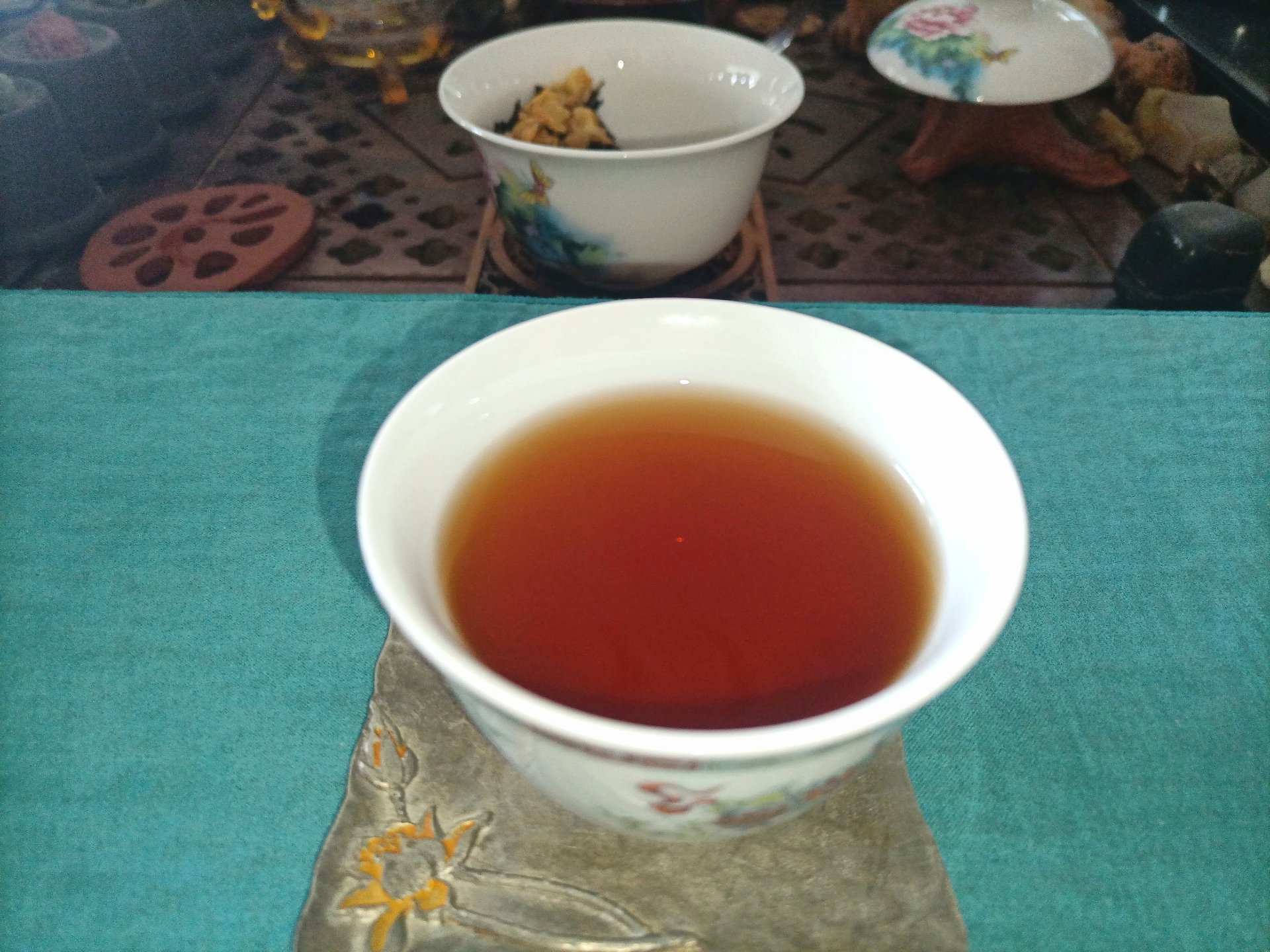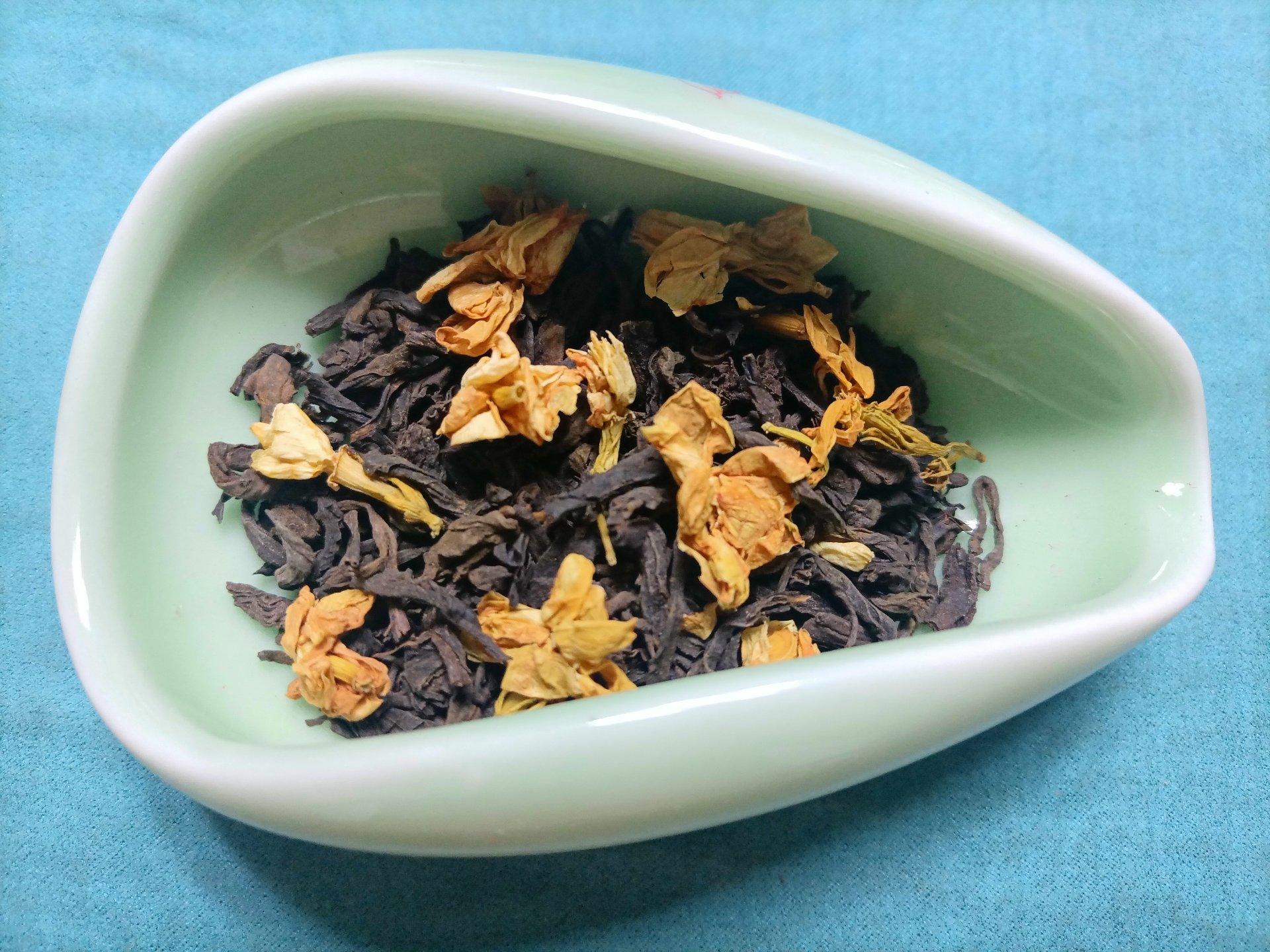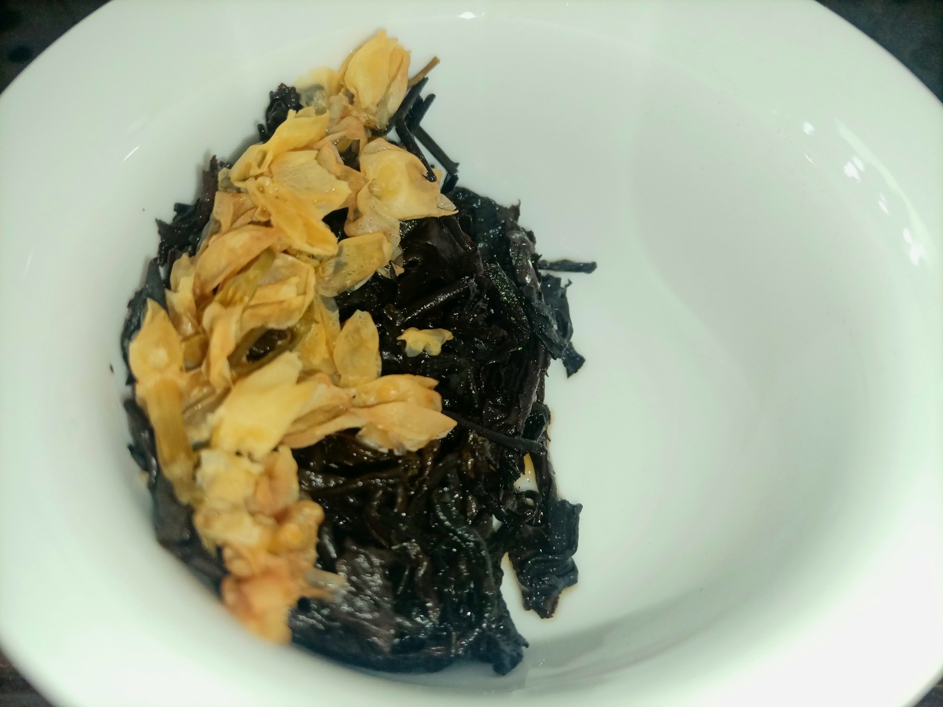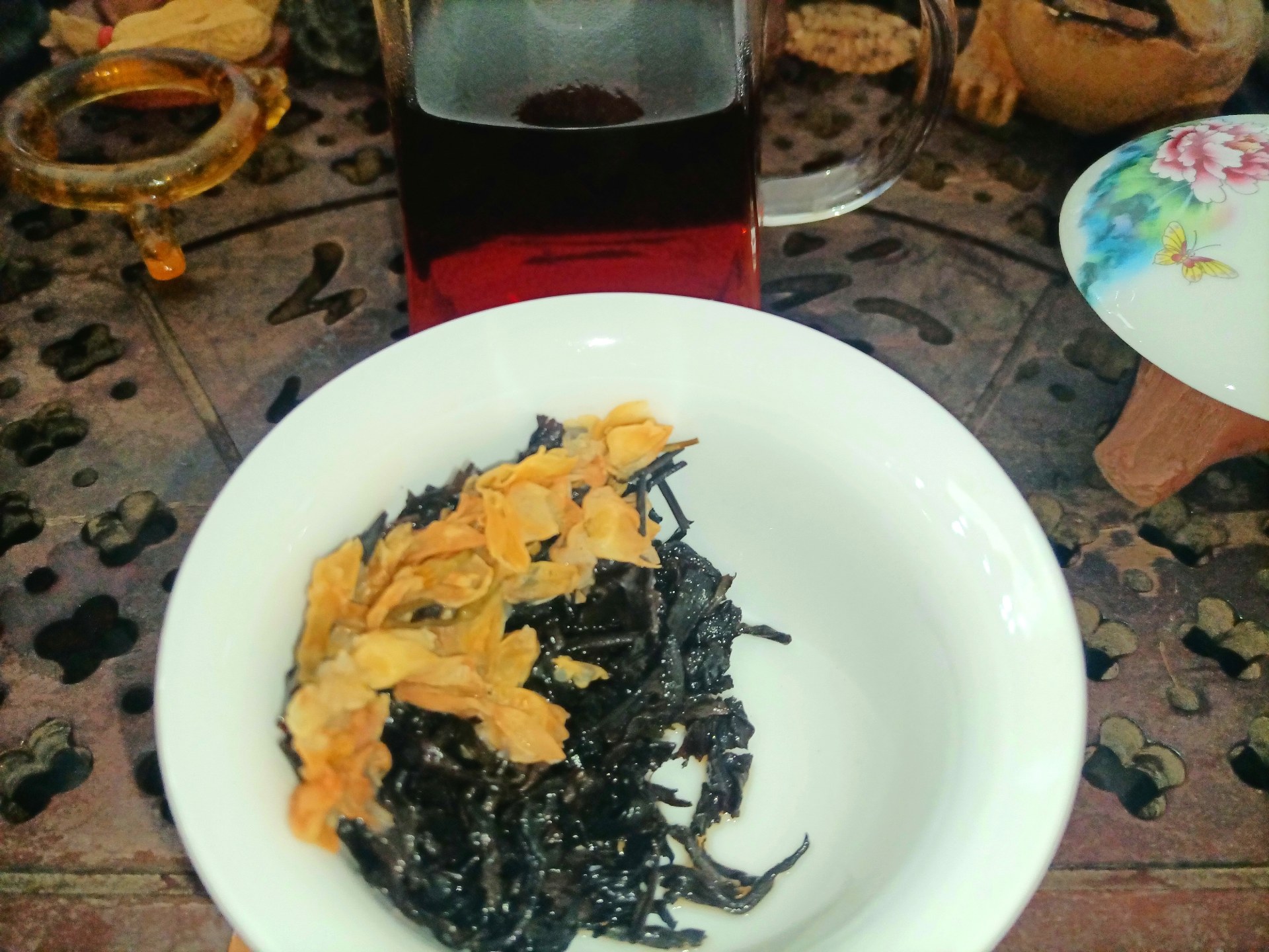 《品鉴茉莉花普洱茶》 作者:子乐 今天特别品鉴一款去年收藏的新款老茶,其实准备品鉴这款茶已有一周有余,近来断断续续的忙碌着,也没有再喝过茶,品茶还是得认真正式来品,得花时间用心去品,才不辜负大自然馈赠的人间美味。其实在过去以往,每次品鉴茶也都是如此,有准备,正式泡,用心品,享美味,即福乐。 说起茶龄,自己从小就开始尝试着喝茶了,源于爷爷早晨常喝的罐罐茶,麦草生火,木棍棍挑上茶罐罐,凉水烧开放上茶再烧开,或是直接凉水泡茶然后烧开,滚动的沸水沸腾一会,然后倒出茶汤,趁热喝上一口,虽然每次都是品尝那么一点,已然也算得上是美味了。也不曾记得具体什么时候开始喜欢上了茶,居然还有些上瘾。特别是在冬天,经常去爷爷那喝茶,得起个大早,去晚了就没茶喝了,那时候喝的最多的应该就是最早那时候流行的茉莉花茶了。记得有次逃学,在一个大雪纷飞的早上,大半道上峰回路转,专门跑到爷爷那喝茶去了。窗外全被大雪覆盖了,爷孙俩围着小火堆,烤着手,喝着烧烫烧烫的罐罐茶,不是围炉煮茶那般惬意,但也绝对算得上是一种享受了! 喝茶人即懂。 相信很多人的儿时记忆里,都有一杯香气四溢的茉莉花茶的味道。最早的茉莉花茶是用绿茶为茶胚与茉莉鲜花一起窨制的,近几年市面上出现了用普洱茶和茉莉鲜花一起窨制的,被称为茉莉普洱,其实也是茉莉花茶的滋味,花香茶香交织。今天品鉴的这款茶,正是茉莉花普洱茶,原料为2011年的景迈古树熟茶,生产于2019年,至今可谓算得上是真正的老茶了。 话说长了,回到正题,品茶正式开始。 烧水温杯,盖碗95度水温、投茶量5克左右。不需润茶,浸泡5秒左右,过滤于公道杯中。 从汤色上看,这款茉莉普洱熟茶的汤色红浓透亮,十多年清透感古树茉莉花茶汤色澄净,久违的老茶汤,普洱熟茶的正经本色。 这款茶的香气比较淡和清幽,需要细细体味,与干茶状态相比,冲泡后茶汤中所含香气低。这款古树熟普茉莉花茶与干茶阶段的香气相似,茉莉花香高扬,久泡之后茶香显著,水中含香,需要静下心来细细地品酌。 这款茶的滋味,在初次入口时味淡,较为甘甜,有涩感。久泡之后,苦涩感变淡,有普洱茶之味,汤感较为丰富饱满,回甘生津快。茶汤凉后这一口感更为明显,品饮后涩感很快就化掉,转为回甘生津,适口性较好。 再看叶底,除了在上层的茉莉花,这款茶的叶底较碎,很难挑出完整的叶片,但芽、叶、嫩梗均有(古树茶的采摘标准即如此)。曾经雪白的茉莉花变得久违的陈黄,偶尔也有些白,整体黑黄白相间,和谐包容,格外显现出一款老茶的好品质,叶片厚实和柔韧,叶底弹性较好,乌黑油润发亮,且非常耐看,可谓十年普洱配茉莉飘香,这也可以称得上是那传说中的黑乌金了。 整体来说,这款茉莉花普洱适口性较好,后劲中带有茶香,柔和、甘甜,汤感浓郁厚重,喜欢喝熟茶的朋友可以选择这款茶,综合性价比高,非常值得品鉴和收藏。在以后还会陆续实测,亲身品鉴一些茶品新品,希望能为喜爱茶的朋友带来帮助,特别是大家在选购茶和喝茶时可以多多交流。当然喜欢茶的懂茶的朋友也可来约茶,大家一起共品佳茗,同享人间美味。独乐乐亦或众乐乐,何不快哉!(文图/子乐)
