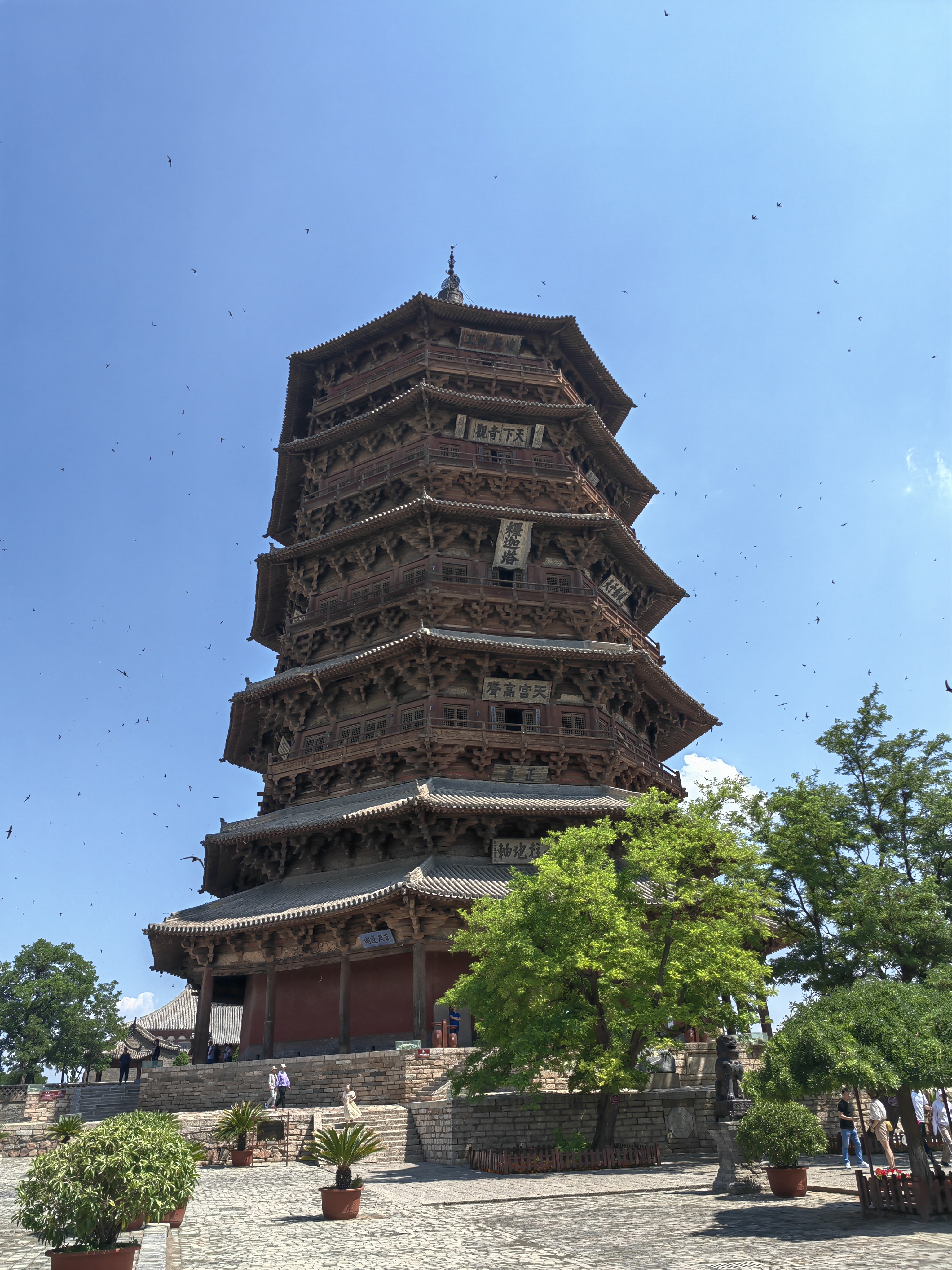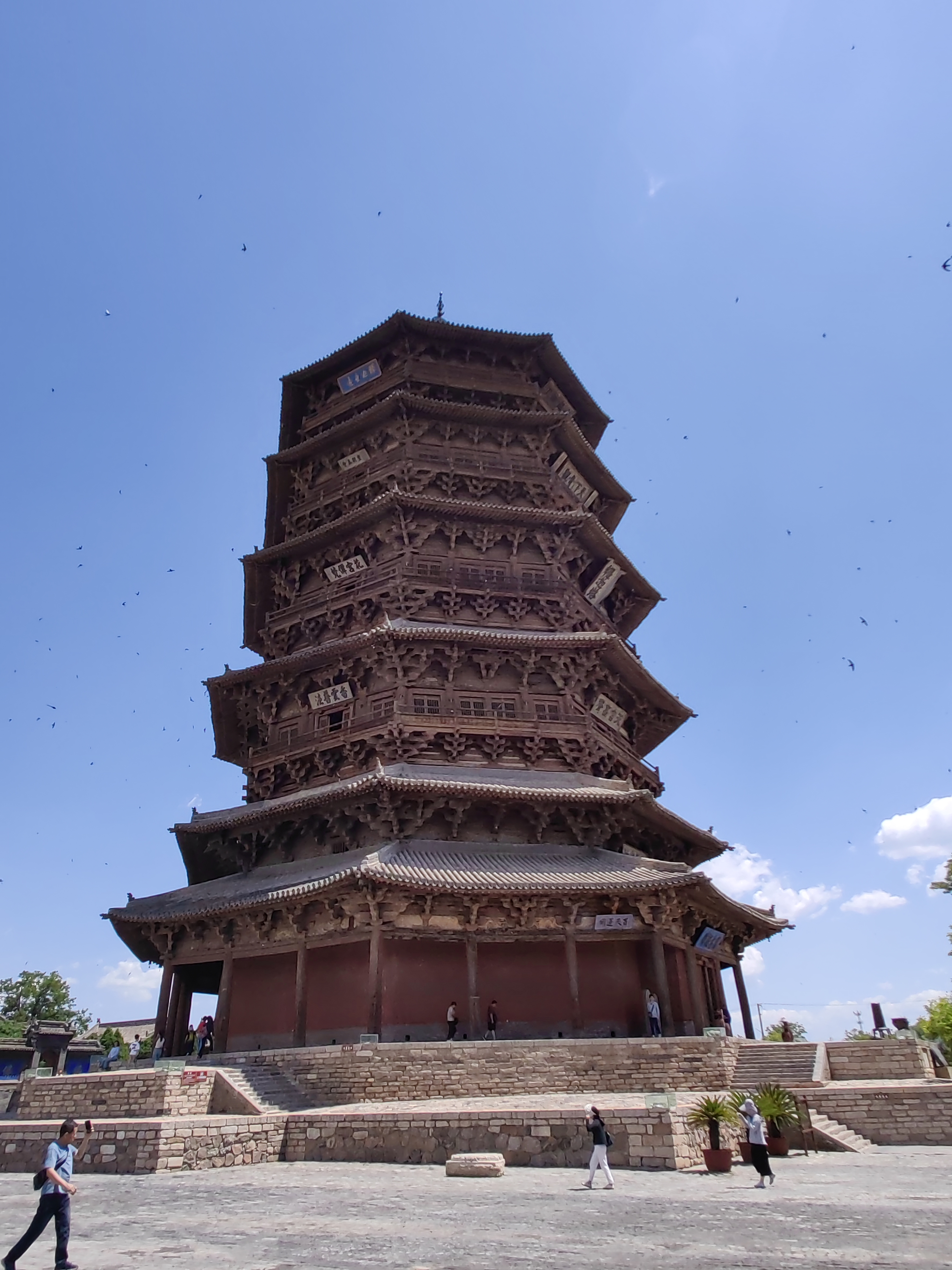 到代州去(四)应县木塔 黄岚2023.7.22 我计划去时搜代县周边景点时,发现“应县木塔”非常有名。应县是个非常古老的地名。在商代时有个古应国,就在今山西朔州应县此处。传说古应国起源于黄帝时期的应龙氏部落,这个部落助黄帝打败蚩尤氏之后,定居山西,与商朝往来密切。至周武王灭商之际,已有2000多年历史的古应国也随之被灭,其子民迁至河南平顶山一带定居。后周武王封其子应叔于平顶山一带建立的应国,以鹰为族徽,子孙以国为姓。至东周时被灭,立国约430余年。 应县,地处桑干河中游,大同盆地南端,南部的恒山山脉,是桑干河与滹沱河的分水岭。唐朝末年,晋王李克用(应县人)在应地筑金城县城。后唐时,以金城县置应州。至民国时应州改名为应县。 我们慕名前来参观的应县木塔,是辽代时辽兴宗皇后萧挞里(?-1076年)所建。萧挞里,应县人,辽兴宗耶律宗真(1016-1055)皇后,辽道宗耶律洪基(1032-1101)的母亲。她所在家族有“三王三后”,她是其中一后。她的姑姑萧耨斤(?-1058年),是辽圣宗耶律隆绪(972-1031)的元妃,辽兴宗生母,长相不佳,为人却狠辣,在圣宗驾崩其子兴宗继位后,自立为皇太后,逼死圣宗皇后萧菩萨哥,干预政事,后要废长子兴宗立幼子时被兴宗囚禁,上演了一段不作死不休的剧本。萧耨斤还有个侄女就是萧观音,为道宗皇后。这三位皇后就是应县人,千年木塔的供养人。我们戏曲或小说中常听到和宋朝打仗的那位萧太后,是指萧绰(953-1009),即萧燕燕,辽景宗耶律贤(948-982)皇后,其儿子辽圣宗,其侄女是圣宗皇后萧菩萨哥,与圣宗元妃萧耨斤分属不同的契丹萧氏家族。辽国太祖立国后因仰慕刘邦,自封为刘,将后族乙室、拨里氏比作萧何,赐为萧氏。因辽国皇后都在萧氏族人当中选择,因此有了许多我们搞不清关系的萧皇后了。 应县木塔,即释迦塔,位于山西朔州应县城西北佛宫寺内,建于1056年,至今已近千年。我们还未到达景区时即已远远望见一塔独秀的木塔,越近,越发感受到木塔的雄伟气势。还未近前,看到许多麻燕在木塔边飞舞,数量之多,超出我的想象。经介绍,我们看到的木塔塔高67.31米,底层直径30.27米,呈平面八角形,檐角挂有铃铛。塔内还供奉着两颗佛牙舍利。迎面“释迦塔”三个大字竖匾悬挂在木塔第三中间,字体古朴浑厚。环塔八面挂有50多块牌匾,最有名的是明成祖北征回京途中驻跸应州时,挥笔书写了“峻极神工”四字匾,以及明武宗书写了“天下奇观”四字匾。木塔是世界上现存最古老最高大之木塔,与意大利比萨斜塔、巴黎埃菲尔铁塔并称“世界三大奇塔”,确实当得起“天下奇观”的赞美。 木塔最大的特点是纯木结构,从外面看木塔有5层,实际还有4个暗层,共有9层。其结构的最突出成就在于它采用了“筒中筒”式结构,即由外柱一周和内柱一周形成外筒和内筒(北宋《营造法式》称作“外槽”和“内槽”),二者之间以斗栱和梁架相连,形成无比坚固的结构体系。在一层共有32根木柱支撑,在外围我们可以看到24根木柱,实际暗藏在内层的8根木桩才是受力柱。因此木塔微微向东北倾斜,西边的柱子底部时有翘起,一手可伸入柱子底下,被说成“24根柱子轮流休息,因此才有了木塔千年不倒”之景。木塔设计有54种形态各异、功能有别的斗拱结构,共480朵,是中国古建筑中使用斗拱种类最多,造型精妙,堪称斗拱的博物馆。 我们从木塔南门进入,上面的供养人画像中,是萧家三王,陈王萧知足,萧挞里的父亲萧孝穆,以及齐王萧无曲。第一层是本师释迦牟尼,也是国内现存最高的一尊室内泥塑圣像。在北门的供养人画像中的是萧氏三位皇后,即兴宗仁懿皇后萧挞里,道宗宣懿皇后萧观音,以及圣宗钦哀皇后萧耨斤。 我们在参观木塔时,数不清的麻燕环飞左右,它们时而俯冲向下,时而攀飞而上,时而从柱子穿过,时而从檐角绕过。因是千年木塔,不可避免有许多虫子栖息其中,麻燕既填饱了肚子,也及时为木塔清理了蛀虫,可说是千年木塔的功臣呢。 我想起了在山西博物馆的参观。在博物馆,感知到了山西的厚重。听朋友说,“地下文物看陕西,地上文物看山西”,博物馆里的藏品特别丰富,如每一件文物都看的话,逛一天都逛不完呢。而事实是我只逛了二楼,一圈文物看下来,已经走不动了。常设展厅在二至四楼(一楼为临展厅)。我们是按图索骥,走观观花一般逛完二楼、三楼、四楼,重点为二楼和三楼的七个展厅。 按时间轴来看,在二楼第一个展厅是“文明摇篮”,说的是山西的历史。果然这里有4500万年前的垣曲“世纪曙猿”这个人类的远祖,这是我目前看到最古老的人类痕迹。之前在宁夏水洞沟看到4万年前的旧石器时代人类遗址,与之相比,简直太年轻了。在山西,已经发现的西侯度、丁村、杮子滩等旧石器时代遗址存达500余处。而在陶寺城遗址介绍前,我的目光深深地被陶寺古观象台所吸引。古观象台遗址在今山西省襄汾县陶寺镇境内,距今约4700年,是该遗址考古中重大的发现。如图所示,它由13根夯土柱组成(图示中少画了D11与D12之间的一根),呈半圆形,半径10.5米,弧长19.5米。从观测点通过土柱狭缝观测塔尔山日出方位,确定季节、节气,安排农耕。从第2个缝看到日出为夏至日,第7个狭缝看到日出为春分、秋分。这个观象台证实了《尚书•尧典》中所记载:“分命羲仲,宅嵎夷,曰旸谷寅宾出日,平秩东作。日中,星鸟,以殷仲春。”这是对中国远古时期天文