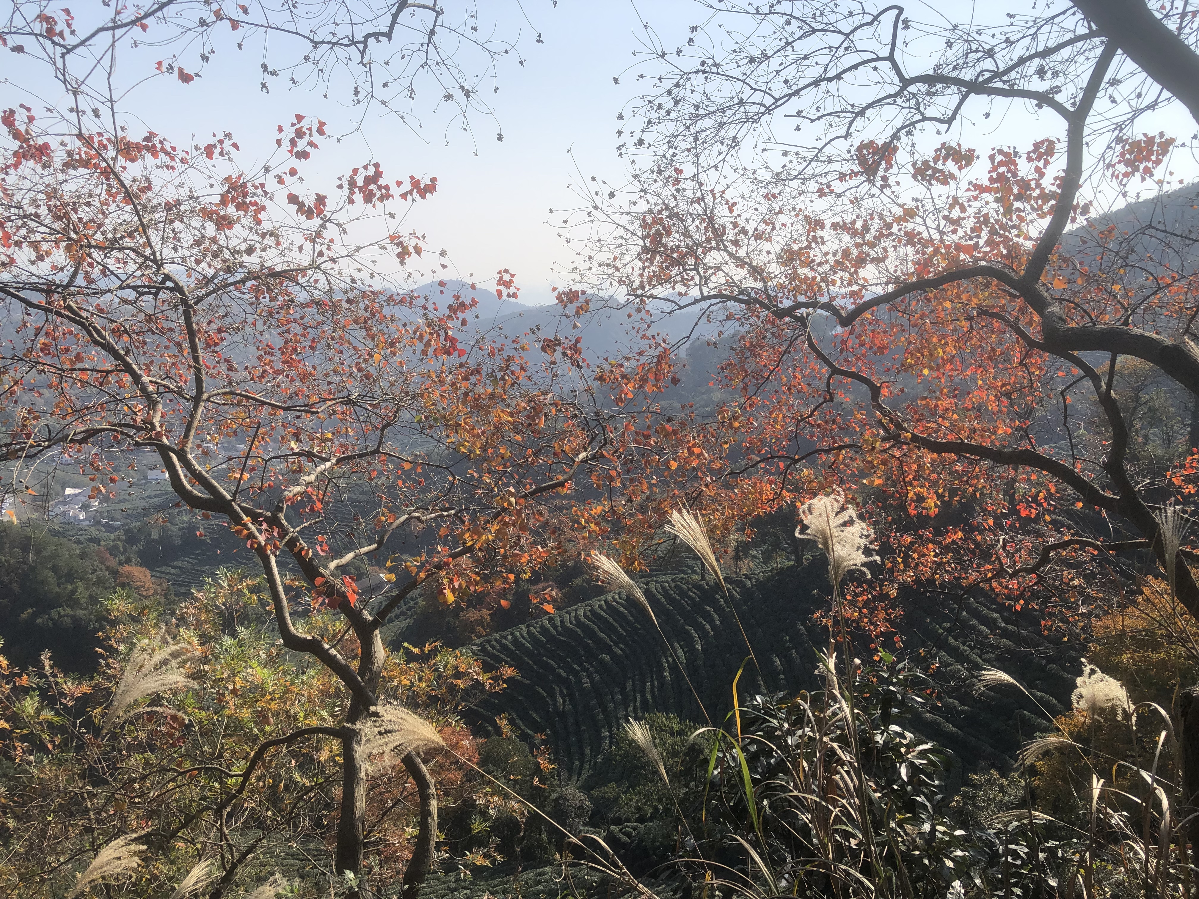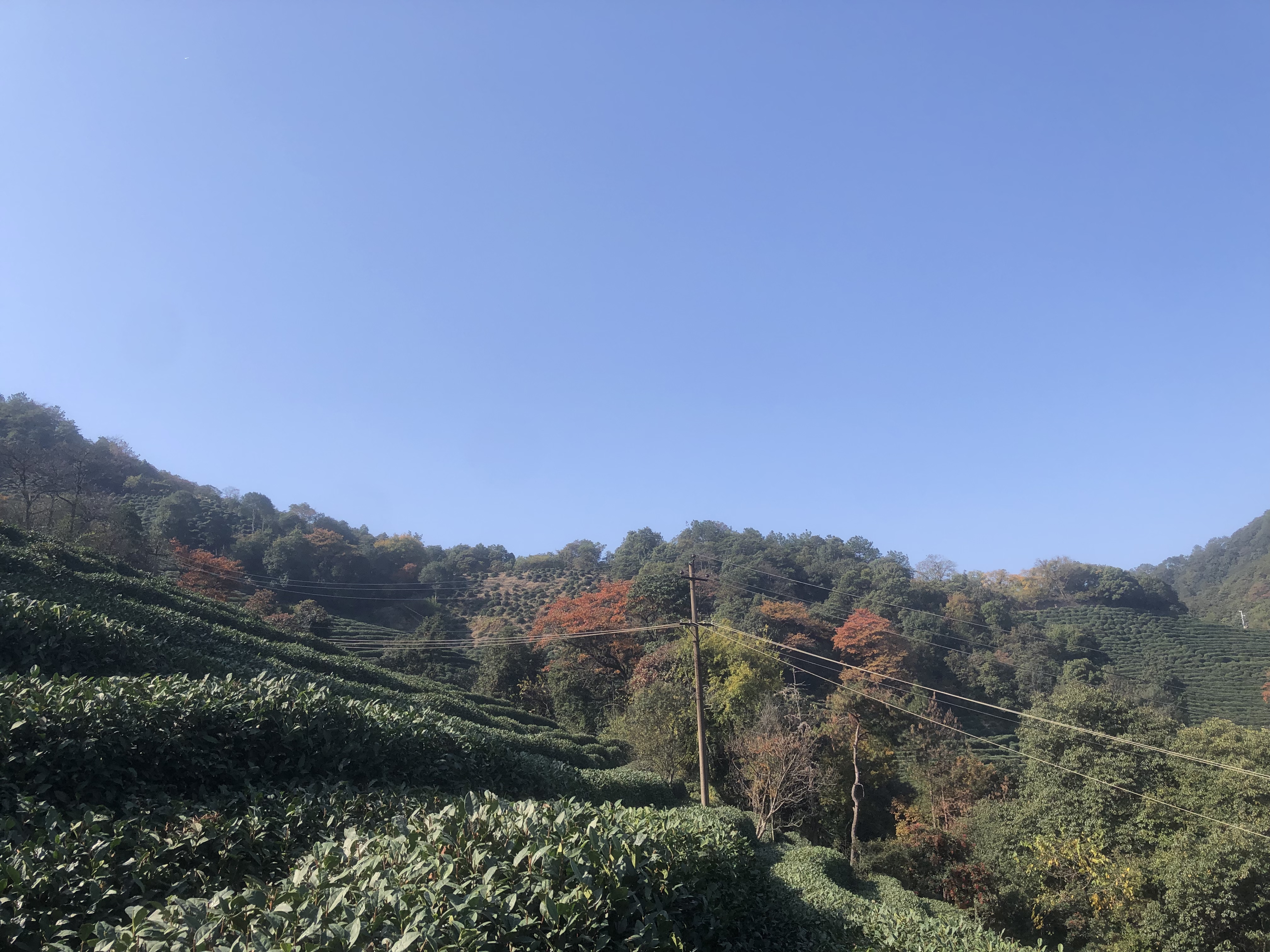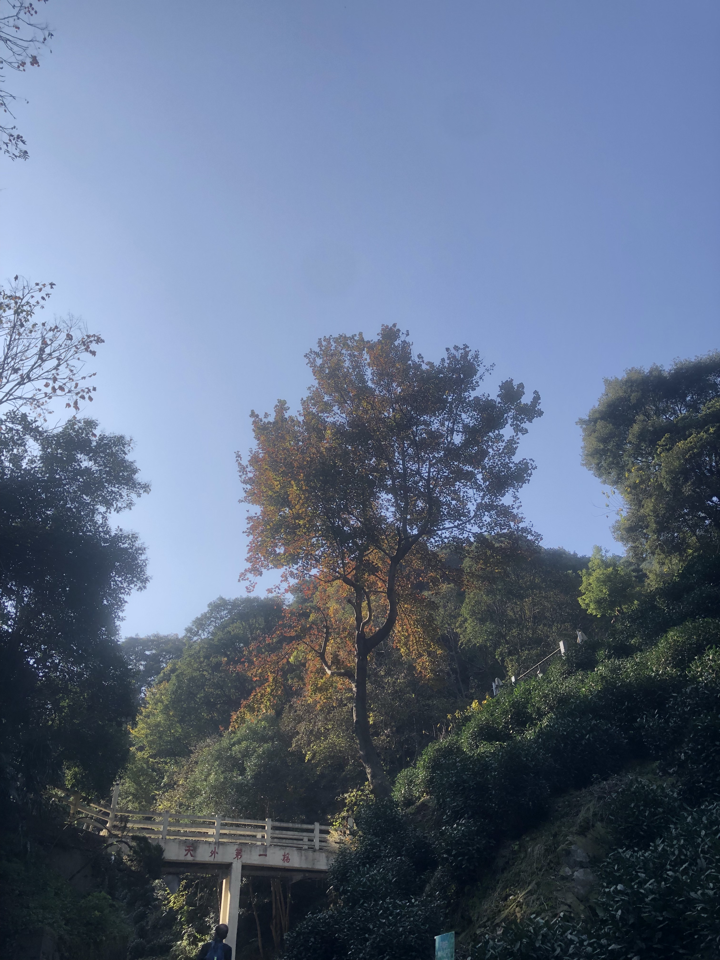 昨晚刷手机,刷到一条这个季节杭州的最美登上路线—-从法喜寺梅灵隧道入口附近的山道上山到梵音亭,然后走十里琅珰至五云山云栖竹径,怦然心动。 掂量了一下自己的脚力,选择走半程。 今天一早,循着高德地图的指示乘公交121到法喜禅寺站。往前三五十步,就看到了隧道口,左转离开汽车路,便是往山上去的小道。看地形原本是个两座山峦间的夹角,先一段是足有30多度斜角的水泥路,勉强可以通过一辆小车,边上有附近单位的管理用房;转个弯,前面横架了一座不大的水泥桥,桥身平常,外形甚至有些潦草, 唯桥上“天外第一桥”五个同样不甚规正的楷体字赫然入目,颇显建桥者的豪迈与自信。想想没错,来的路上,灵隐、天竺山门前的照壁就题“咫尺西天”四个大字,那是俗世与净土的界碑,进了山门,便是西天圣境。边上那个油腻腻的小饭店就一直妥妥地顶着“天外天”的大名,何况桥乎!一株枫香树立在桥上,因为地势的缘故,才红了半边,阳光从山的南面斜斜地照过来,照到树上、桥栏上和桥下的立柱上,原本有些沉郁的山色居然生动起来。 山道从桥洞下穿过,变成西湖群山中常见的石砌步道,蜿蜒陡峭且背阴,一直隐藏在遮天蔽日的树林下。埋头拾阶而上,初始有些闷闷的,一会儿就气喘吁吁、腿肚子发酸,只能时不时停在路边歇息,自诩这是“以时间换高度”登山策。 走走停停近半个小时,再一转弯,阳光直接从头顶的树缝里泻下来,山顶在即。紧走几步,青石筑成的梵音亭就在眼前。若是赶上山下寺里的晨钟暮鼓,风会把他们传过来。这会儿,山风飒飒,浑然天籁,也如梵音一般。 梵音亭所在的山脊叫仰峰岭,站在这里,南北高峰乃至周边的群山尽收眼底。 一边有如国画般风景的(石门)山;再前,是仙气飘飘的棋盘山。棋盘山有个与衢州烂柯山极其相似的採樵故事,说是村里的小伙子上山砍柴,遇到两位神仙下棋,小伙子一旁看出了神,饿了渴了就捡神仙扔下的桃核吃……醒过神来,随身的柴刀和绳子都烂了;回到村里,当年的玩伴已成白胡子老头。再去山上,不见了下棋的神仙,只找到用作棋盘的大石头。 另一边连接了琅珰岭。十里琅珰,旧时是贯通西湖西线的官道。两百多年前,乾隆从这里下山,邂逅了狮峰龙井。一直没弄清楚他当时是从五云山还是风篁岭,抑或就是我们刚刚路过的上天竺走到这里的。近千年前的原天竺寺住持辩才和尚肯定是沿着天竺上来的那条路策杖而来,是他把天竺寺的香林茶带到了龙井(1007年宋神宗改年号元丰,秦观游龙井元丰二年)。杭州太守苏东坡访辩才,走了棋盘山麓的风篁岭,回城时,八十高龄的法师送他送过山门外的小溪。岭中的石阶路上还留着为纪念两位跨界高人这段美谈修筑的过溪亭。上世纪五十年代,共和国的第一任总理周恩来也曾轻车简从独自走过过溪亭,走访龙井茶农。 我们走在十里琅珰的山脊线上,天高云淡。往下看,四周群山环抱中的谷底一大片白墙黑瓦,就是龙井村。那里有我外祖父母留下的老屋! 脚下就是狮峰。满山的茶地。阳光在山谷中流动,聚光灯似地一束束打在茶蓬上。茶蓬像是会动了,海浪般一直从谷底向上涌。留在枝桠上的已都是些老叶,整体颜色接近墨绿,像是心甘情愿要为那些能够姹紫嫣红的树叶做打底色。走近了,忽然发现,枝枝叶叶间正开着一朵朵洁白如玉的小花。茶叶真是一种奇特的植物,一年中会萌发四茬新叶,从春寒料峭的三月到白露为霜的秋日。只有到了万物收藏的冬天,才为自身的繁衍劳作,悄悄地绽放、静静地孕育,然后再在雨雪中默默地静候来年。间杂在茶地中的各种枫香树、槭爪枫是最耀眼的,一树殷红,肆意地展示着生命中的热烈与野性 。还有各种亮眼的黄,梧桐、银杏、白杨、无患子、橡树、苦楝、杉树、朴树…….不经意中一转眼,就会撞见远远近近的树木都在蓝天与山地之间点擦铺陈着这秋季最丰富的色块,阳光不疾不徐地再在边上打下一圈光晕,让人想起林风眠的画。 路边的乌桕树最为秀气和美丽,心形的叶子着了赤橙黄绿各种半透明的颜色,挂在树枝上斑斓一片;榉树则有一种特别的沉稳,叶色还在转化中,树顶枝桠上较新的叶子是墨绿的,稍低一点的变成了大片的主色调褐红色,再下或庇阴的位置则有深深浅浅的红色或黄色,呈现出丰富且厚重的层次感。 走近三岔口,看见两位女生有模有样地端坐在茶地旁的石头上,规正地摆放了茶具喝茶。这里的视野更加开阔,静静地站在他俩身后远眺,目光能够越过茶地、村舍,越过一层又一层起伏的山峦,淡蓝色的天空下有一抹同样淡蓝的湖水,天水相接处那个我们日常生活其中的城市海市蜃楼一样。 就近从左边找个岔道下山去,没有了上山时的气喘腿疼,一鼓足气走进村里。打开老屋的大门,点火做饭,正午的太阳刚晒到厨房西南向的窗玻璃上。