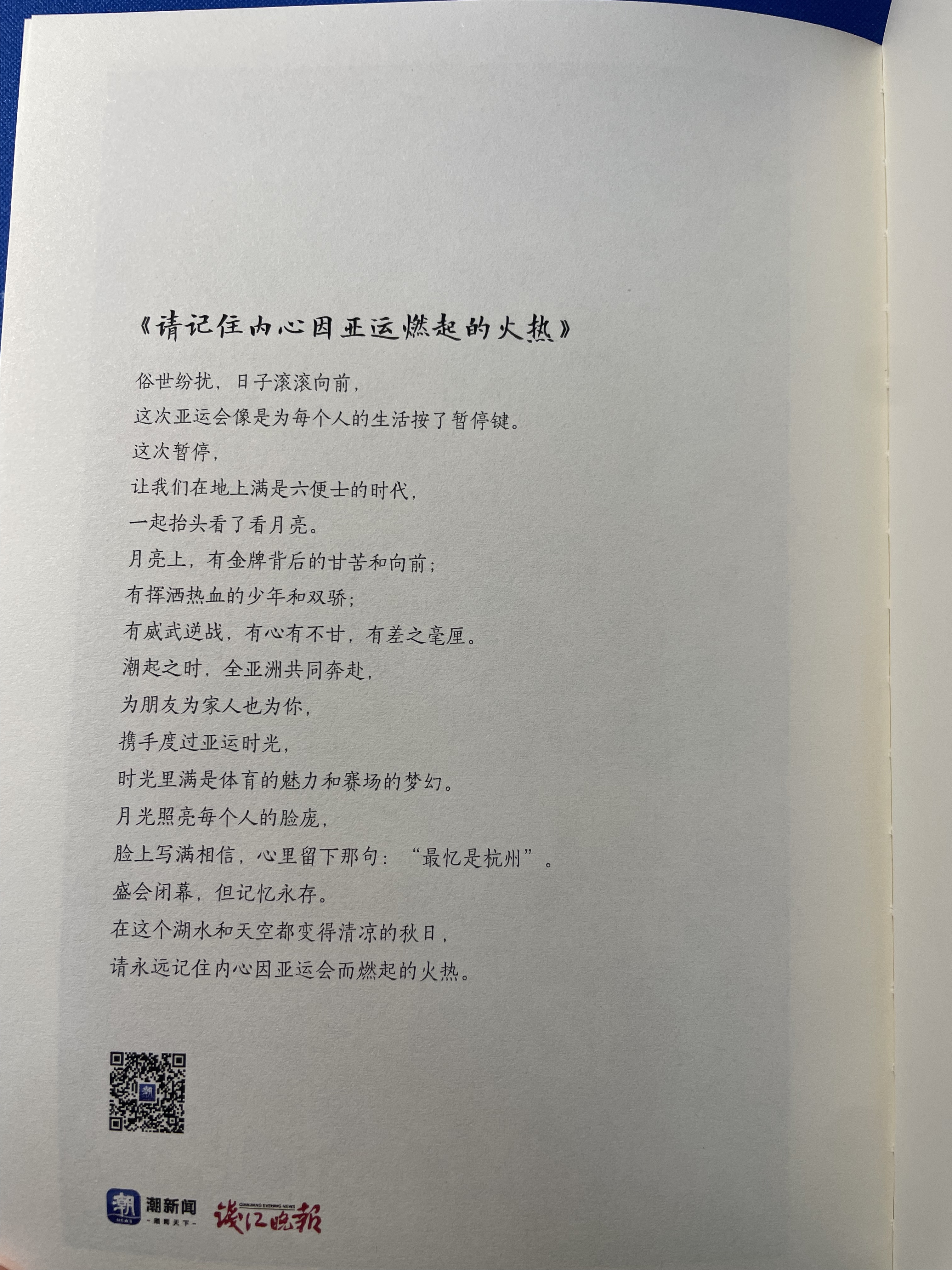 收到钱报朋友圈礼物了,灵隐寺挂历非常耀日,而《钱江晚报》潮新闻的定制款笔记本,则用插图的方式记录了杭州亚运会的精彩瞬间,都是头版头条的精华哦!笔记本起首页用唐朝诗人张九龄的《送韦城李少府》中的名句“相知无远近,万里尚为邻”做序,也是对钱报朋友圈,同是一家人做了注释。感谢钱报朋友圈,让我们彼此相遇,相识。