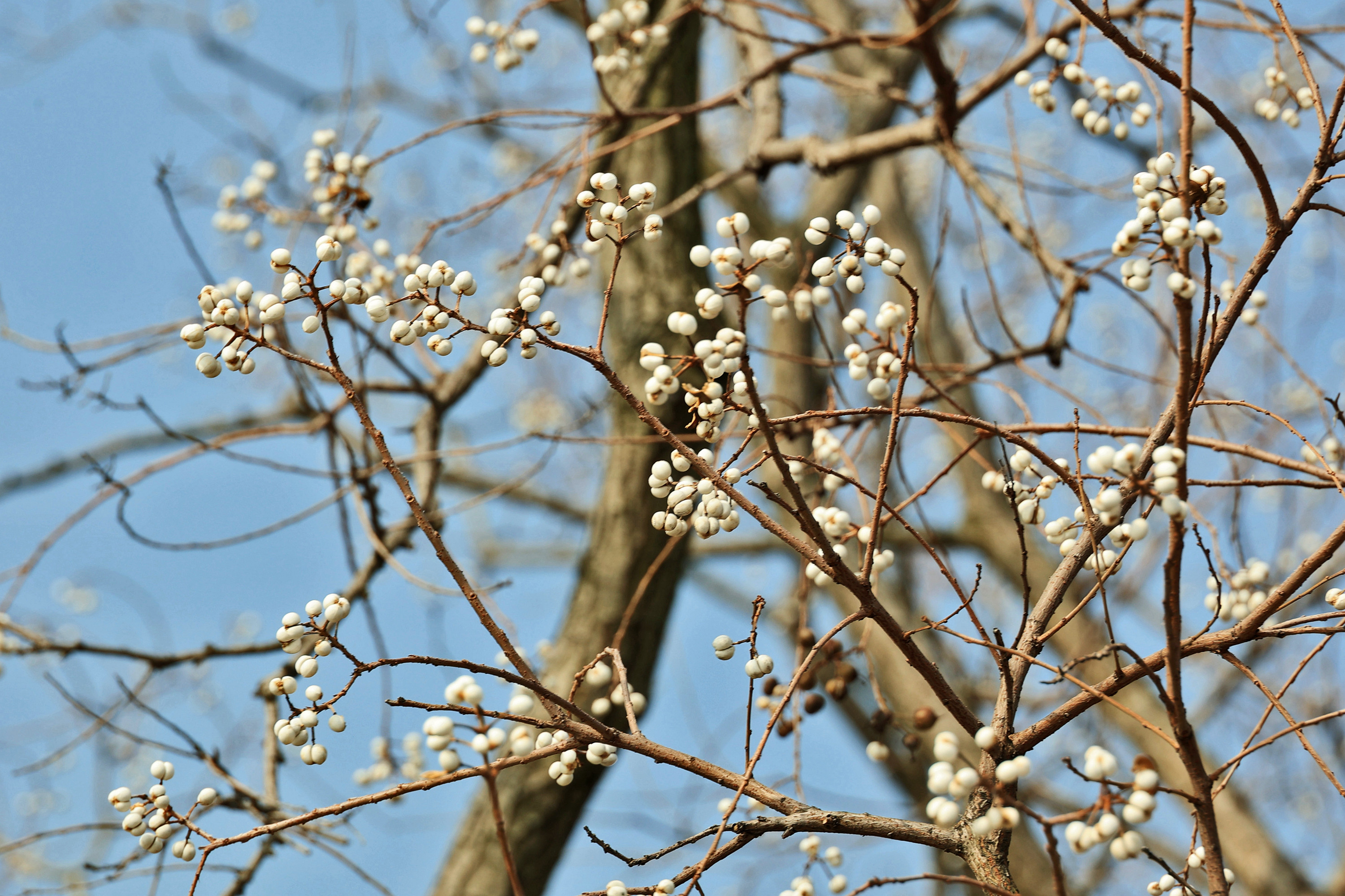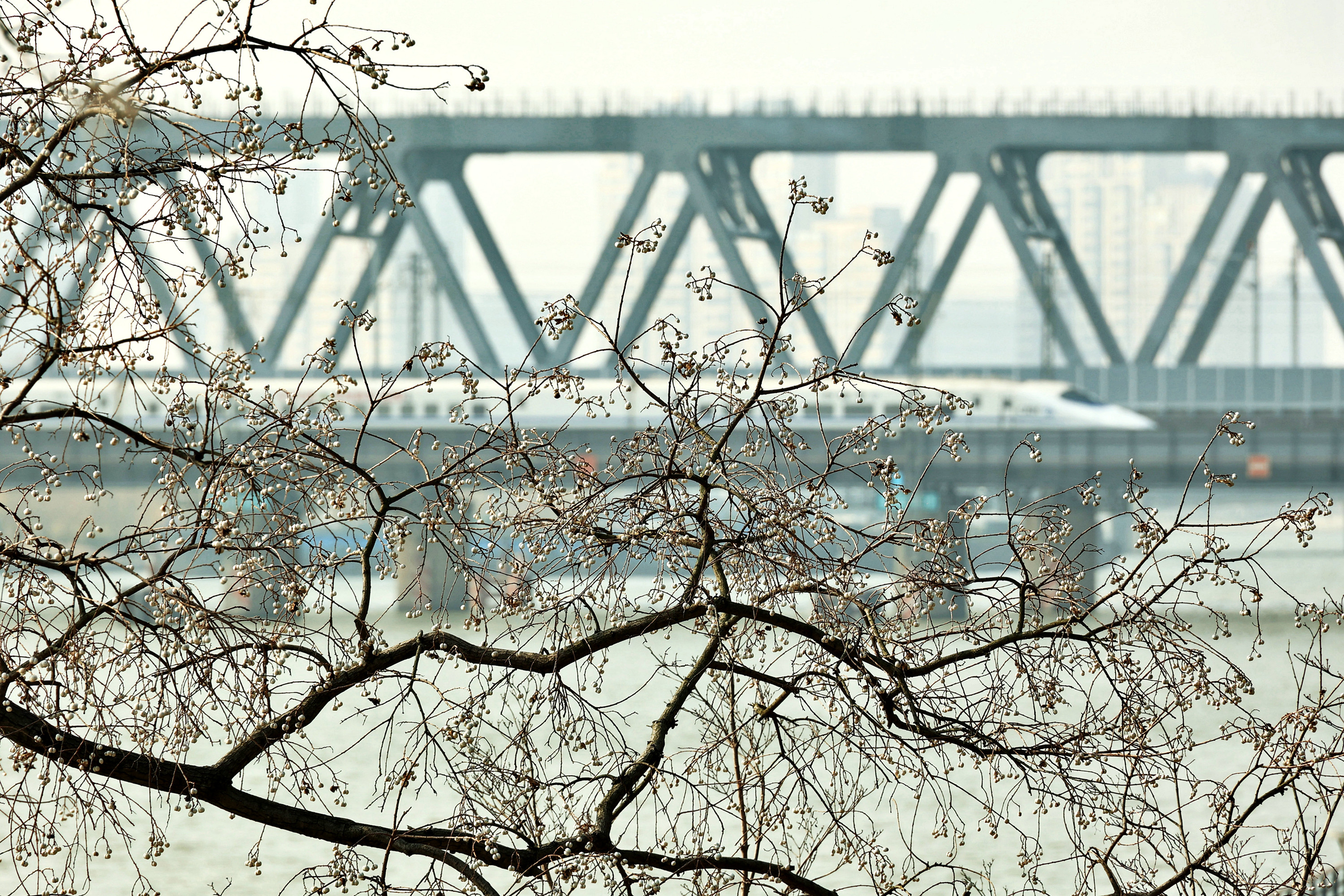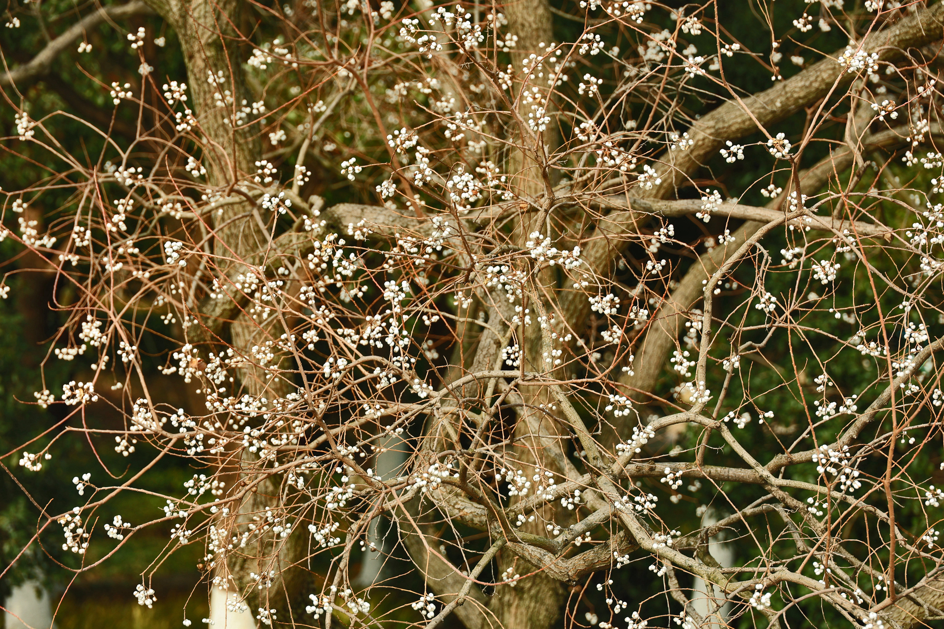 《冬日乌桕,白果缀满枝,犹如白梅朵朵》“偶看桕树梢头白,疑是江梅小着花。”乌桕,是秋冬季色彩最为斑斓的树种,秋日,乌桕叶子红红火火;入冬,红叶落去,满枝白果,点点簇簇,远远望去犹如白梅朵朵,正是“千林乌桕都离壳,便作梅花一路看”。