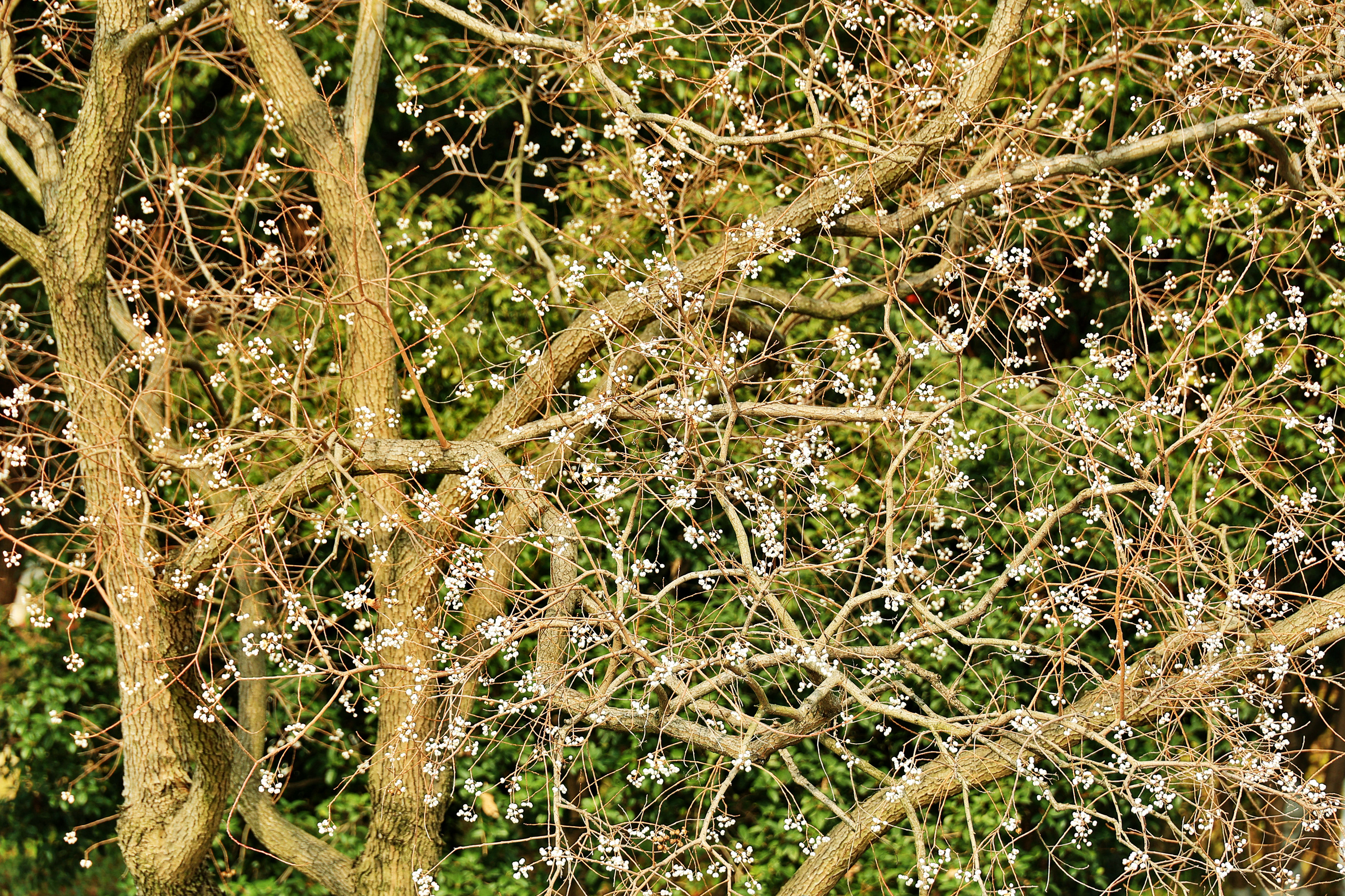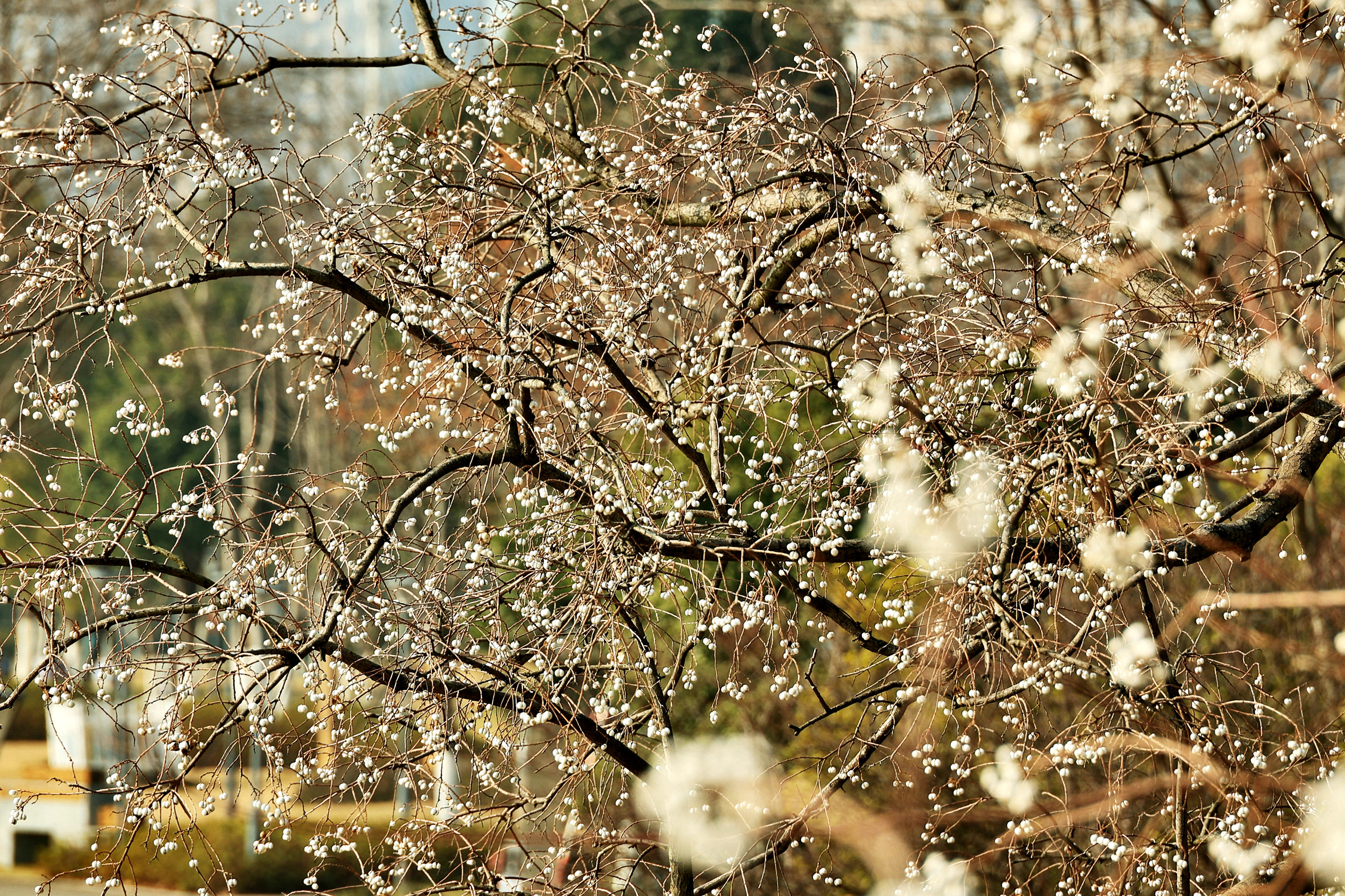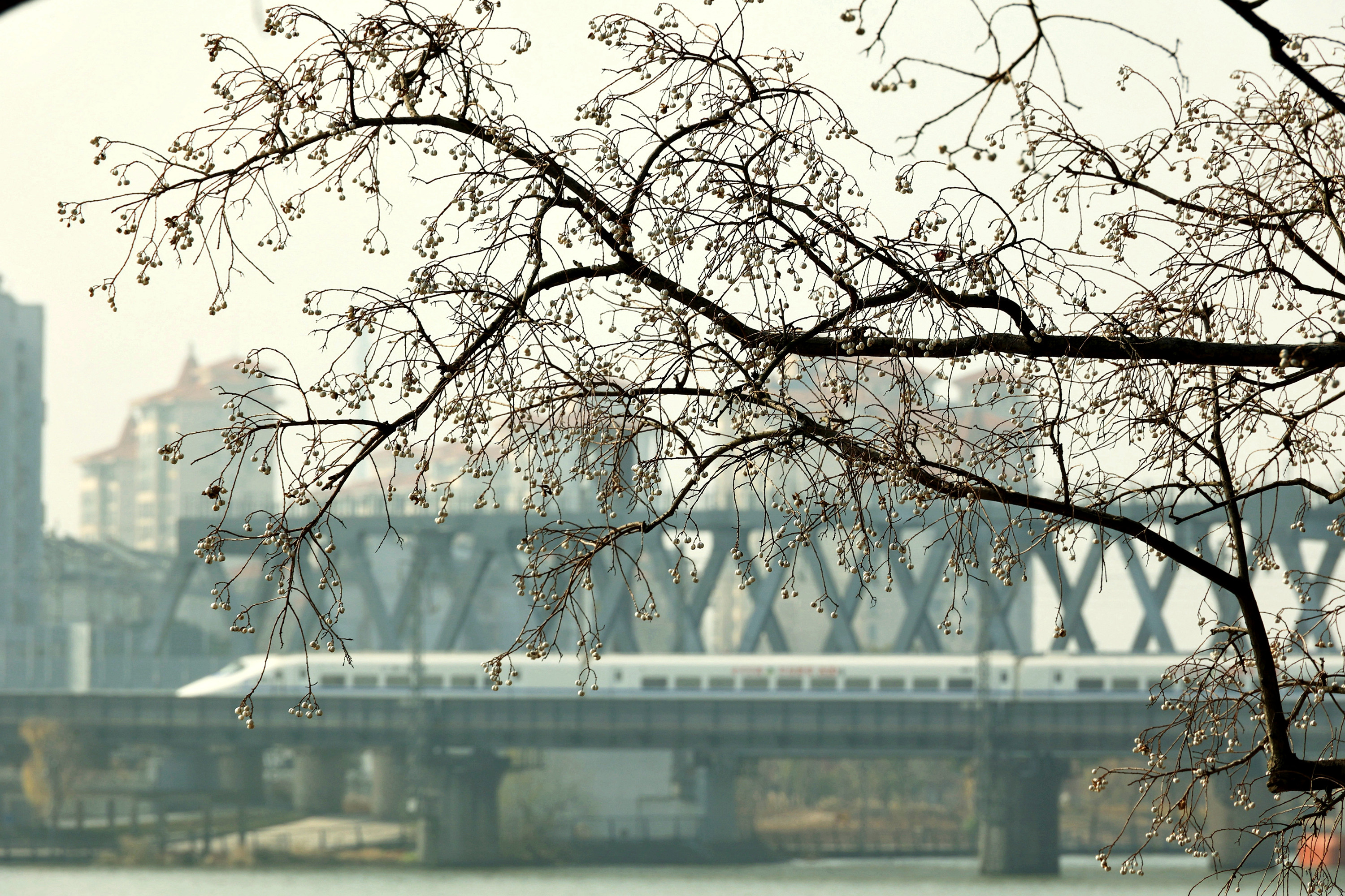 《冬日乌桕,白果缀满枝,犹如白梅朵朵》“偶看桕树梢头白,疑是江梅小着花。”乌桕,是秋冬季色彩最为斑斓的树种,秋日,乌桕叶子红红火火;入冬,红叶落去,满枝白果,点点簇簇,远远望去犹如白梅朵朵,正是“千林乌桕都离壳,便作梅花一路看”。