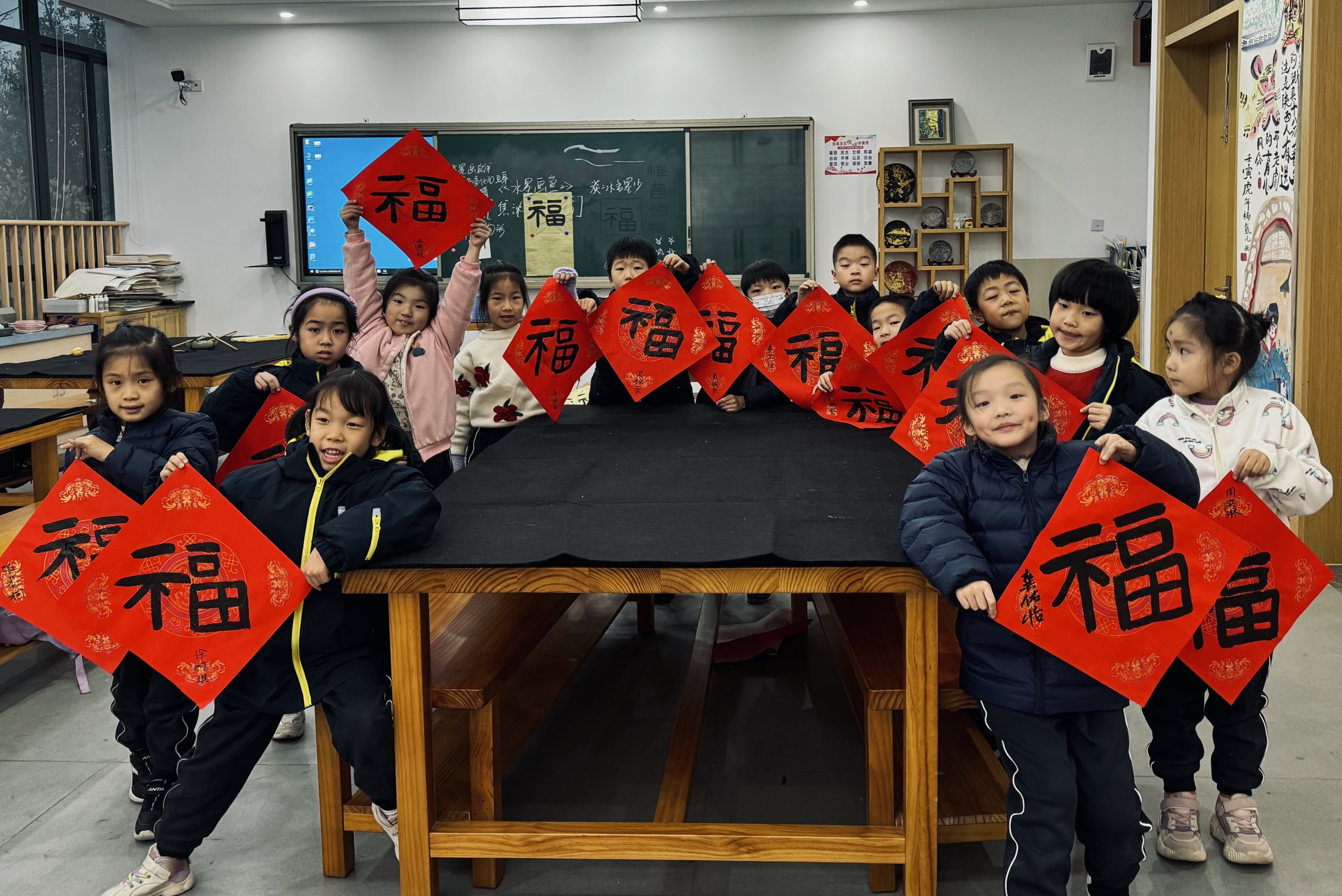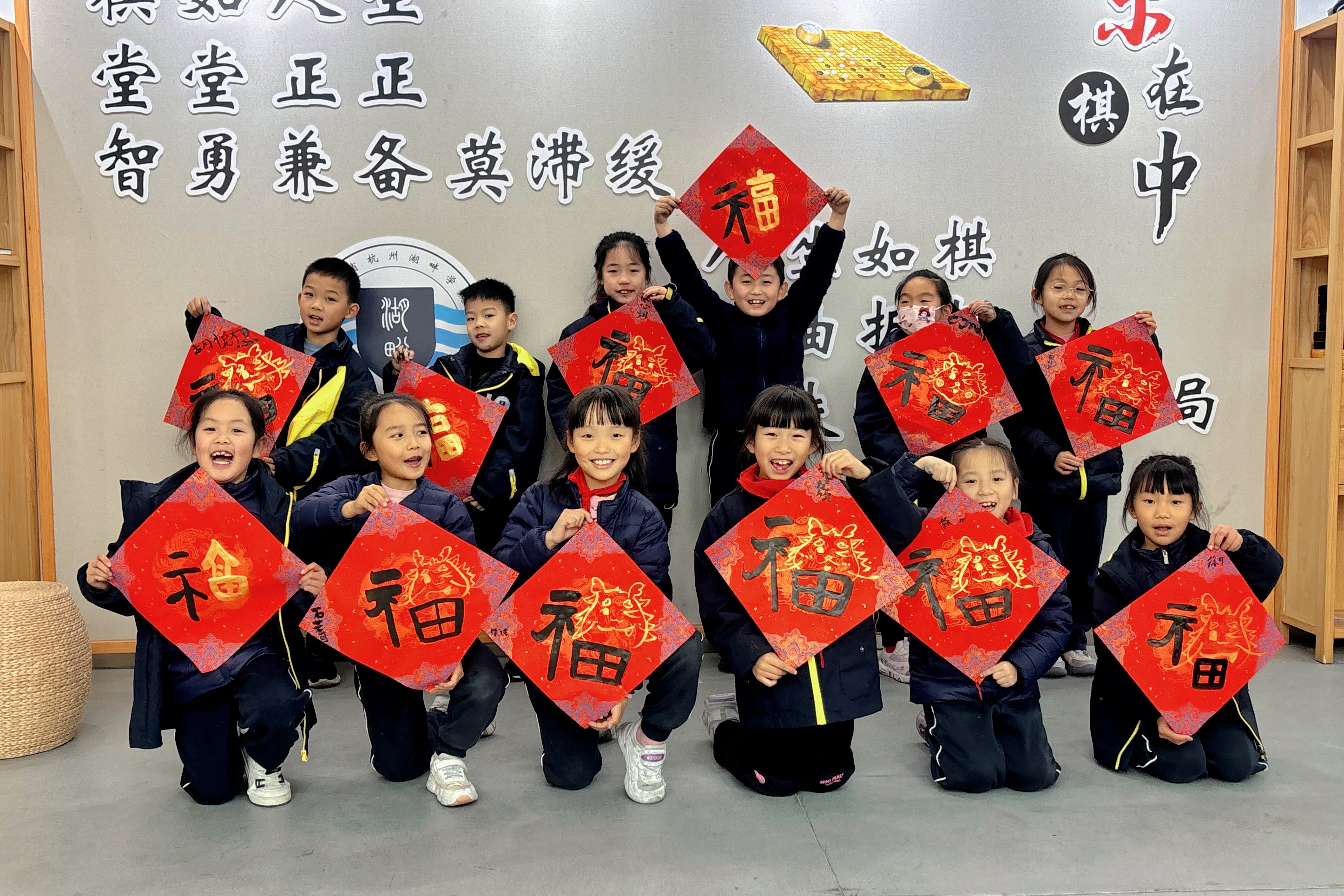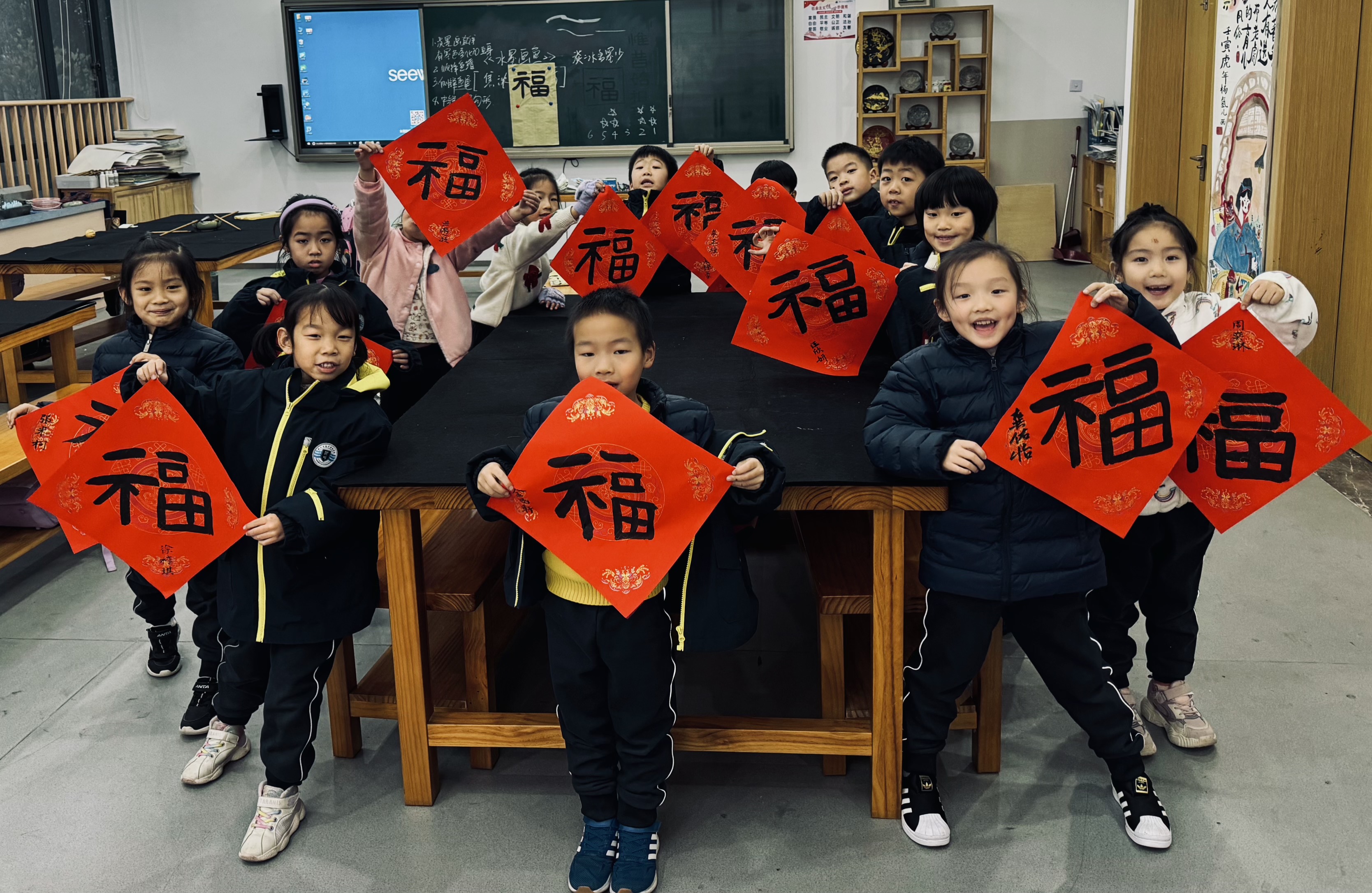 悠悠漫长历史长河中,书法以其独特的艺术形式和艺术语言在漫漫岁月中经久不衰地发展。在癸卯年末之际甲辰迎新之时,浙江省杭州湖畔学校小学部软笔书法课堂组织孩子们书写福字,从中国传统文化书法带孩子们认识福、练习福、书写福。 在课堂中,分为两个方向带孩子们学习汉字知识,理论上从福字的历史发展、文字字义的解释出发,带孩子们了解了福字的发展历程,也引入了汉字的发展。技法书艺上从结构以及线条形态出发,让孩子们熟练书写福字的写法,这里也带来了“大篆”“小篆”“隶书”以及加入现代元素等不同的写法,不仅让孩子们学习了文化知识,增强临古能力,也加强了孩子们的创作能力。每一个红红火火的手写福字,带着辞旧迎新的美好祝愿,孩子们书写的福字不仅仅是一个汉字,更是书写对美好生活的期盼和祝福。福字在一笔一划中书写而出,中华优秀传统文化在师生间传承。红红的福字永远都是中国人过年时对新春美好生活向往的一种标志,是一种重要的仪式。制作福字,不仅是心意,更是传统,是人与人之间温暖的爱。希望孩子们能带着自己的福在新的一年里茁壮成长一切顺利!