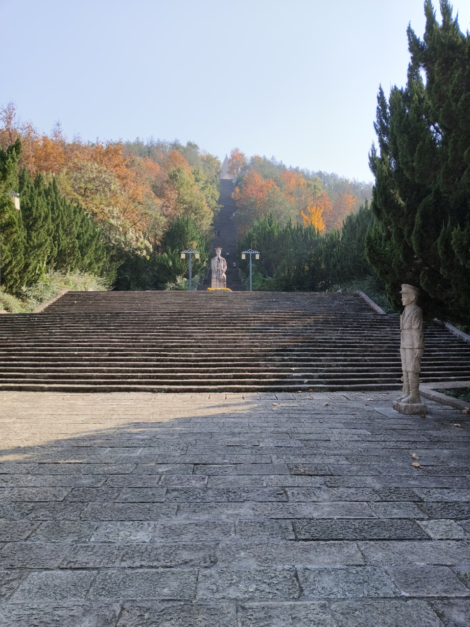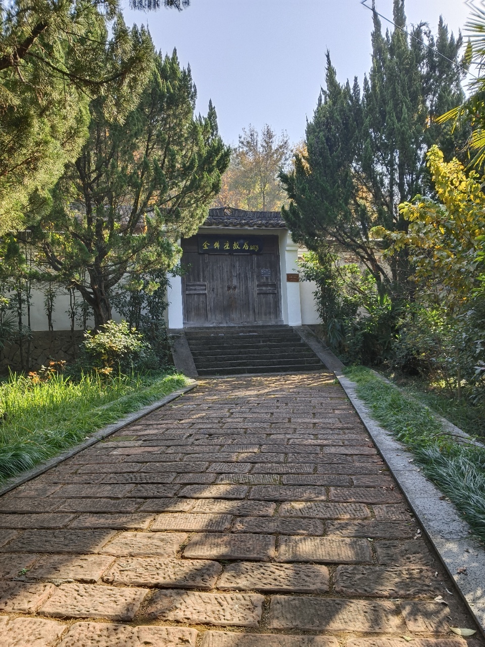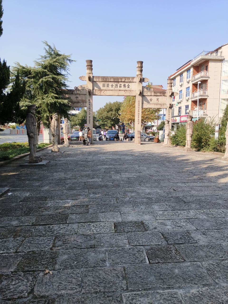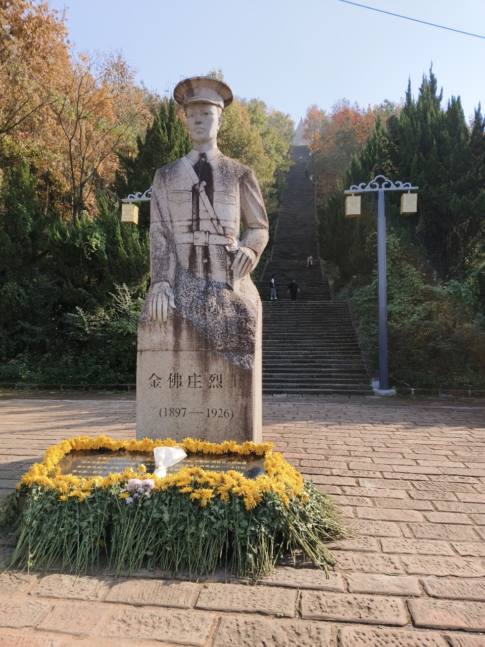 探访烈士陵园,追忆北伐名将 时光流转,四季交替,冬去春来,桃红柳绿,不觉又到清明时节。今天送货经过“金佛庄”,正好碰到一队学生前来烈士陵园扫墓,缅怀革命先烈。不由想起去年金秋的一个午后,阳光普浴大地,暖风和煦,望着远处霜叶正红,银杏正黄,正适合出去看看晚秋风景,守店出不了远门,于是趁着午后稍有闲暇,去“金佛庄”走走看看。 小店开在横店良渡,正是北伐名将金佛庄烈士的家乡,“金佛庄烈士陵园”就在万盛街最南端的“水碓山”。初到横店时,我以为“金佛庄”就是一个地名,原来是人们习惯将“金佛庄烈士陵园”简称为“金佛庄”,以金佛庄烈士之名来命名此地了。 金佛庄烈士陵园建于1995年,占地66000多平方米,位于良渡水碓山北麓,是浙江省爱国主义教育基地、党史学习教育基地,东阳市文物保护单位。 [图片] “金佛庄”地处三岔路口,对面就是“梦幻谷”景区,再往前就是秦王宫,车来人往,甚是热闹。街边入口处,是一座高大牌坊,上面正中是由中共中央原副主席李德生所题“金佛庄烈士陵园”七个大字,两边是“高风”“亮节”四个大字。 走过牌坊,大道两旁各排列着6尊石雕的戎装卫士,正中平台为金佛庄烈士花岗石雕像。卫士身后浓密翠绿的柏树如两堵绿色的城墙,沿着雕像身后500多级石阶,向上延伸,直达烈士纪念碑。 抬头瞻仰金佛庄烈士的雕像,只见他的左手叉腰,右手微抬,远眺前方,眼神中蕴含着坚定的革命意志,蕴含着对革命未来的希望。雕像前面的黑色花岗岩上,雕刻着烈士生平,四周围满了人们敬献的一支支金黄色菊花。 [图片] 沿雕像右侧小道往前,有一独立小院,院子外墙的门头上挂有徐文荣老先生题写的“金佛庄故居”匾额,内设金佛庄烈士史料陈列馆。金佛庄牺牲后,其父母用抚恤金对良渡村故居在原址上进行扩建,共五间二弄,建筑面积185平方米。2000年,故居迁至金佛庄烈士陵园内,作为金佛庄烈士陈列馆。故居前增建庭院,庭院内东侧立有蒋中正所题“为国捐躯”碑石。馆内陈列有大量金佛庄生前照片、手迹、遗物、有关报刊、书籍、工作和生活场景。 [图片] 从烈士生平介绍里知道,金佛庄(1897—1926),学名灿,字辉卿,1918年考入保定陆军军官学校。1922年加入中国社会主义青年团,同年8月,转为中共党员,是参与组建浙江第一个党组织——中共杭州小组的3名成员之一。1923年6月,出席中共三大。1924年春,参与创建黄埔军校,历任黄埔军校第一期第三队队长、国民党特别党部执委、教导第二团第三营营长,国民革命军第一军第一师第二团党代表、团长和总司令部警卫团少将团长等职。身先士卒,战功卓著,为黄埔军校教导第二团争得“党军荣誉旗”。率部参加平定广州“商团”和滇、桂军阀的叛乱,以及讨伐陈炯明部的两次东征,获赞“英勇善战,勋绩灿然”。 金佛庄秉持军事救国理念,东征北伐,屡建奇功。他以马克思主义为指导,积极探索武装夺取政权以改造中国的无产阶级革命道路。一句“眼见国家将往,不应徒作书生,默默以终也”,鼓舞了无数报国青年;一篇《军官的心理》,开创了中国共产党人革命军队建设理论研究的先河。蒋介石非常赏识他的才华,企图利用“浙江同乡”的关系拉拢他,但金佛庄忠于党的事业,不为所动。 北伐军攻克南昌后,军阀孙传芳部仍盘踞在苏浙皖诸省,负隅顽抗。为分化瓦解孙传芳部,金佛庄主动提出,潜入沪、杭等地策划浙军等部起义。1926年12月9日,金佛庄假扮商人,乘船从九江顺流东下。不料行踪泄露,11日,船到南京下关码头时即被孙部所捕。上海的国、共两党组织闻悉此事,多方设法营救,通过各种社会关系,请托当时的浙江省省长陈仪出面,向南京方面说情疏通。蒋介石也特意发电请孙传芳善待金佛庄,并提出可以用孙军被俘的高级将领相交换,被孙传芳断然拒绝。12日,金佛庄被杀害于南京,成为第一位血溅雨花台的中共烈士。听闻金佛庄遇害,蒋介石大怒,立马枪毙了孙军被俘的一个军长和一个师长以解心头之恨。 金佛庄在那军阀混战,国家支离破碎的年代,胸怀拯救中华民族、改造中国社会的初心,踏上了革命的征程,书写了他虽然短暂,却灿烂辉煌的一生。 仰望山顶,在天梯般向上延伸的台阶尽头是烈士纪念碑,两旁山坡,层林尽染,松柏青翠,枫叶绚丽,有绿的、黄色、橙的、红的、褐的,多姿多彩,渲染了整个烈士陵园。 [图片] 拾级而上,秋风掠过,枫叶摇曳,簌簌而下,飞舞着,盘旋着,掉在脸上、肩上、手上,最终落在石阶上,铺成了厚厚的一层。一片片叶子,在树缝间洒下的阳光照耀下,黄得那么灿烂、红得那么鲜艳,如同跳跃的火焰,把整片枫林点燃,尽情释放一生的能量。 烈士纪念碑是高大的人字形白色花岗岩建筑,上镌“永垂不朽”四字,四角落地,中间镂空,正中是金佛庄烈士的衣冠冢,烈士长眠于此。烈士纪念碑前,台阶尽头,恰有一株枫树,灼灼枫叶红得热烈,红得透彻,像一支火炬在纪念碑前熊熊燃烧。 [图片] 站在平台,向下远眺,整个横店尽收眼底。八面山脚,幢幢高楼平地起;梦幻谷中,摩天大轮循环转圈;秦皇宫里,座座宫殿演绎战国风云。横店,早已不是那个“出门望见八面山,薄粥三餐度饥寒”的横店,“东方好莱坞”从无到有,从中国走向亚洲,走向世界,横店,已是全球最大的实景影视拍摄基地。钻进八面山里的“金水牛”,终于被横店人牵出来了。 “金佛庄烈士陵园”现在