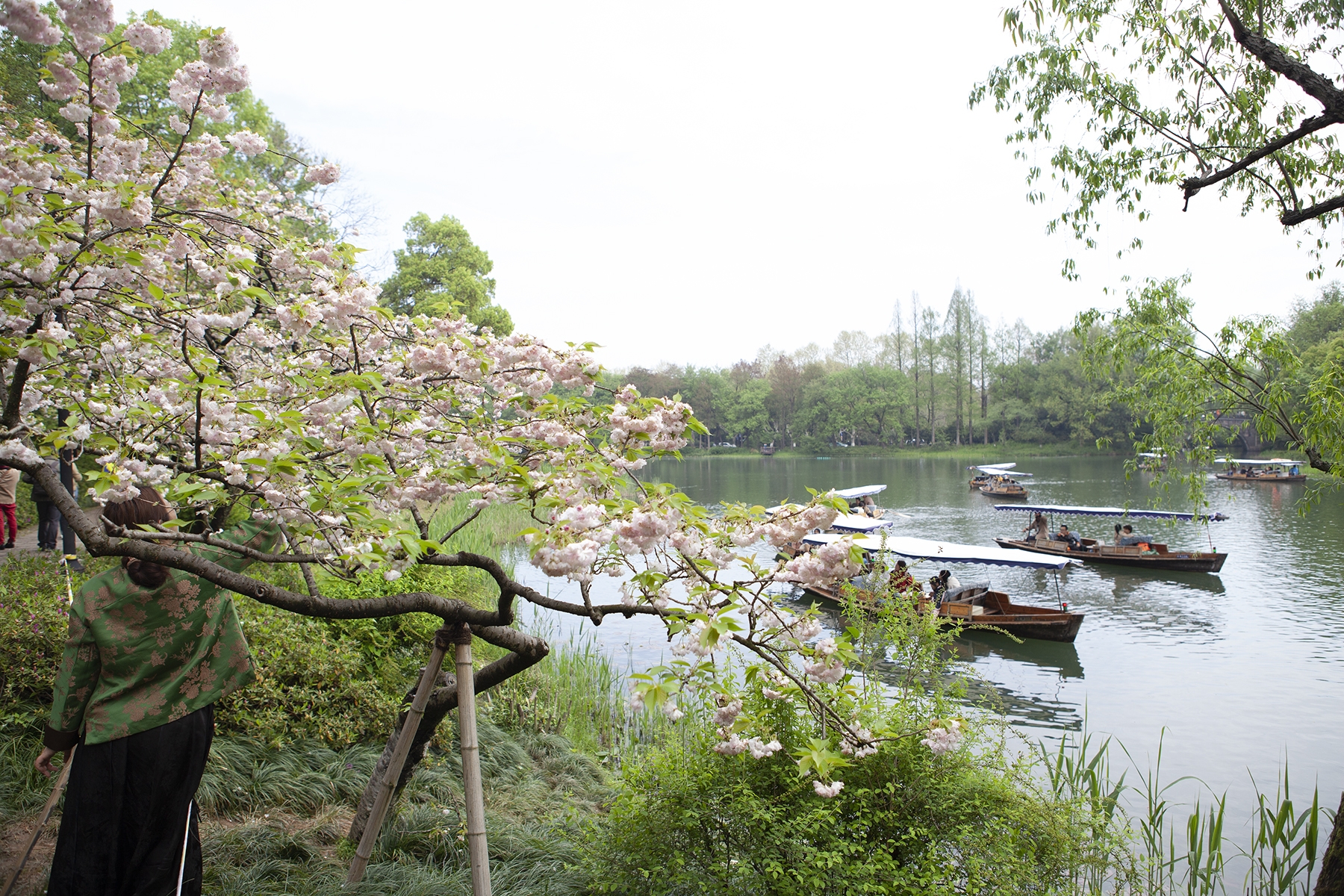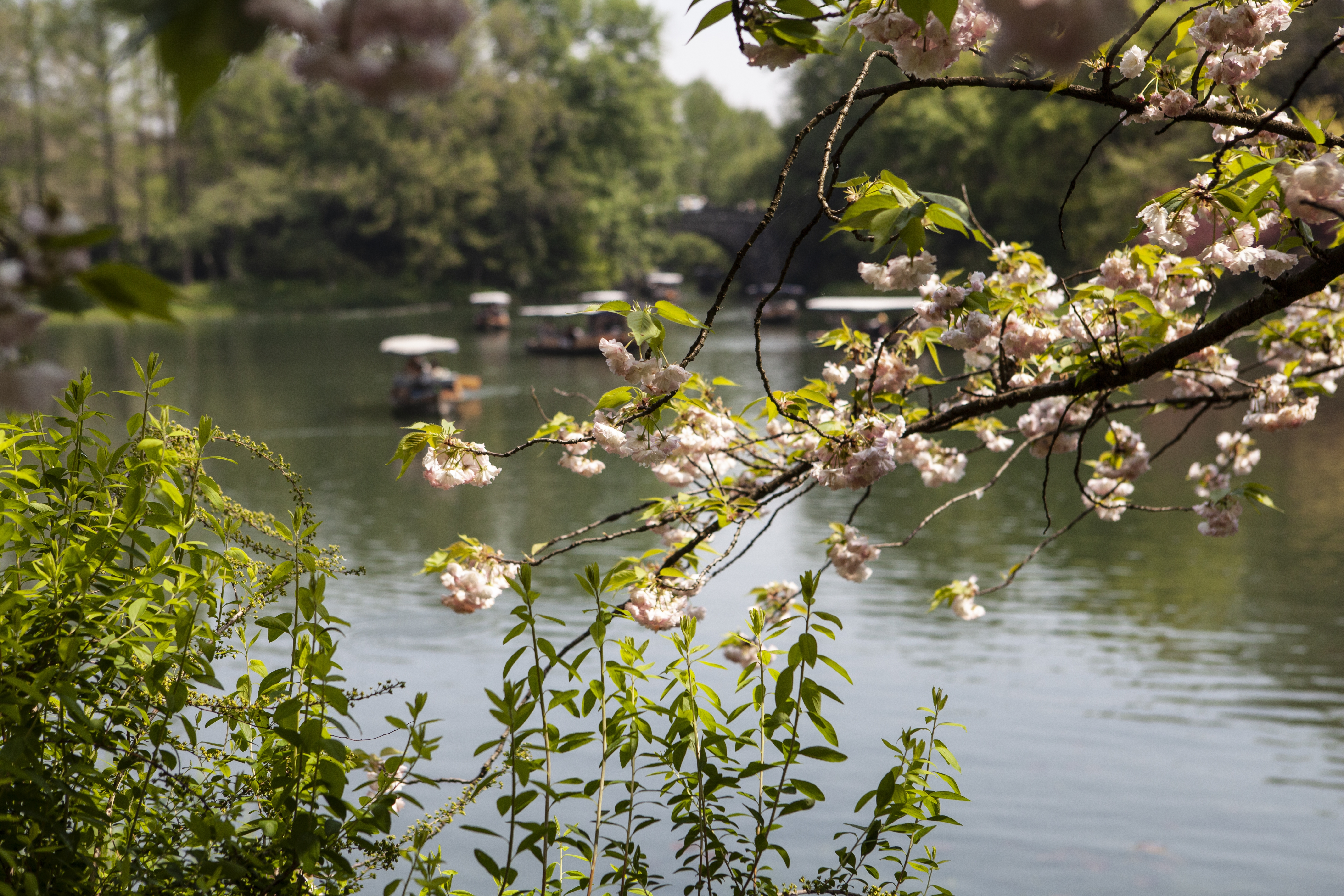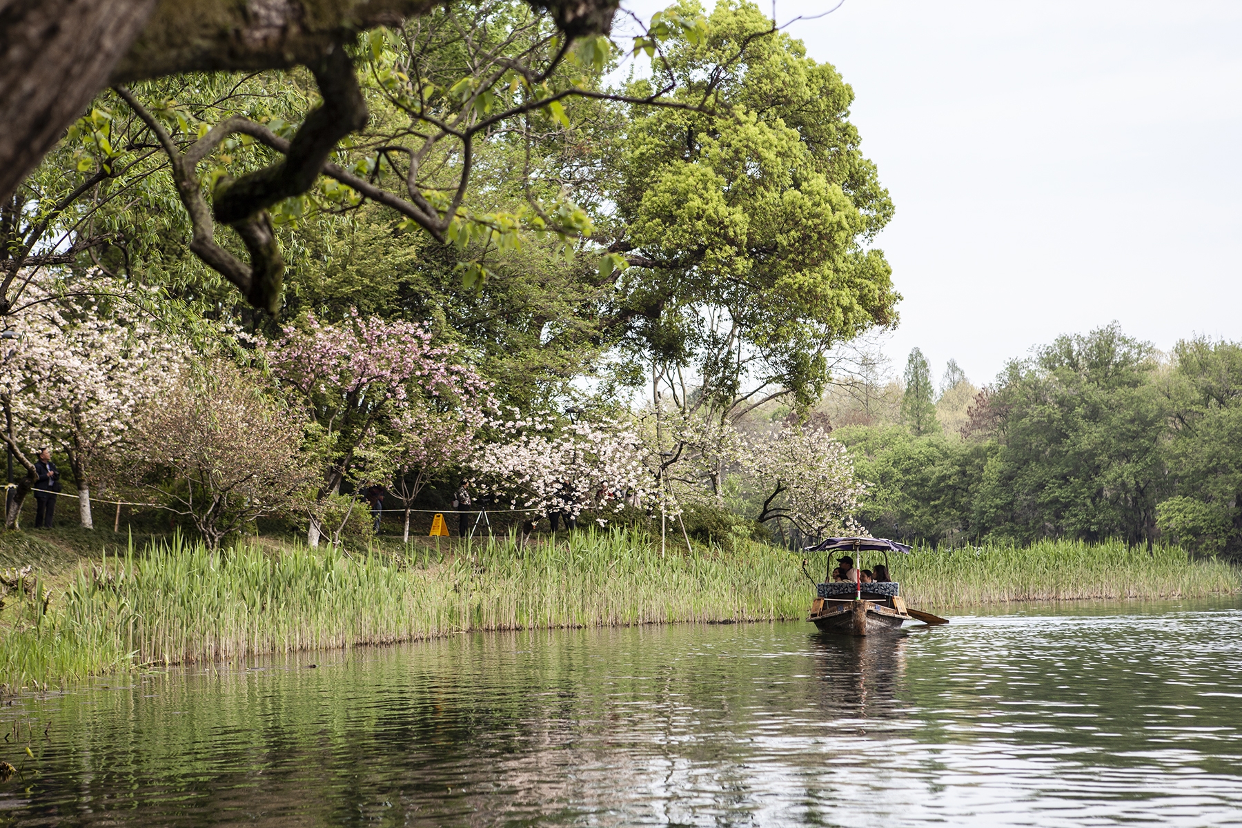 湖水清清西湖秀,花影绰绰游船行。桃红柳绿梨花白,最美人间四月景。