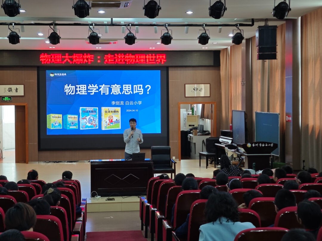 4月9—12日,浙江科学技术出版社、台州市新华书店、潮新闻共同策划组织了以“物理大爆炸:走进物理世界”为主题的科学家进校园活动,邀请知名科普作家李剑龙博士走进台州市多所学校,为学生带来精彩的科普讲座,传播科学知识。 李剑龙博士本硕博均就读于浙江大学物理系,从事青少年科普教育多年,出版过多部科普作品,其中《物理大爆炸:走进物理世界》被评为”浙里科普“优质科普图书资助项目,《物理大爆炸:128堂物理通关课》累计销量60万册,《动物大爆炸》入选“2023首都科普好书”“大鹏自然童书奖”“2023年度爱阅童书100”。 物理与实验密不可分。在新前中心小学、白云小学、华东师范大学附属台州学校、学院路小学、横街镇中心小学、共和小学、蓬街镇中心小学,李剑龙博士用三个实验:声悬浮、红外线探测、特斯拉线圈实验引入这堂物理课,让孩子们知道物理与生活密不可分,告诉孩子们什么是物理学,学习物理学有什么好处,物理世界具体有哪些内容。新鲜有趣的实验内容、充满魔法的实验现象,吸引了孩子们踊跃参与。李剑龙博士的讲座知识含量非常高,听完讲座,孩子们对物理世界产生了极大兴趣:我们平时说话发出的声波,居然还能控制水滴的悬浮;物理学不但可以研究我们生活中熟悉的事情,还会帮我们发现平时根本看不见、摸不着的事物;溶洞救人这个大难题,竟然是用物理学中的简单机械解决的…… 科学家走进学校,给孩子们开展科普讲座,在孩子们心中播撒了爱科学、学科学的种子,受到了学校和孩子们的高度赞扬。在新前中心小学和学院路小学,少先队员代表为李剑龙博士佩戴红领巾;在华东师范大学附属台州学校,校方聘请李剑龙博士为校外辅导员,李剑龙博士为全校学生题写寄语留念:“学习强国科技,成长强国人才,学好物理学,改变全世界。”他希望大家不只为自己学习,也能真正运用知识,去改变世界。 #校园新探#世界读书日#科普活动周#