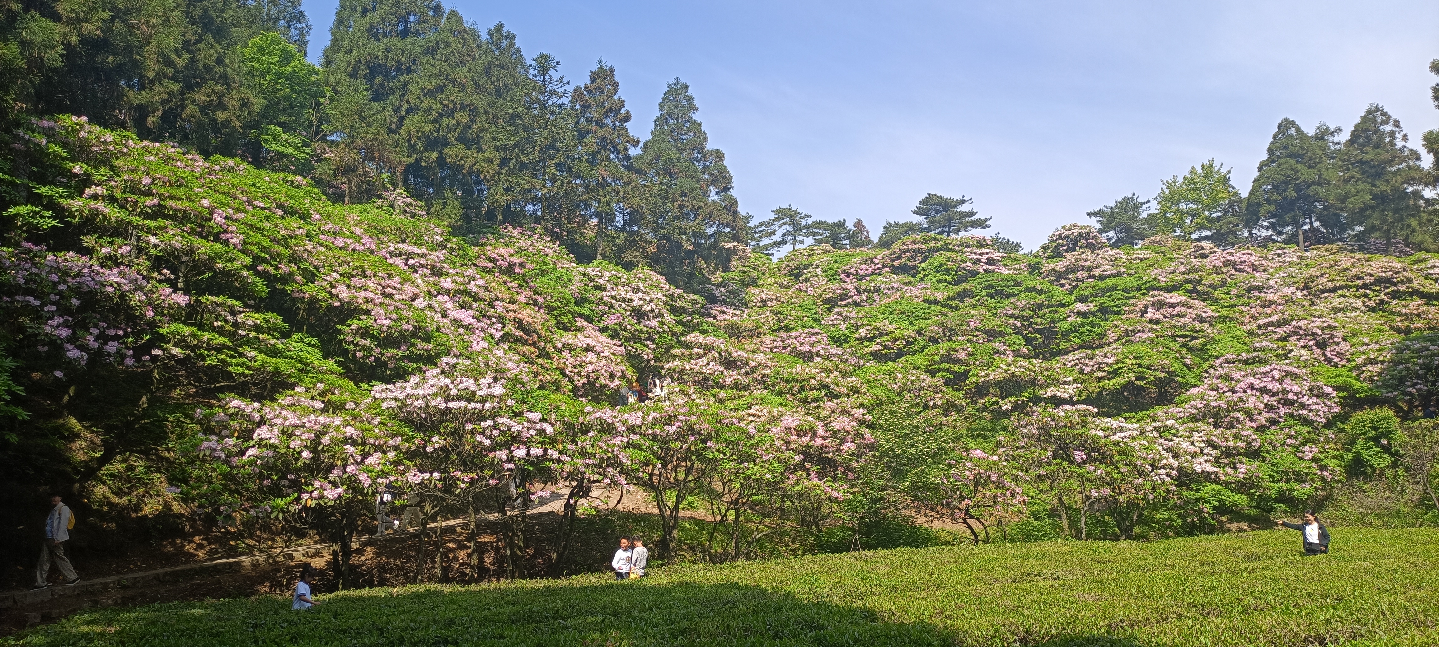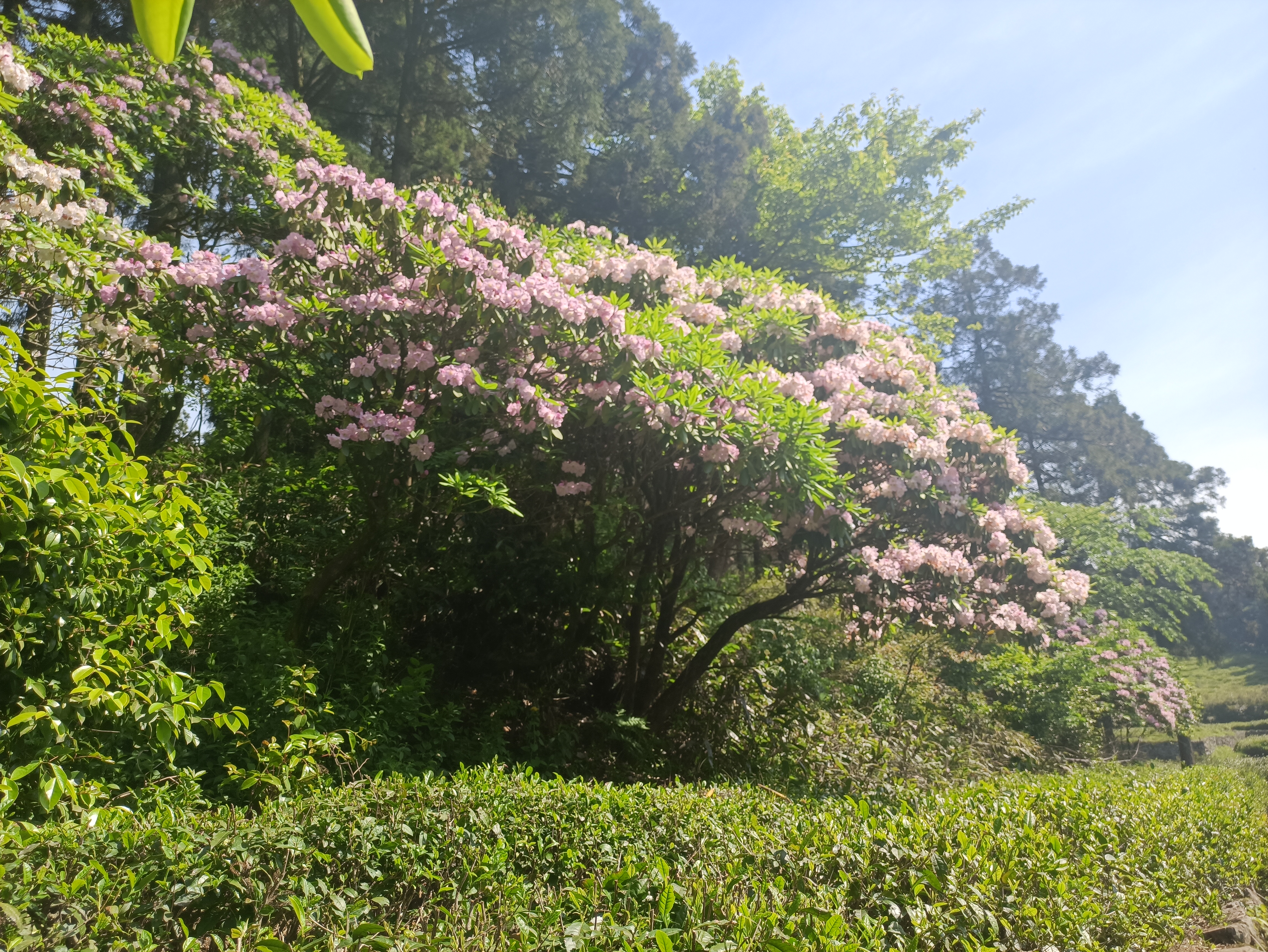 云中赏花去 庞文辉 赏花的习俗,古来就有,以春天最盛。 唐代杨巨源《城东早春》中即有妙句:“诗家清景在新春,绿柳才黄半未匀。若待上林花似锦,出门俱是看花人。” 早春天暖,嫩了新叶,开了百花,花有色又有味,伴着春光中的风呼鸟鸣,感官中令人悦耳的声也有了。赏花,赏的便是这一份声色味俱全的感官之悦。那些走出门的赏花人,沐着春风,欣赏上林花似锦,不仅感官舒畅,内心想必也会因这芬芳的润泽,而充盈满足起来。 至五月,农历多是四月之初,人间芳菲已遍数开过,终于要轮到那高山上的仙葩。其中,以云锦杜鹃为最。 云锦杜鹃长在高山云端,捱过凛凛严冬与昼夜暖寒交错的初春,终于等到气候温暖,宜人也宜花。此时它们蜷缩了近八个月的花苞,如同约好一般,突然某一刻便肆意地绽放开来。深入云天的高山之上,自此也有了春天。 去华顶之前,云锦杜鹃我并未见过,只是早有听说。这花在天台一带主生于华顶峰上,海拔近千米的山巅处,“盛开时花大如碗,灿若云霞,所以叫云锦杜鹃”,又有说它“苍干如松柏,花姿若牡丹”,为我国特有珍稀树种。《中国高等植物图鉴》中,记载数百种杜鹃花,其中魁首,便是云锦杜鹃。 华顶山上,云锦杜鹃多集中于西园。走游步道,曲折几回,便可看见成片杜鹃林。繁花如海,几乎占尽半壁山坡,望眼极为震撼。一片锦绣,满山嫣红姹紫,令人不禁感慨,花的盛开,竟如此耀眼! 无数杏白、粉色或玫红的云锦杜鹃,熙熙攘攘从枝头的叶片中间钻出来,迎着明媚春日,自在舒展。一朵花牵着另一朵花,一棵树挽着另一棵树,它们不挑地,就那么随意散漫长在土坡上。一片地就有数百棵,一树花就有上千朵,密密麻麻、摩肩擦踵、自下而上地长向更高的峰峦,将这一片原本青绿苍翠的高山云端,织成一匹绣满各色繁花的华美绸缎。 看花人们,从五湖四海过来。进山林,走步道,穿行茶园,树丛与花间,心情仿佛受到花开感染,笑容一齐绽开。她们将笑脸并入云锦杜鹃的枝头与花下,和这春天收尾的景色合成同一幅影像。 古人好出游,尤为喜欢赶在暮春时节外出,欣赏这春末景色。 “暮春者,春服既成,冠者五六人,童子六七人,浴乎沂,风乎舞雩,咏而归”,一个咏字,让出游乐趣散发到了极致,唯有歌声,能流露内心愉快的真性情。 茶园里,看花人兴致起来,男一群,女一群,隔着两排茶树,竟相互对起歌来: 唱山歌来/唱山歌来/嗨/这边唱来那边和/山歌好比春江水/嗨/…… 众人皆笑,纷纷喝彩鼓掌。 同行提及,早年华顶山上,云锦杜鹃花开还要更盛,比如今足足大上一轮。问起原因,她笑着解释说,当年华顶山上,多是农户散养的黄牛,牛四处闲走,吃草屙粪,这牛粪很是肥土,云锦杜鹃得益于牛粪滋养,花形开得更加阔大。 往事让人听得入迷,不觉便会遐想,那时的云锦杜鹃,花开时会有多大?如今花如小碗,像时下之人营养过剩下,一只小碗,足以饱腹的稍许克制,那时的花是否就是一个个大碗,和那个年代干劲十足吃饭用大碗,性格豪放敞开一样? 一代人有一代人的经历,一代人看一代人的花。 花还在山上,在树上,曾相伴共生的牛却早已消失不见。随着华顶旅游开发,像牛粪之类农耕时代常见的物事渐渐罕见,连牛也被专门安置于养殖场中圈养,自然就跟这云锦杜鹃失去了关联。云锦杜鹃长在树上,开得如此高,是否也有曾经漫长岁月里与牛同处的影响? 兴许牛常年吃草觉得寡淡的慌,便抬嘴去嚼树上的云锦杜鹃花。毕竟坊间的牛早有嚼牡丹的前科,此番嚼食杜鹃好像也不无可能,因而慢慢地,就将长在低处的杜鹃全啃完了。 云锦杜鹃也是有灵,从此便更使劲地伸长枝干,将花长往高处,长到牛垫脚拱嘴气急败坏都触碰不到的地步,才傲然停下,搂着一树锦绣俯瞰下方。 下方,是如织的游人,是陡峭的山道,是幽不见底的深谷。云锦杜鹃生长于华顶山上,常是孤高又清冷的,仿若云中隐士,疏离尘嚣,才有李白为之慨叹“四面连环八面山,山中少有行人路”。 古时山高路远,高远之山,就是仙山。仙山者,也被归入到传统意义里“天”的一部分,属人间与仙界的临界点。故徐霞客登上华顶,才喟然感慨“华顶山之高也,去天非远”。如今看来,华顶海拔一千多米,在浙东一带,的确属于出类拔萃的存在,但在全国,尤其中西部众多高山之中,并不算高。 古代交通不便,翻山越岭通常都得以昼夜来计,因而如华顶之高,也曾让无数古人叹为观止,成为人迹难至之地。唯独一代代游侠、隐士、僧道、慕名的诗人们,才会不辞艰险上来,一睹这名山风采。他们看遍名山,更好猎奇,听闻奇景,便心痒难耐毅然跋涉前行。 王荆公游褒禅山时,曾感悟到一番旅游信条——“夫夷以近,则游者众;险以远,则至者少。而世之奇伟、瑰怪,非常之观,常在于险远,而人之所罕至焉,故非有志者不能至也。”这或许便是对他们天台山毅行的精彩总括。 历代文人的一次次毅行,让这华顶之上的云锦杜鹃,更被世人所知。东晋孙绰在《游天台山赋》中赞美“八桂森挺以凌霜,五芝含秀而晨敷……建木灭景於千寻,琪树璀璨而垂珠。”琪树即神话传说仙山上的玉树,因过于久远,已经难以考证玉树的本尊,但目极华顶,能称得上玉树的,应就云锦杜鹃一类吧。 清初张联元,曾作诗一首,感叹别名叫红踯躅的云锦杜鹃没有被收入皇家园林,诗曰:“翠岫从容出,名花次第逢。最怜红踯躅,高映碧芙蓉。琪树应同种,桃源许并秾。无人移上苑,空置