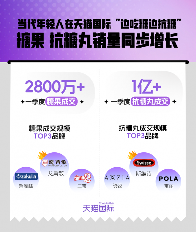 《糖果卖出2800万,抗糖丸卖了1个亿,当代年轻人在天猫国际“边吃糖边抗糖”》 既要得到纯粹的摄入糖分的快乐,又要通过控糖获得漂亮和健康,这届年轻人跟糖“相爱相杀”多年,“朋克式抗糖”终于成了一个微妙的平衡点——一边吃糖一边抗糖,成了这届年轻人对自己最大的成全。 根据天猫国际公布的最新数据,越来越多年轻人正在“边吃糖边抗糖”。2024年第一季度,天猫国际上糖果成交总额超过2800万,比去年同期上涨39%;抗糖丸类产品成交持续增长,成交规模突破1亿元。 “功能性”糖果颇受这届年轻人喜爱。所谓“功能性”糖果,天猫国际的食品行业小二告诉记者,指的是除了提供糖分,还能给人体提供特殊功能支持的糖果。近三个月,天猫国际上成交增速最快的进口糖果品牌,是来自英国的GoFigure。这种“功能性”糖果被称为“饱饱糖”,商家称,糖中的WellBiome成分能增强饱腹感,降低人们对甜食和食物的渴望。今年一季度,“饱饱糖”成交额比去年同期增长519%。 德国糖果品牌Zirkulin哲库林和英国糖果品牌Strepsils使立消都关注咽喉健康,今年第一季度,他们在天猫国际上的销量分别增长244%和169%。“春夏之交,换季时易受感冒侵扰,润喉糖是目前糖果商品中最受欢迎的品类。”天猫国际食品行业的小二说,Zirkulin哲库林的润喉糖是今年第一季度成交最多的糖果单品,成交额突破300万。 除了“功能性”糖果,好吃的糖果始终是让人无法抗拒。德国天然果汁糖果品牌Nimm2二宝,第一季度在天猫国际成交超过700万,也比去年同期增长49%。 糖果热销背后,人们要对吃糖的“罪恶感”加以弥补,紧跟着的就是抗糖丸销量增长。随着人们对健康生活的更强烈的追求,“抗糖”已然成为一种生活方式和健康理念。 根据天猫国际公布的最新数据,过去三个月,天猫国际上的抗糖丸类产品成交仍在持续增长,成交规模突破1亿元。进口抗糖丸类产品销量最好的品牌来自澳大利亚、日本、西班牙和法国。其中TOP级保健品牌Swiss斯维诗,2024年开年至今抗糖丸单品成交破千万。 “抗糖抗的只是‘过度糖化’。”天猫国际保健行业小二告诉记者,使用抗糖丸是辅助降低AGEs(注:晚期糖基化终末产物,是皮肤老化的杀手)生成的一种手段,建议大家制定科学均衡的食谱,控制压力,保证充足的睡眠,培养健康“抗糖”的生活方式。