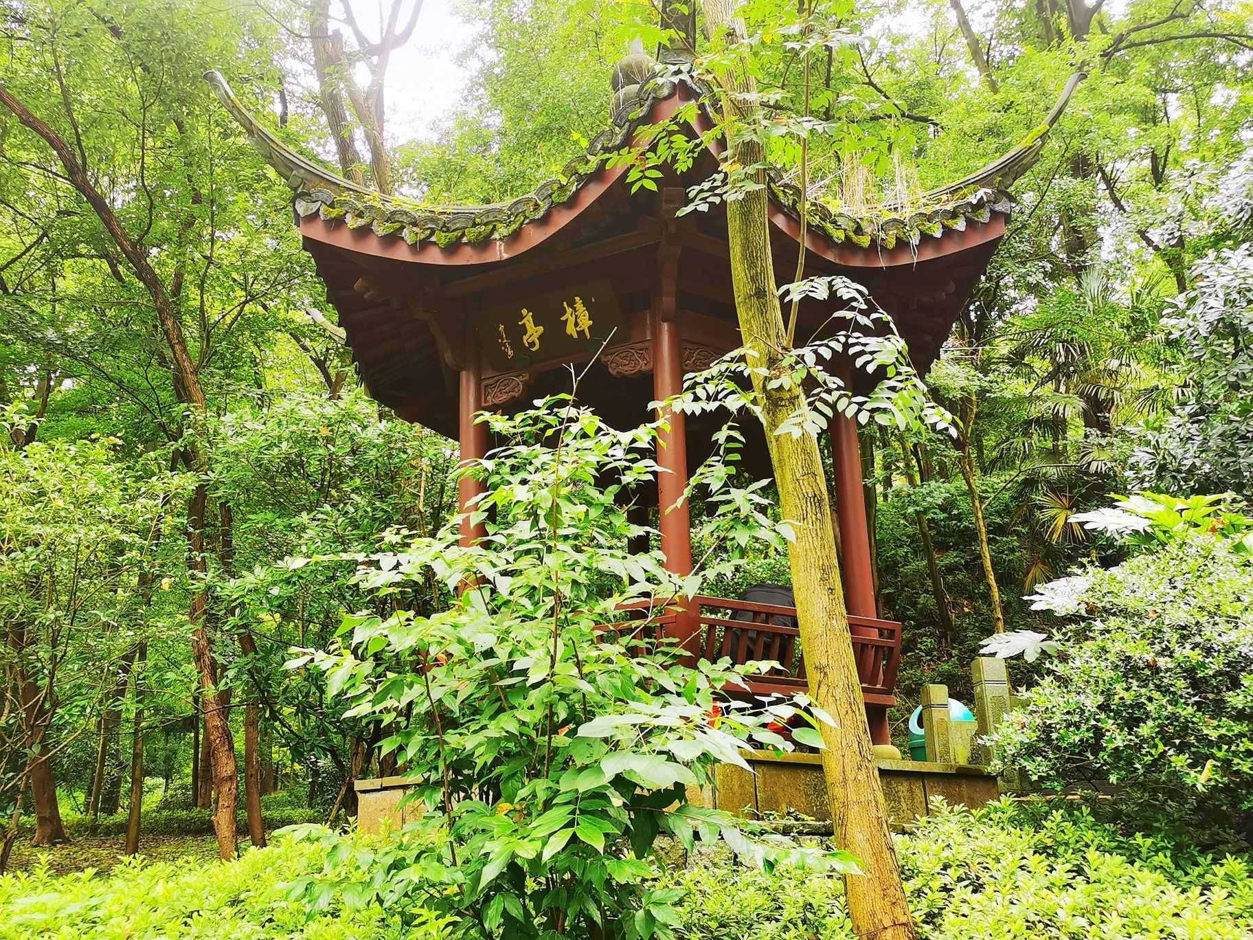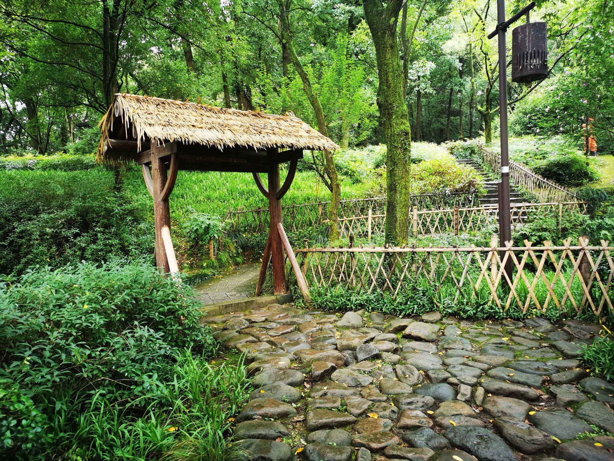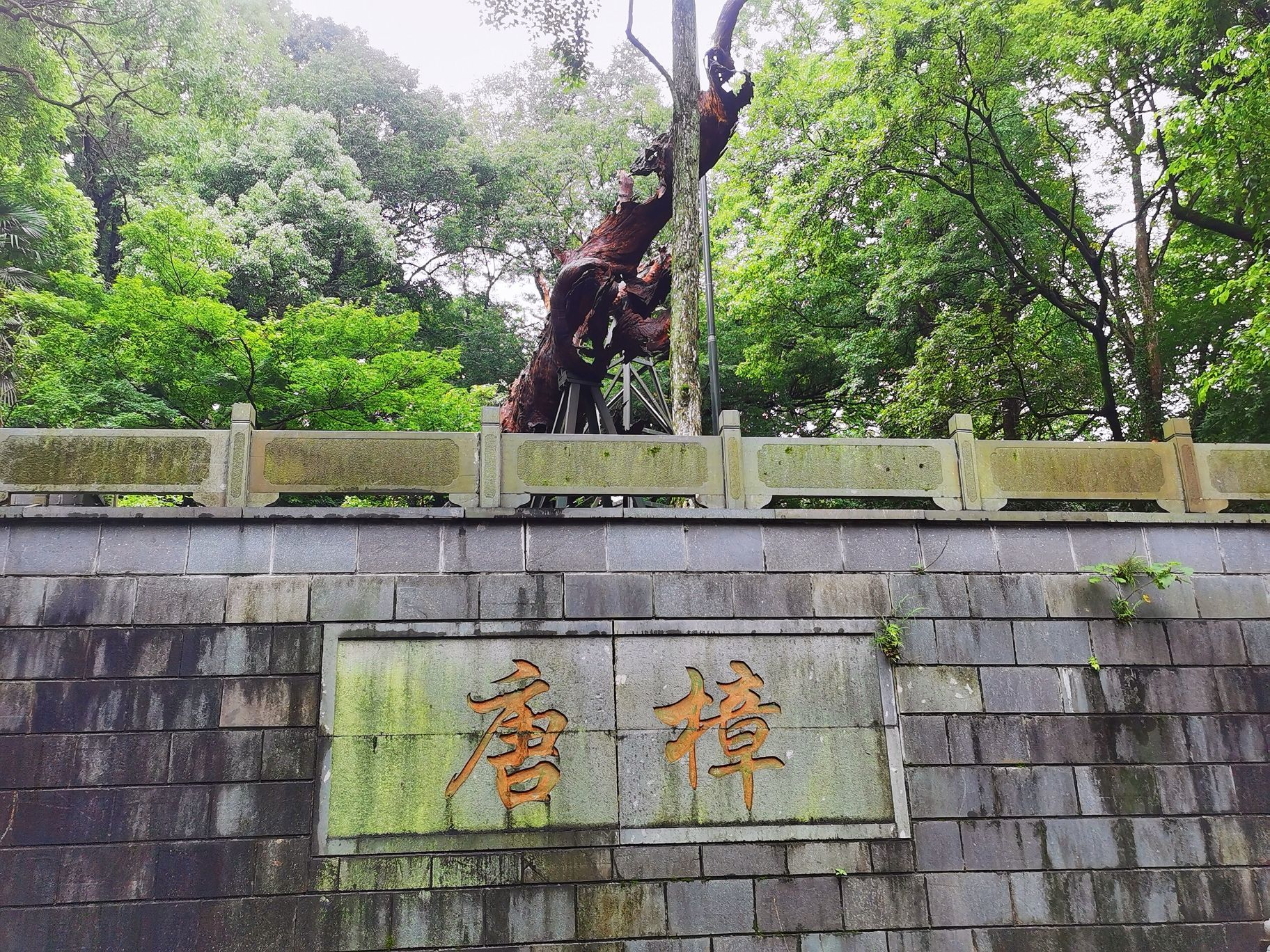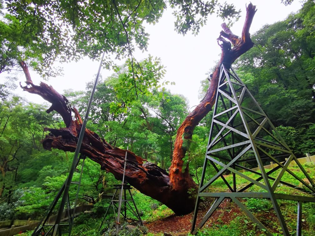 拜谒神秘的长者/钱江湾 春末夏初的一个午后,我游走在西湖的群山之下,拨开雨后薄薄的雾霭,专为了拜谒一位神秘的老者,他早已过了耄耋之年,独自站立在莽莽的湖山之中,伴日月星辰看人间万象… 沿着窄窄空无一人的法相巷,穿过六通宾馆的大门,快到山脚处,再往上爬就可达南高峰,向右几步路就醒目地看见几米高的石坎,斑驳陆离的墙上刻有“唐樟”两字。举头仰望,石碑上面静静站立的这棵古树,身上刻满了一道道深深的年轮印记,树芯已风化成一个个幽深的洞穴,外表真心“其貌不扬”!而他,就是我今天要拜谒的主人,他的名字叫“法相唐樟”,古树编号是“281”。 这是杭州记载在册的树龄最大的古香樟,树高约17米,冠幅400多平方米。据测算,这是在唐朝时种下的,掰指算起来他今年应该有1070多岁高龄了。唐朝时古樟的旁边,也就是现在的六通宾馆一带,这里当时有个法相寺的,所以把他叫作“法相唐樟”。 透过绿树掩映的两侧,细细端看唐樟的外表,整棵唐樟的树干分两个枝杈:一枝前倾往南似是朝天仰视,其实这一枝在前几年的高寒冷冻天气时已经枯萎而亡了,他仰望的姿态已成凝固的绝唱。另一枝偏北方向的好似在沉吟静思,从模样看与南向的没多少区别,只有将视线收落到他的稳如磐石的根部,看到三棵茁壮成长的小树苗,你才感觉到他的生命已奇迹般的在传承中延续了。无论南北两大枝,光秃秃的树身上已没有了新叶,单是靠他自己羼弱的力量已经撑不住整个沉重的身躯,所以园林部门在树下架了几百斤的钢架,帮衬着他在漫漫无边的岁月中踽踽前行。 这十几年来,杭州有关部门为了这棵古樟的养护可算是不遗余力,专门建团队,搞特护,防寒灾,勤体检,呵护有加。大概是为了方便游客全方位观瞻吧,绕着唐樟四周都修了台阶。 刚下过雨的台阶长满了厚厚的青苔,加之此时又没有游客走动,路上非常的滑。我小心翼翼地步行在唐樟的四周,一遍又一遍默默地凝望着他貌似气息奄奄的样子。看着已长睡的南枝心情就异常的悽惶和沉重,感觉此时的唐樟象是一个古朴、苍老的耋耄老人,从远古走来,带着岁月的浸洗和熏染,沿着山道蹒跚而行,再也迈不开脚步了;看着北枝高扬的头颅,又觉得古树的生命力真是顽强,虽经多少次的雷打电霹,但是他仍然怀着“亦余心之所善兮,虽九死其犹未悔”的信念,并没有轻易跌落下来,而是努力地支撑着,渴求着阳光雨露的滋润,枯木逢春再发新芽,那树根长出的三棵幼苗真是生命中最好的安排,我为古树终于可以在迟暮之年安祥地“含饴弄孙”而格外的欣喜! 我从不同的角度对着唐樟拍摄,时而全身照,时而半身照,或子孙特写照,在不停的拍摄中与他作着长时间无言的交流。在我的眼中,他分开的两枝都还是在山风中高高飞扬着的。 一千多年前,究竟是谁种下了这棵树呢?史料没有记载已无法考证,再也没从知晓。但按照国内其他地方古树常生于古寺周边分析,大致可以推测可能是法相寺的某位僧人种下的。法相寺在当年也叫长耳寺。据说,寺里有位师父“生有异相,耳长九寸,上过于顶,下可结颐,号长耳和尚”。他德高望重,周围百姓顶礼膜拜,法相寺香火旺盛,在杭州名气很大。“人事有代谢,往来成古今”。昔日的法相寺不知何时早已湮灭于风尘之中,千年之后,老树还在,斯人早逝。可长久以来,疼惜和敬仰古树的人,从来不曾断绝过。 在唐樟平台左侧下方,盖有一个小小的尖角翘起的樟亭。这是晚清诗人陈三立为这棵唐樟募捐而建的亭子。陈三立是对唐樟最情有独钟的诗人了,还专门写了一篇《樟亭记》,说目的是为了观娱唐樟的游人遮风挡雨而筑亭在旁边。陈三立在现代人的心目中已不怎么有名,但他有个著名的国学大师的儿子叫陈寅恪知名度就很高了,他是清华大学的“四大哲人”和“四大史学家”之一。 陈三立是一位热爱杭州的文人,也是一位积极参与变革维新的爱国者。1937年“七七”事变后,他因日军占领北平,决绝不食舍生取义而亡。死后过了十几年,后人按他生前之愿将他归葬杭州的九溪十八涧。陈三立算得上是一个有情怀有节气的仁人,他对唐樟的感情也发自肺腑,他在《法相寺樟亭》中写道: “劫末重过抚一亭,雨中漏入万峰青。 虬枝历与雷霆斗,鸾盖余遥罔两停。 游侣飘零兼死去,老怀郁勃遂沉冥。 天留把臂牵肠地,壁记犹堪照数声”。 他诗中对植树的游侣发出了由衷的感叹,专门形象地描述了唐樟苍老的枝桠与雷火搏斗的场面,真可谓九死一生,可歌可泣! 按史实考证起来,乾隆皇帝应该也是对唐樟有过一面之缘的。我沿着唐樟左边的小石径走了几十米,周边林木葱郁,茂密的林荫下凄然而立着几间小木屋,屋内空空,看样子平时是没几个人来的,门牌匾上写着“留余山居”四个大字,相传乾隆皇帝在乾隆二十二年,即公元1757年来到这里喝茶,给老房子赐的名,是当时的西湖十八景之一。 当年这里奇石林立,有一泉从石壁下注,高有数丈,飞珠喷玉,直落崖石,水石相击,声若琴音。所以“留余山居”的楹联将此概括为“来去无踪云移絮影, 抑扬有致泉起琴声”倒是十分的形象而贴切。从当年的游历线路示意图看,乾隆来此赏景游玩,刚好从唐樟面前而过,一定是看到过唐樟的模样的。作为万民景仰的时年47岁的乾隆皇上,见到已年高近八百岁的古樟,到底是谁膜拜谁呢?当年的一幕无从猜想,这位几乎每日发诗象发朋友圈
