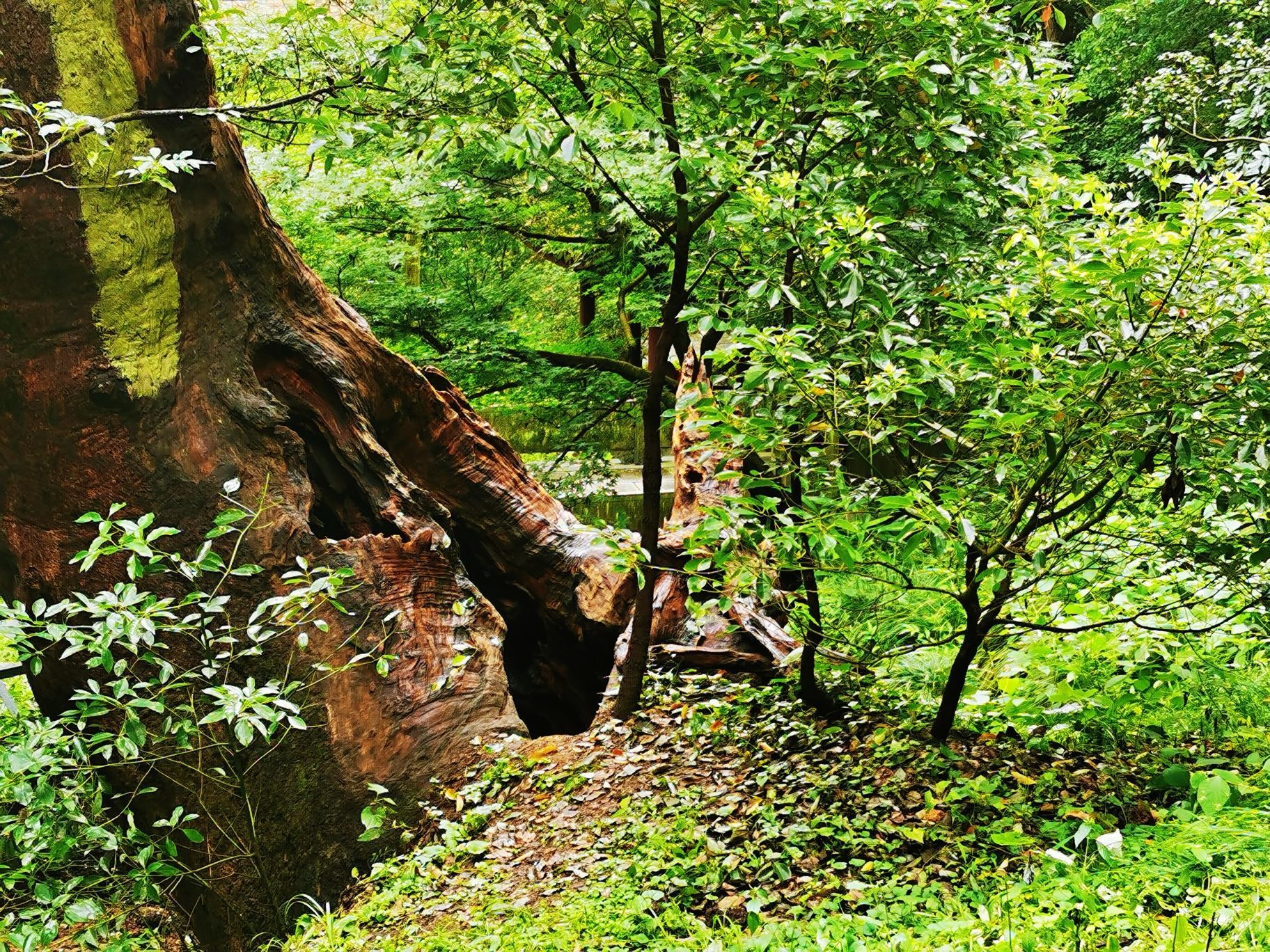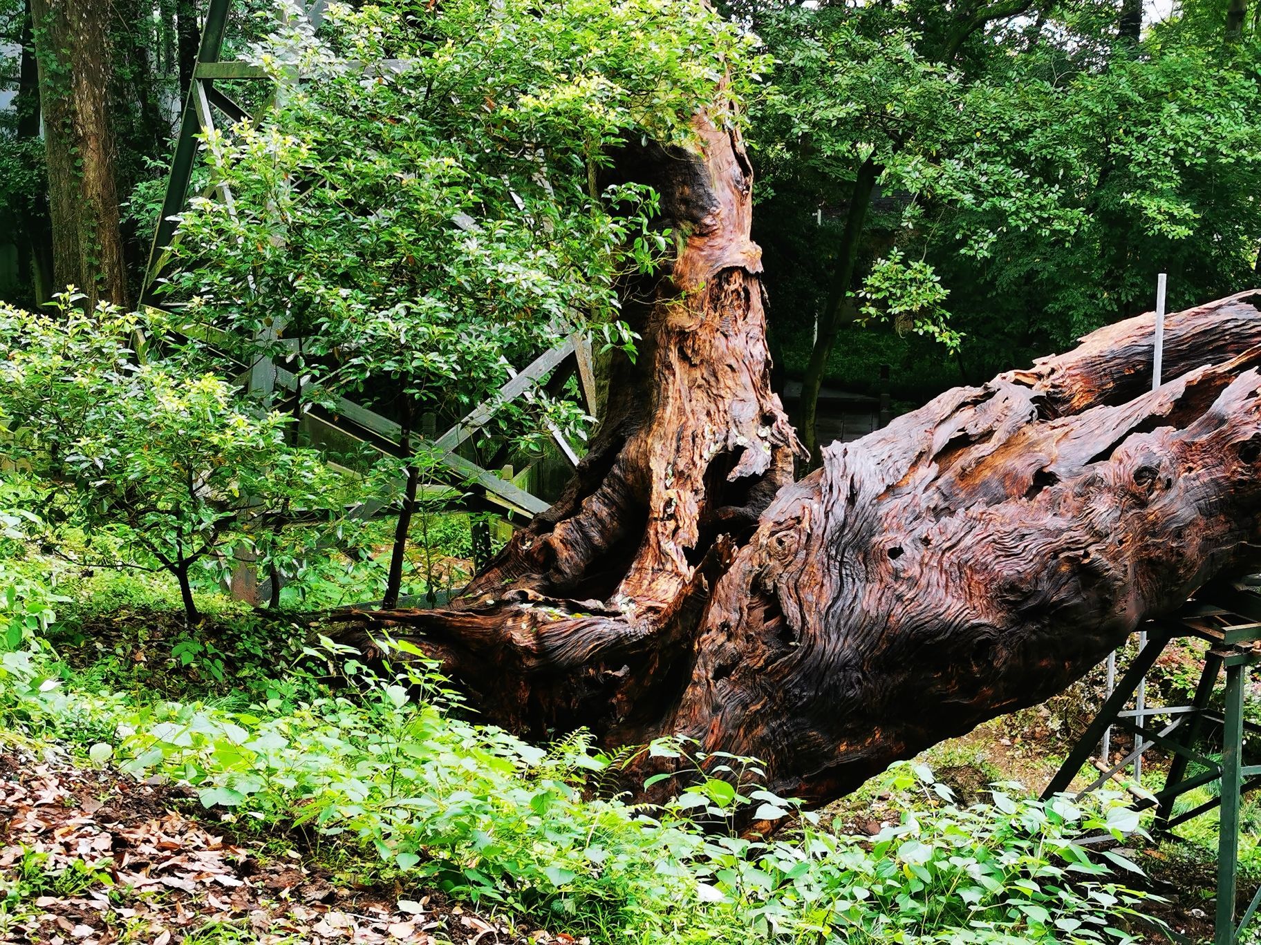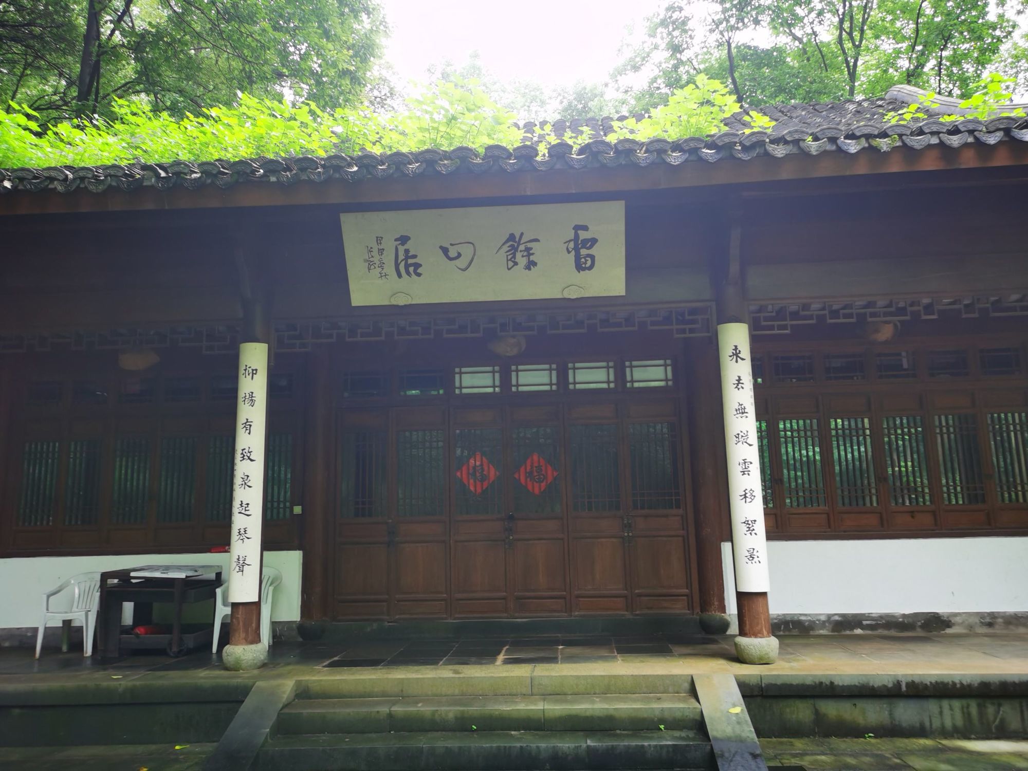 拜谒神秘的长者/钱江湾 春末夏初的一个午后,我游走在西湖的群山之下,拨开雨后薄薄的雾霭,专为了拜谒一位神秘的老者,他早已过了耄耋之年,独自站立在莽莽的湖山之中,伴日月星辰看人间万象… 沿着窄窄空无一人的法相巷,穿过六通宾馆的大门,快到山脚处,再往上爬就可达南高峰,向右几步路就醒目地看见几米高的石坎,斑驳陆离的墙上刻有“唐樟”两字。举头仰望,石碑上面静静站立的这棵古树,身上刻满了一道道深深的年轮印记,树芯已风化成一个个幽深的洞穴,外表真心“其貌不扬”!而他,就是我今天要拜谒的主人,他的名字叫“法相唐樟”,古树编号是“281”。 这是杭州记载在册的树龄最大的古香樟,树高约17米,冠幅400多平方米。据测算,这是在唐朝时种下的,掰指算起来他今年应该有1070多岁高龄了。唐朝时古樟的旁边,也就是现在的六通宾馆一带,这里当时有个法相寺的,所以把他叫作“法相唐樟”。 透过绿树掩映的两侧,细细端看唐樟的外表,整棵唐樟的树干分两个枝杈:一枝前倾往南似是朝天仰视,其实这一枝在前几年的高寒冷冻天气时已经枯萎而亡了,他仰望的姿态已成凝固的绝唱。另一枝偏北方向的好似在沉吟静思,从模样看与南向的没多少区别,只有将视线收落到他的稳如磐石的根部,看到三棵茁壮成长的小树苗,你才感觉到他的生命已奇迹般的在传承中延续了。无论南北两大枝,光秃秃的树身上已没有了新叶,单是靠他自己羼弱的力量已经撑不住整个沉重的身躯,所以园林部门在树下架了几百斤的钢架,帮衬着他在漫漫无边的岁月中踽踽前行。 这十几年来,杭州有关部门为了这棵古樟的养护可算是不遗余力,专门建团队,搞特护,防寒灾,勤体检,呵护有加。大概是为了方便游客全方位观瞻吧,绕着唐樟四周都修了台阶。 刚下过雨的台阶长满了厚厚的青苔,加之此时又没有游客走动,路上非常的滑。我小心翼翼地步行在唐樟的四周,一遍又一遍默默地凝望着他貌似气息奄奄的样子。看着已长睡的南枝心情就异常的悽惶和沉重,感觉此时的唐樟象是一个古朴、苍老的耋耄老人,从远古走来,带着岁月的浸洗和熏染,沿着山道蹒跚而行,再也迈不开脚步了;看着北枝高扬的头颅,又觉得古树的生命力真是顽强,虽经多少次的雷打电霹,但是他仍然怀着“亦余心之所善兮,虽九死其犹未悔”的信念,并没有轻易跌落下来,而是努力地支撑着,渴求着阳光雨露的滋润,枯木逢春再发新芽,那树根长出的三棵幼苗真是生命中最好的安排,我为古树终于可以在迟暮之年安祥地“含饴弄孙”而格外的欣喜! 我从不同的角度对着唐樟拍摄,时而全身照,时而半身照,或子孙特写照,在不停的拍摄中与他作着长时间无言的交流。在我的眼中,他分开的两枝都还是在山风中高高飞扬着的。 一千多年前,究竟是谁种下了这棵树呢?史料没有记载已无法考证,再也没从知晓。但按照国内其他地方古树常生于古寺周边分析,大致可以推测可能是法相寺的某位僧人种下的。法相寺在当年也叫长耳寺。据说,寺里有位师父“生有异相,耳长九寸,上过于顶,下可结颐,号长耳和尚”。他德高望重,周围百姓顶礼膜拜,法相寺香火旺盛,在杭州名气很大。“人事有代谢,往来成古今”。昔日的法相寺不知何时早已湮灭于风尘之中,千年之后,老树还在,斯人早逝。可长久以来,疼惜和敬仰古树的人,从来不曾断绝过。 在唐樟平台左侧下方,盖有一个小小的尖角翘起的樟亭。这是晚清诗人陈三立为这棵唐樟募捐而建的亭子。陈三立是对唐樟最情有独钟的诗人了,还专门写了一篇《樟亭记》,说目的是为了观娱唐樟的游人遮风挡雨而筑亭在旁边。陈三立在现代人的心目中已不怎么有名,但他有个著名的国学大师的儿子叫陈寅恪知名度就很高了,他是清华大学的“四大哲人”和“四大史学家”之一。 陈三立是一位热爱杭州的文人,也是一位积极参与变革维新的爱国者。1937年“七七”事变后,他因日军占领北平,决绝不食舍生取义而亡。死后过了十几年,后人按他生前之愿将他归葬杭州的九溪十八涧。陈三立算得上是一个有情怀有节气的仁人,他对唐樟的感情也发自肺腑,他在《法相寺樟亭》中写道: “劫末重过抚一亭,雨中漏入万峰青。 虬枝历与雷霆斗,鸾盖余遥罔两停。 游侣飘零兼死去,老怀郁勃遂沉冥。 天留把臂牵肠地,壁记犹堪照数声”。 他诗中对植树的游侣发出了由衷的感叹,专门形象地描述了唐樟苍老的枝桠与雷火搏斗的场面,真可谓九死一生,可歌可泣! 按史实考证起来,乾隆皇帝应该也是对唐樟有过一面之缘的。我沿着唐樟左边的小石径走了几十米,周边林木葱郁,茂密的林荫下凄然而立着几间小木屋,屋内空空,看样子平时是没几个人来的,门牌匾上写着“留余山居”四个大字,相传乾隆皇帝在乾隆二十二年,即公元1757年来到这里喝茶,给老房子赐的名,是当时的西湖十八景之一。 当年这里奇石林立,有一泉从石壁下注,高有数丈,飞珠喷玉,直落崖石,水石相击,声若琴音。所以“留余山居”的楹联将此概括为“来去无踪云移絮影, 抑扬有致泉起琴声”倒是十分的形象而贴切。从当年的游历线路示意图看,乾隆来此赏景游玩,刚好从唐樟面前而过,一定是看到过唐樟的模样的。作为万民景仰的时年47岁的乾隆皇上,见到已年高近八百岁的古樟,到底是谁膜拜谁呢?当年的一幕无从猜想,这位几乎每日发诗象发朋友圈