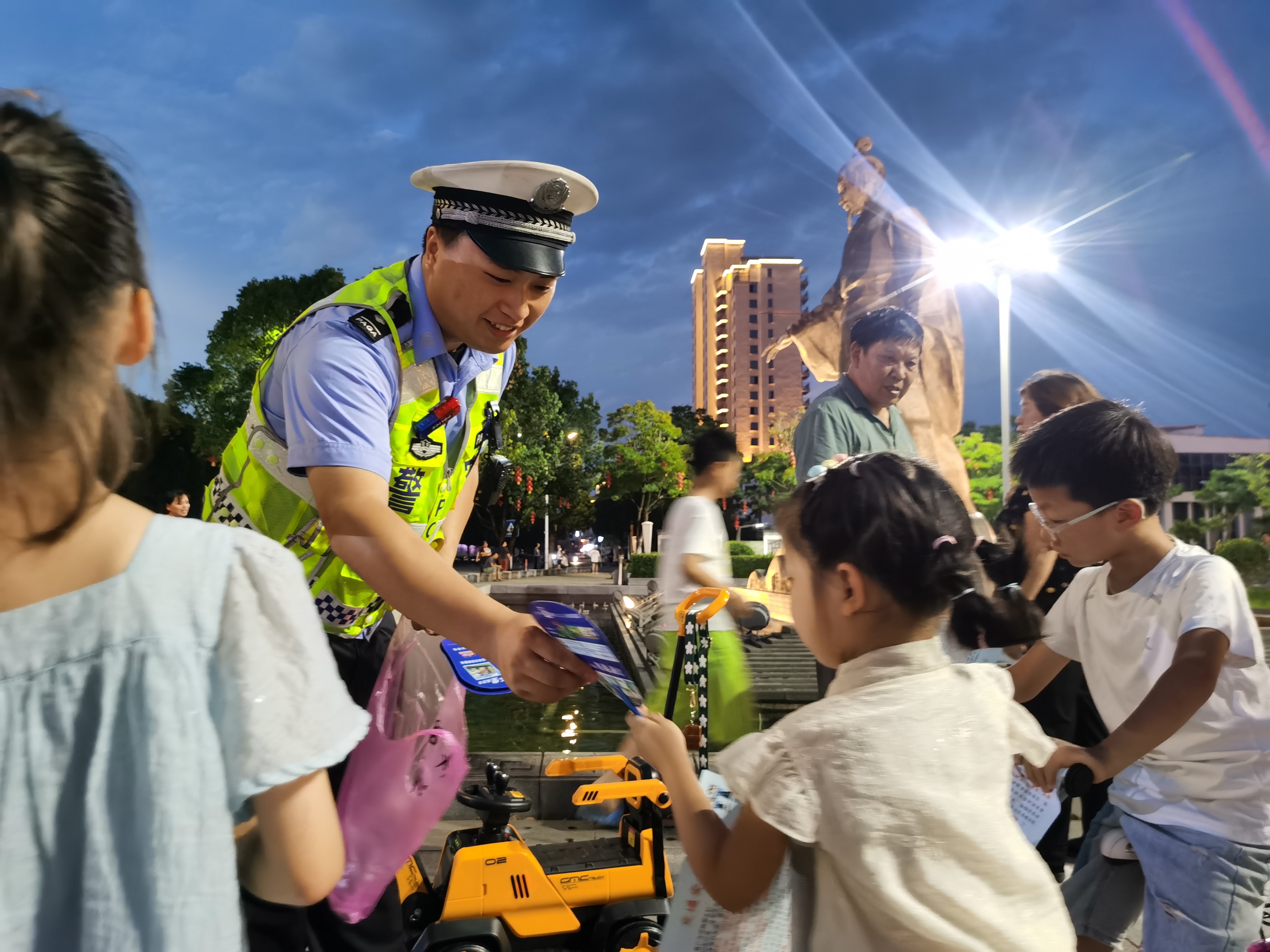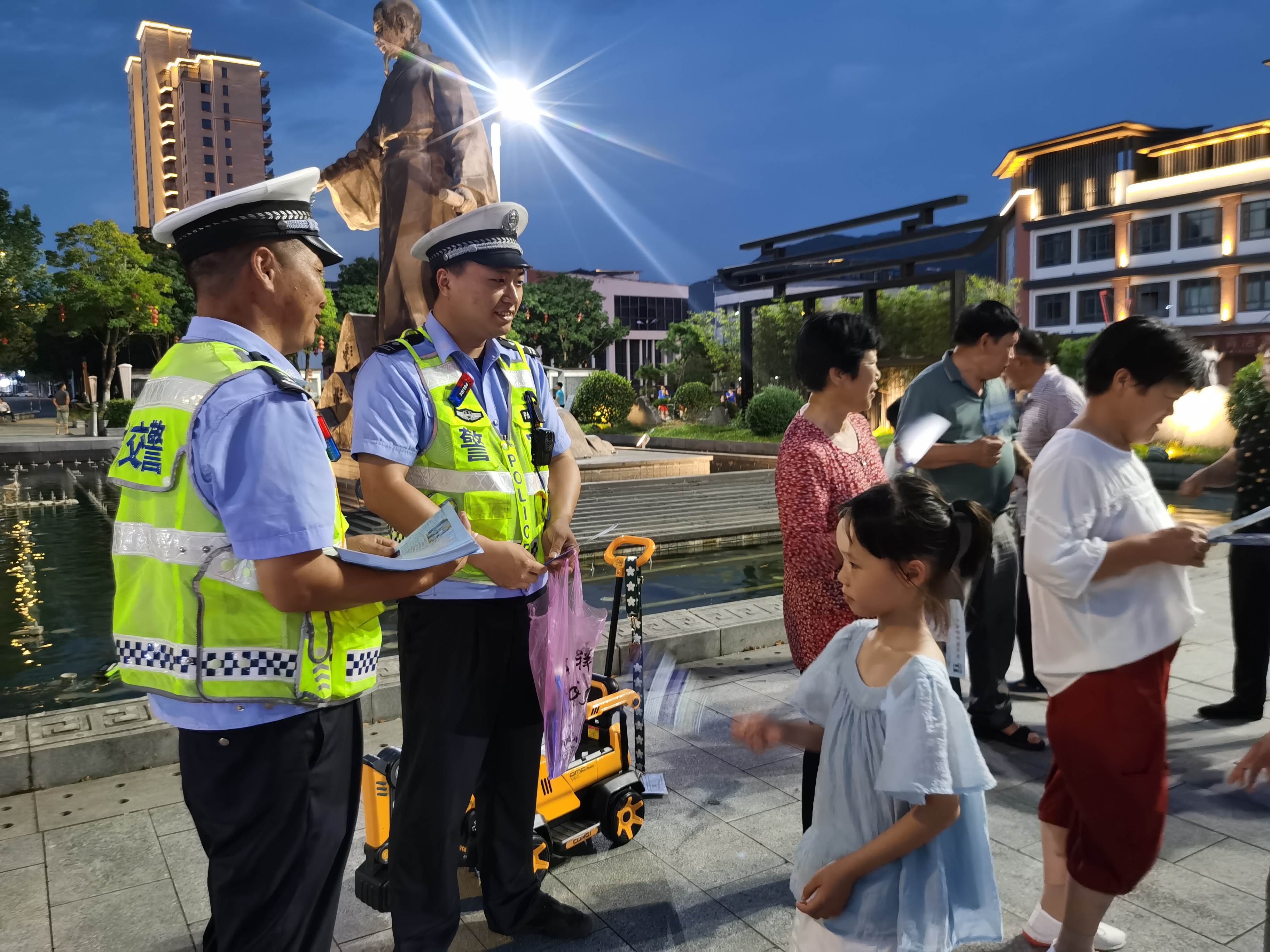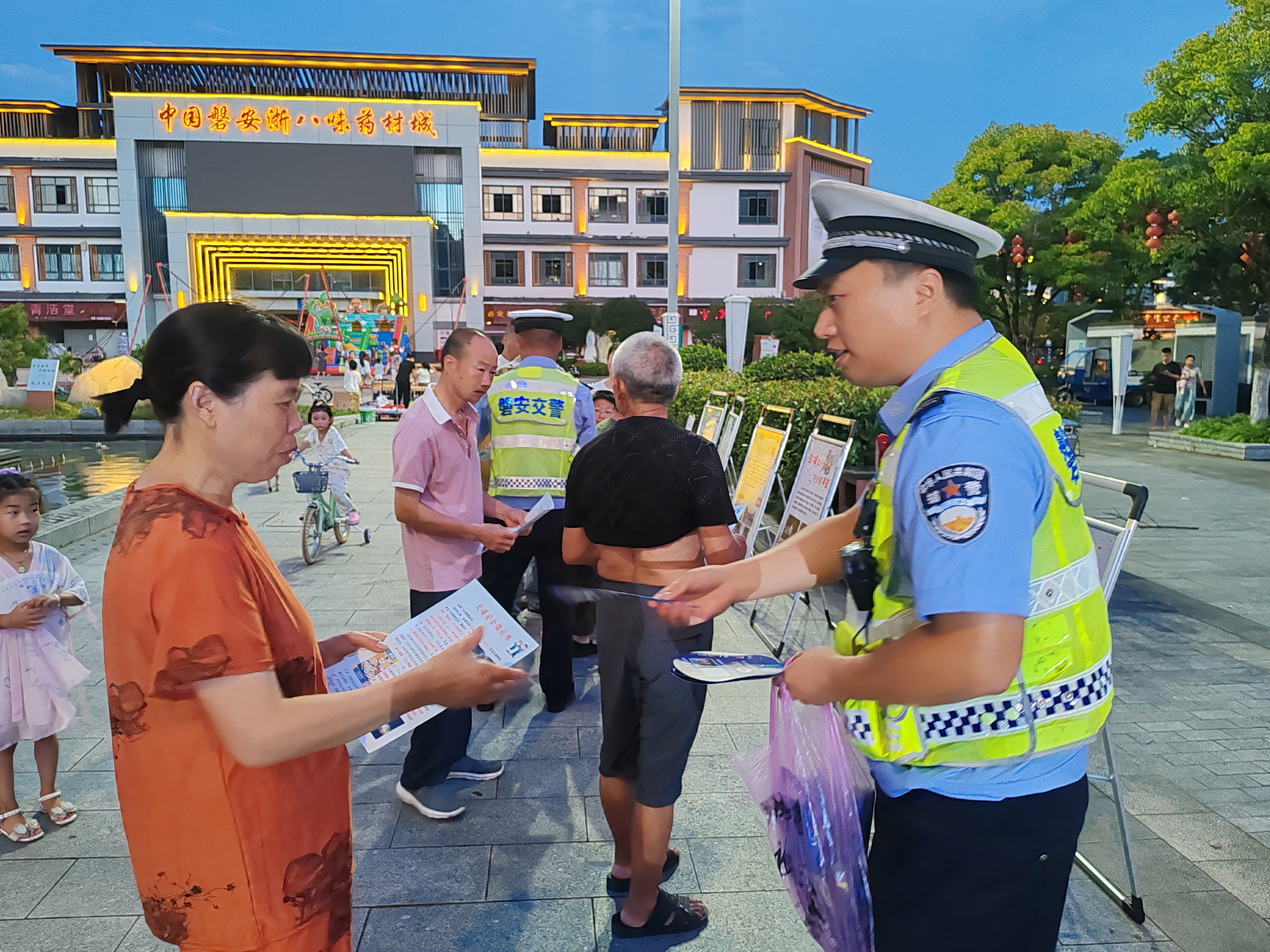 交警荧光进广场,奏响夏季平安曲(通讯员:孔秀红) 7月22日晚,磐安县新渥街道萧统广场出现了几抹靓丽的“荧光”,磐安县公安局交警大队新渥中队在农村群众夏日集中纳凉休闲的广场,巧用方言和群众一对一进行交通知识传递,同时结合近期发生的交通事故案例引导群众出行不乘坐三轮车、横过马路要确认安全再通过、骑行佩戴安全头盔等,让群众们在饭后散步休闲锻炼活动中潜移默化的提升交通安全意识。