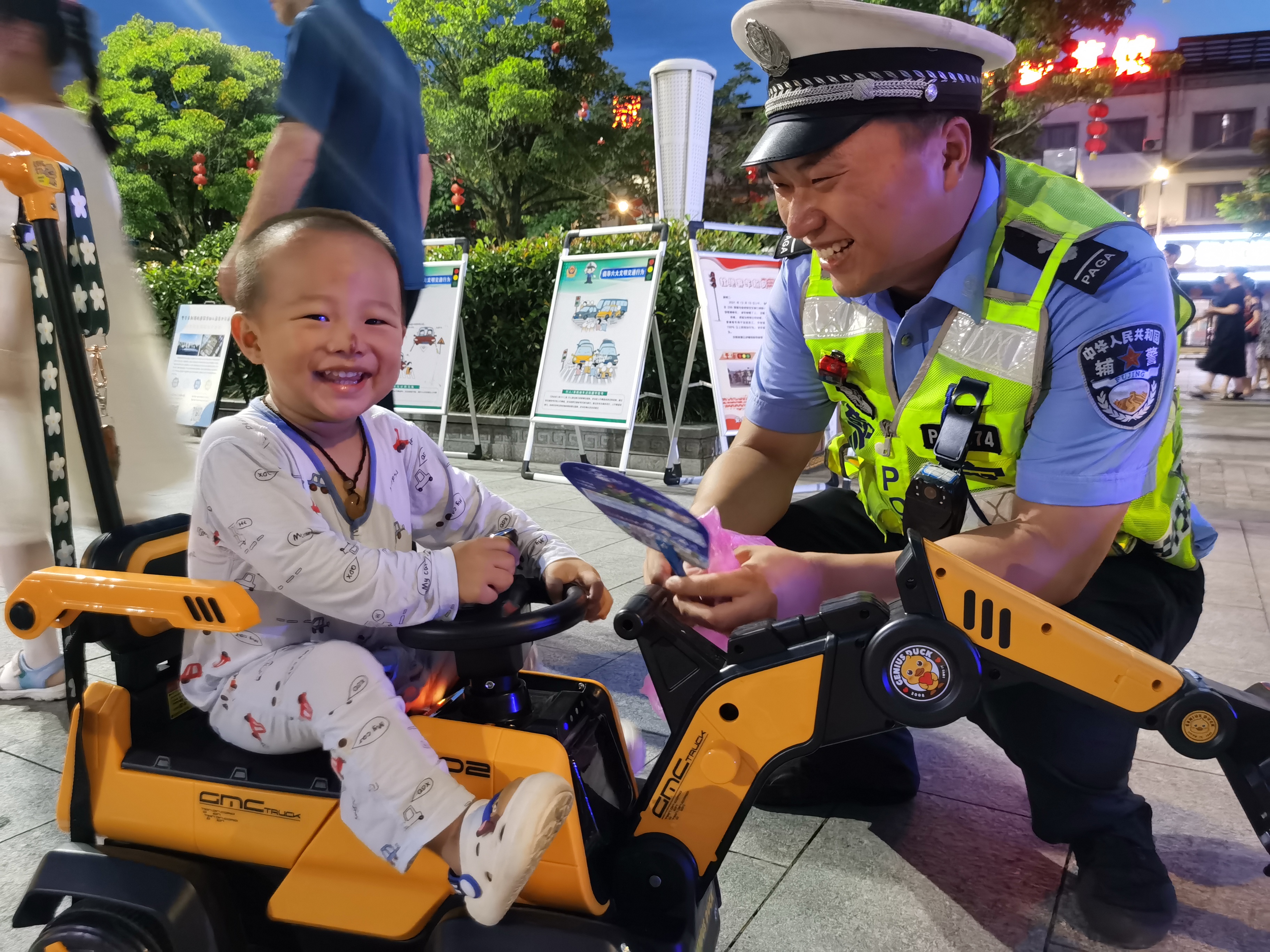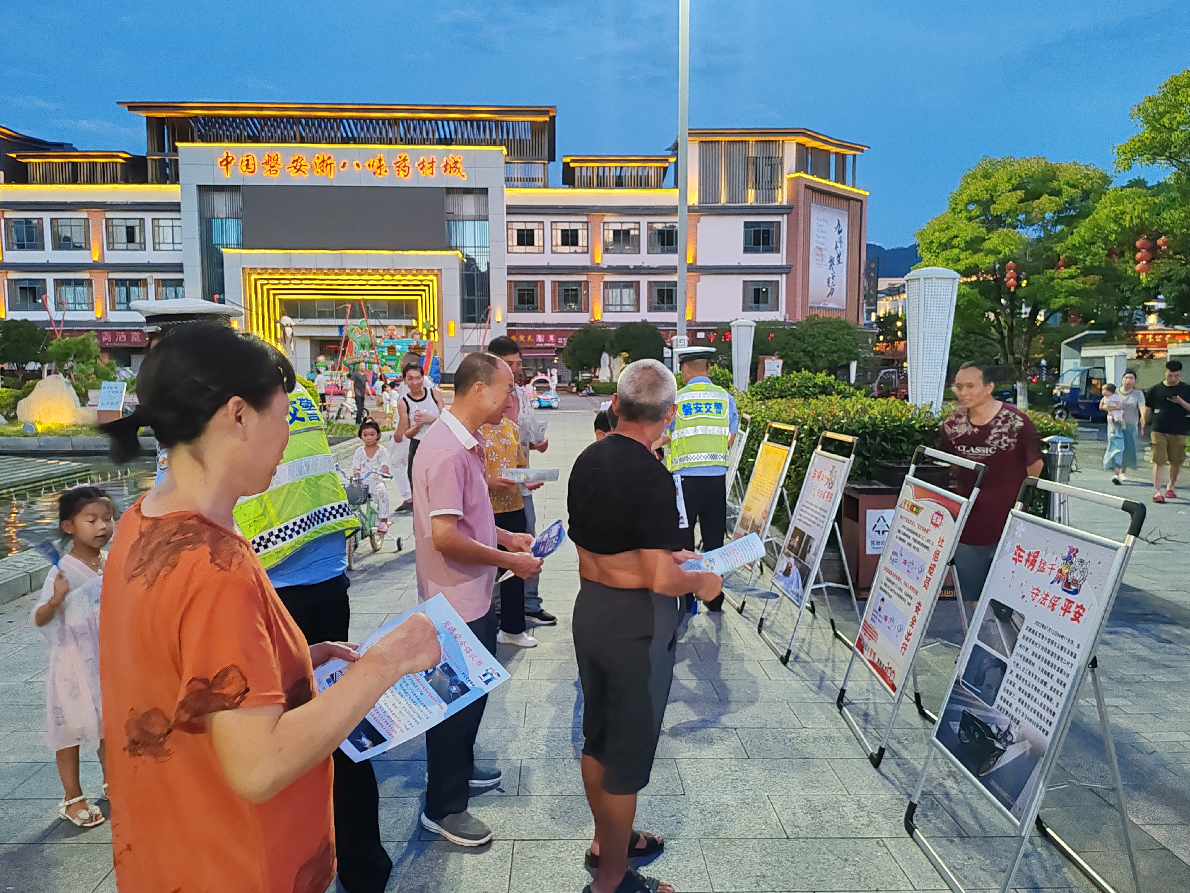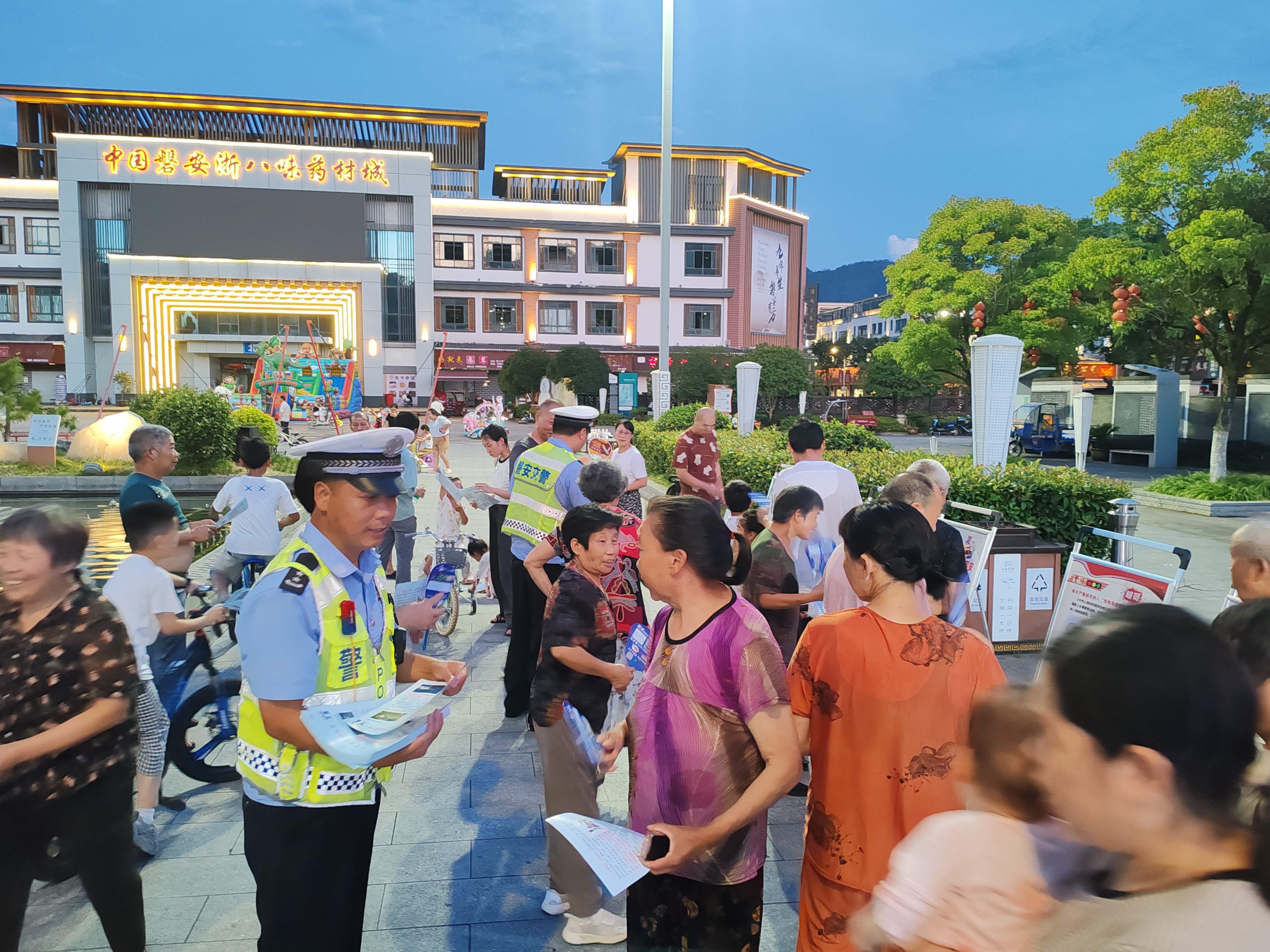 交警荧光进广场,奏响夏季平安曲(通讯员:孔秀红) 7月22日晚,磐安县新渥街道萧统广场出现了几抹靓丽的“荧光”,磐安县公安局交警大队新渥中队在农村群众夏日集中纳凉休闲的广场,巧用方言和群众一对一进行交通知识传递,同时结合近期发生的交通事故案例引导群众出行不乘坐三轮车、横过马路要确认安全再通过、骑行佩戴安全头盔等,让群众们在饭后散步休闲锻炼活动中潜移默化的提升交通安全意识。