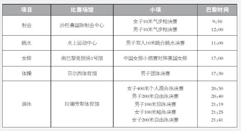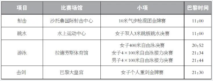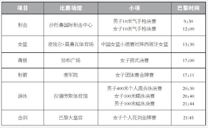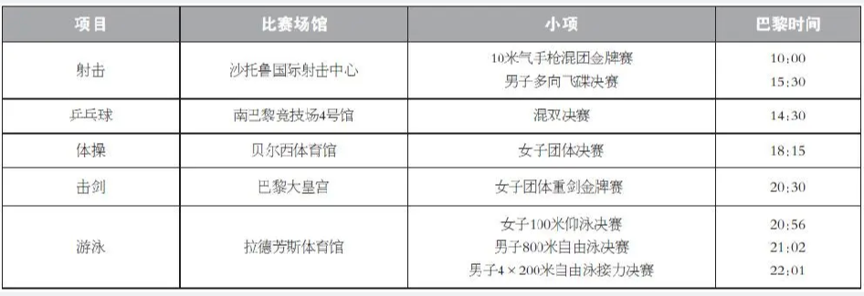 划重点!2024年巴黎奥运会每日精彩看点 离2024巴黎奥运会开幕只剩2天,万众期待运动员们的精彩表现。巴黎奥运会中国体育代表团共405位运动员,包括42名奥运冠军。巩立姣、马龙、汪顺、朱婷、孙颖莎、全红婵…不论是五战奥运的老将,还是冲劲十足的新人,这个夏天,他们将为中国队续写辉煌。 7月27日是巴黎奥运会开幕后第一个比赛日,将在射击、跳水、游泳、击剑、柔道等项目上产生多枚金牌。按照赛程安排,万众瞩目的本届奥运会首金将在10米气步枪混团项目中产生。 接下来,每日赛事都有精彩看点,以下列出中国队角逐冠军看点,奇鹭预祝中国体育健儿在本届巴黎奥运会中超越自我,谱写新传奇! 7月27日看点:奥运会首金花落谁家 7月28日看点:张雨霏覃海洋碧波逐金 7月29日看点:中国体操男团全力争金 7月30日看点:“莎头”组合瞄准乒乓球混双桂冠 7月31日看点:全红婵陈芋汐志在必得 8月1日看点:田径比赛拉开大幕 8月2日看点:多线出击期待多点开花 8月3日看点:乒羽联手冲金上演好戏连台 8月4日看点:体操单项轮番冲金 国乒男单王者之战 8月5日看点:国羽男女单欲顶峰相见 8月6日看点:跳水双姝一决高下 8月7日看点:“力量天团”闪亮登场 花游渴望奥运首金 8月8日看点:巩立姣五战奥运写传奇 8月9日看点:刘清漪曾莹莹携手出战霹雳舞 8月10日看点:跳水“梦之队”期待画上圆满句号 8月11日看点:奥运收官日李雯雯志在卫冕 (来源:QILOO奇鹭综合编辑)