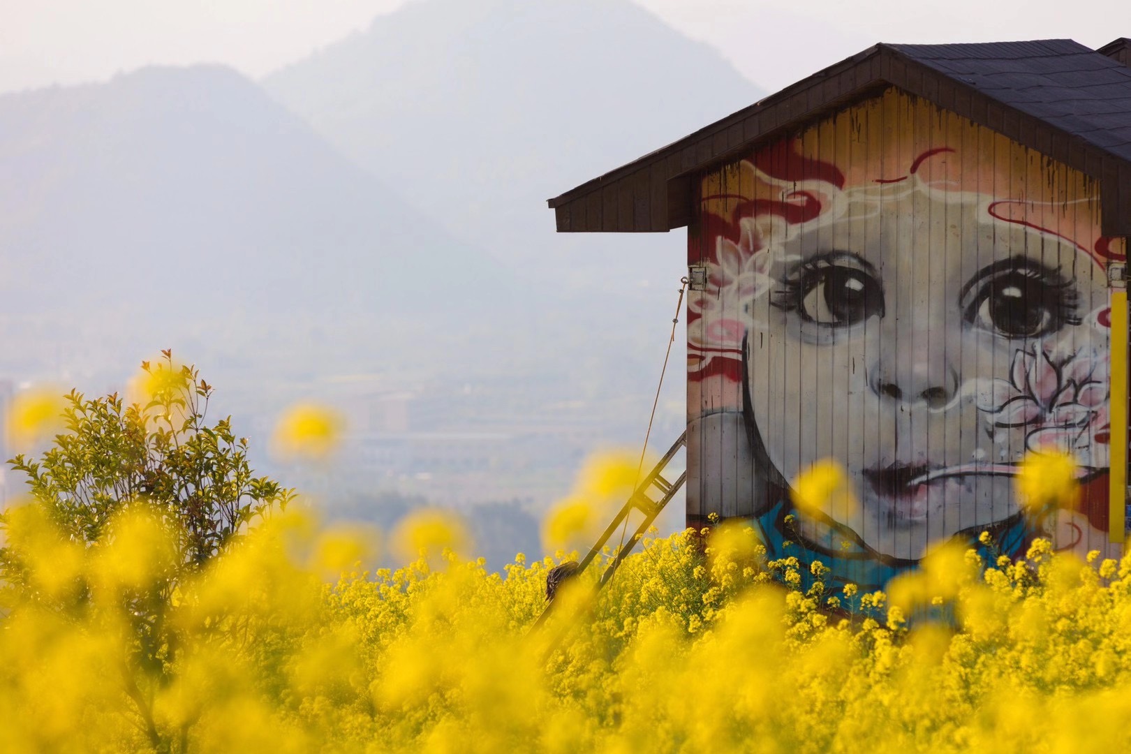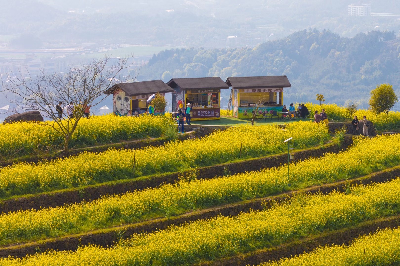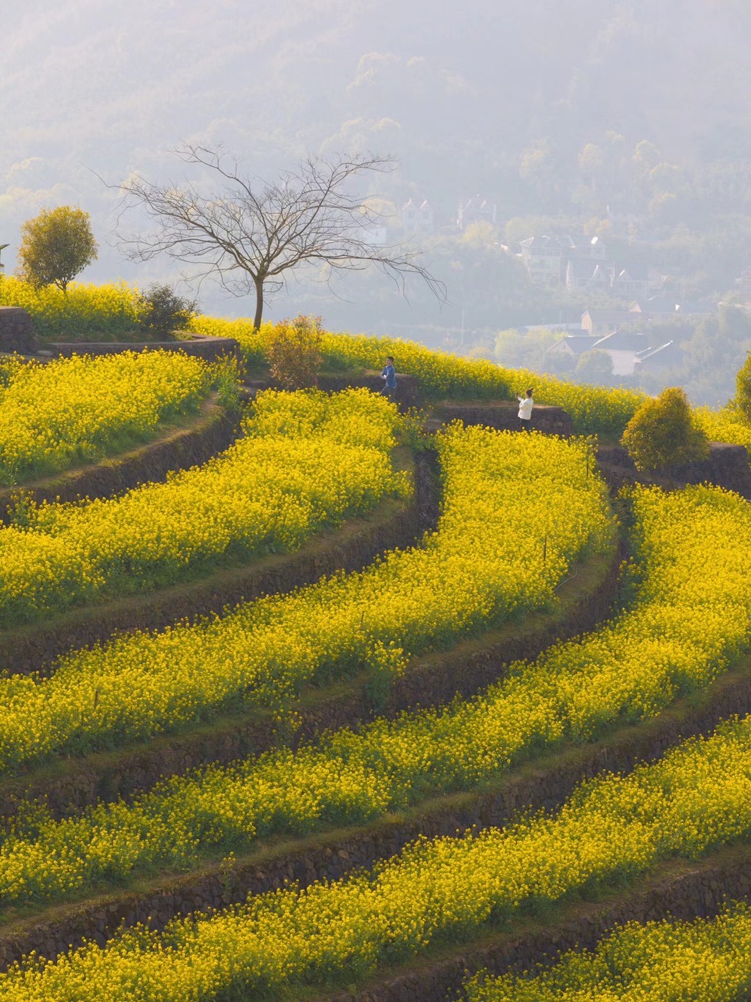 《黑山顶的春天》 位于富阳新登古城附近海拔近200米的黑山顶,村民们把连绵山坡打造成了百亩油菜花梯田,配上小景,每当春天来临时,油菜花盛开,花海层层叠叠,呈现“油菜花儿开,不语也倾城”的美景,吸引了来自各地的朋友前来观赏。 这就是金山银山”理念的指引下,村民们把黑山顶绘就了一幅生动美丽的生态画卷。黑顶山的油菜花效应成了当地发展乡村旅游、促进农民增收的一张“金名片”。