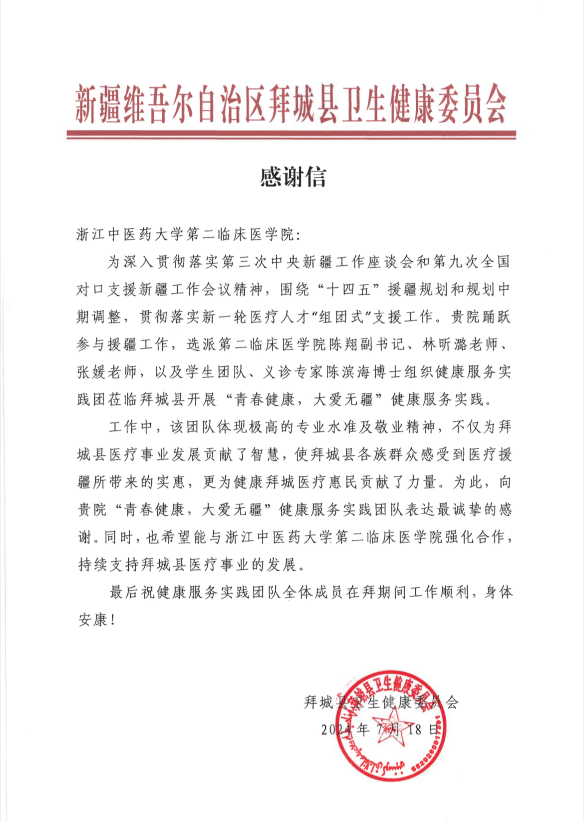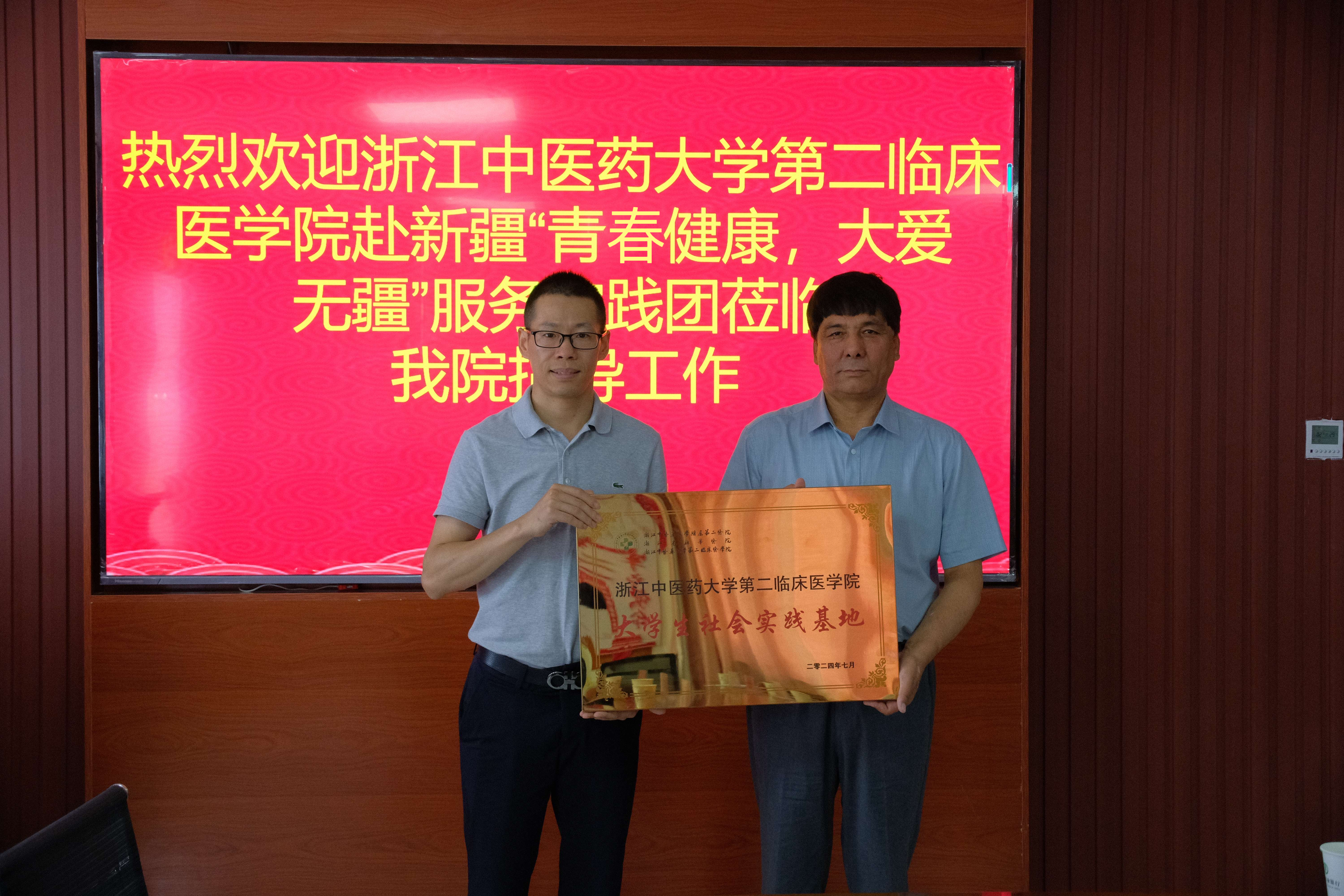 浙江中医药大学第二临床医学院赴新疆“青春健康,大爱无疆”健康服务实践团圆满完成任务! 💝医者赤子心,共“健”浙疆情 浙江中医药大学第二临床医学院赴新疆“青春健康,大爱无疆”健康服务实践团于7月17日-24日进行了为期8天的社会实践,主要开展了慰问老人、送医送温暖进社区、青春健康宣讲、健康素养调查问卷发放及协助义诊等工作。成员们深入基层了解新疆阿克苏地区群众健康素养水平,向少数民族居民传递健康科学的生活理念,在基层中施展才干,在奉献中自我成长。 👥研学促交流,调研明素养 此次社会实践活动中,团队成员先后前往柯柯牙纪念馆、拜城县中医医院(维吾尔医医院)、拜城县敬老院、拜城县新苑社区(拜城县图书馆)、拜城县民政局儿童福利院、老虎台乡民兵骑兵连等多个地区进行文化交流和参观学习,并深入各个街道社区进行街访调研,累计收获问卷427份,同时对部分代表性群众进行重点访谈。街访与问卷调研收集到的样本量足以支撑团队高效分析年龄、职业与健康素养等因素之间的关系,产出切实提高新疆地区群众健康素养的方案。 🔊科普入基层,健康进万家 具体实践过程中,团队成员前往敬老院为老人们测量血压、提供健康咨询,并在工作人员的帮助下对少数民族老人进行访谈。 为进一步提升新疆阿克苏地区青少年的健康素养水平,团队依托青春健康教育资源与同伴教育讲师力量,在当地开展青春健康教育宣讲课堂,就“儿童常见传染病预防”这一主题向拜城县民政局儿童福利院内的青少年展开科普。 此外,浙江中医药大学附属第二医院副主任中医师、副教授、硕士生导师陈滨海老师于拜城县中医医院开展义诊服务,团队成员们通过辅助义诊,跟诊、维持秩序、进行扩展性采访调研,对当地医疗体系和群众健康素养水平建立了更全面的认知。 经一系列基层健康行动,团队真正做到了纵向覆盖式传播健康意识,基于医学专业知识储备为人民服务。 🤝签约达共识,挂牌励后辈 为加强校院联合,落实送医援疆,进一步增强大学生的服务意识和实践能力,7月22日上午,由浙江中医药大学第二临床医学院与拜城县中医医院合作的大学生社会实践基地签约授牌仪式在拜城县中医医院举行。双方就成立浙江中医药大学第二临床医学院大学生社会实践基地合作共建达成共识,并为“浙江中医药大学第二临床医学院大学生社会实践基地”揭牌。 🎙️媒体共聚焦,推送助宣传 团队协助开展的义诊等行动被“中国新闻网”、“健康拜城”(拜城县卫健委)报道,获得群众交口称赞,各界一致好评。