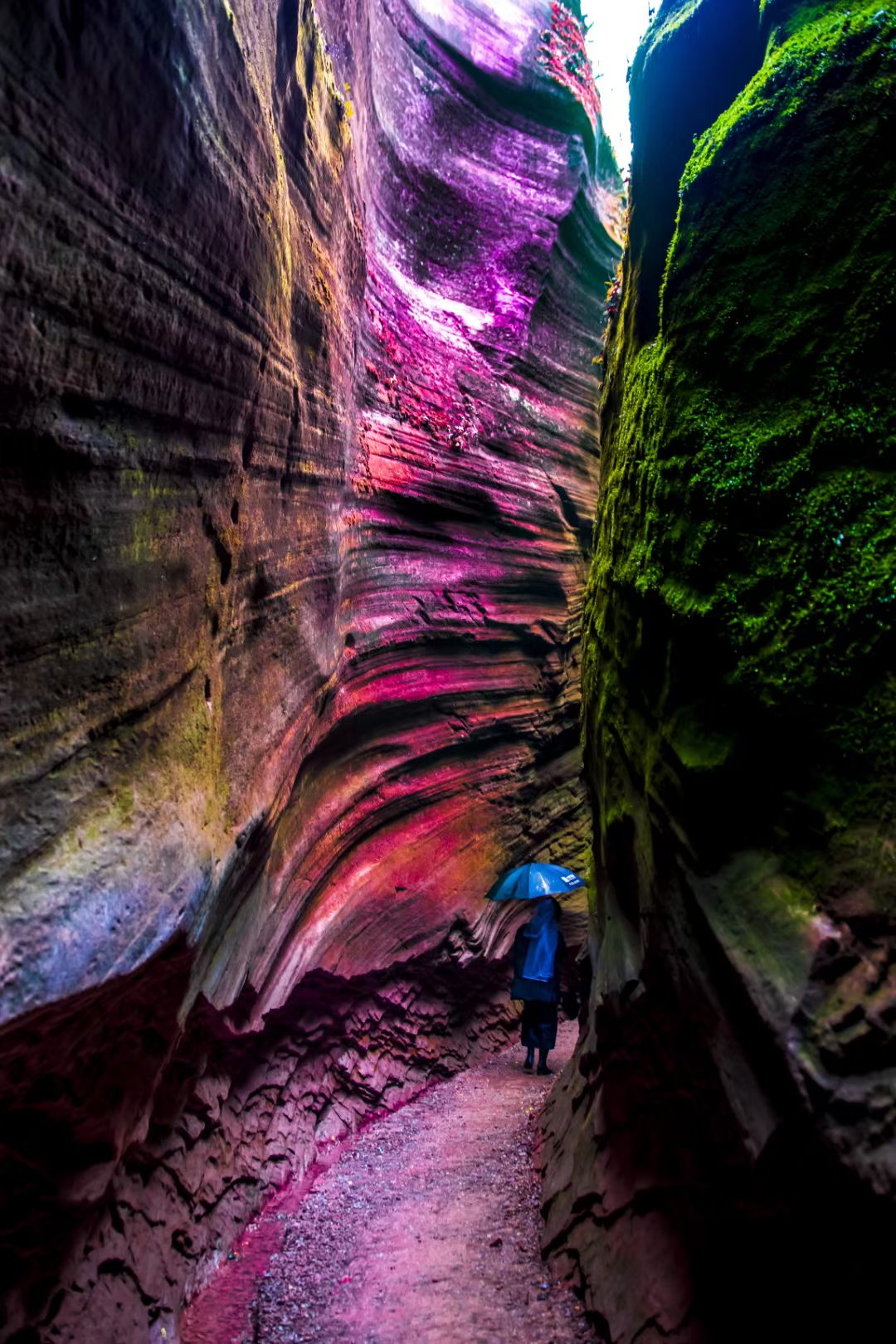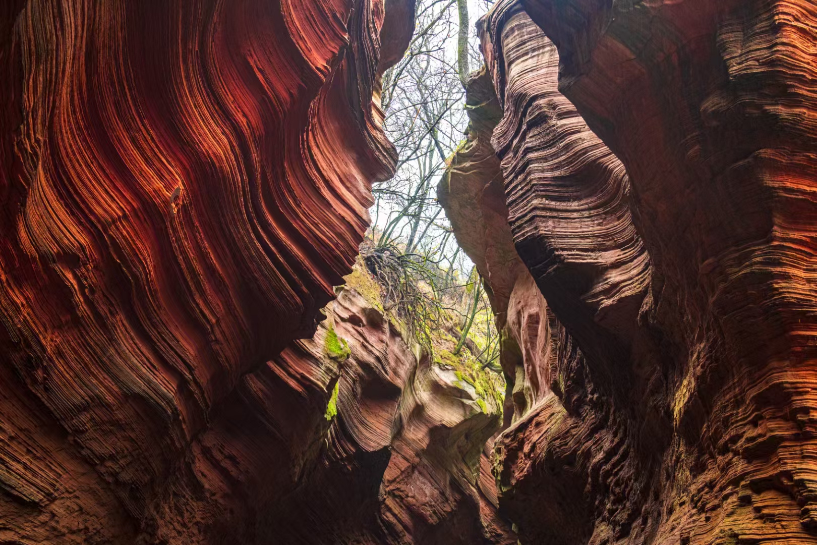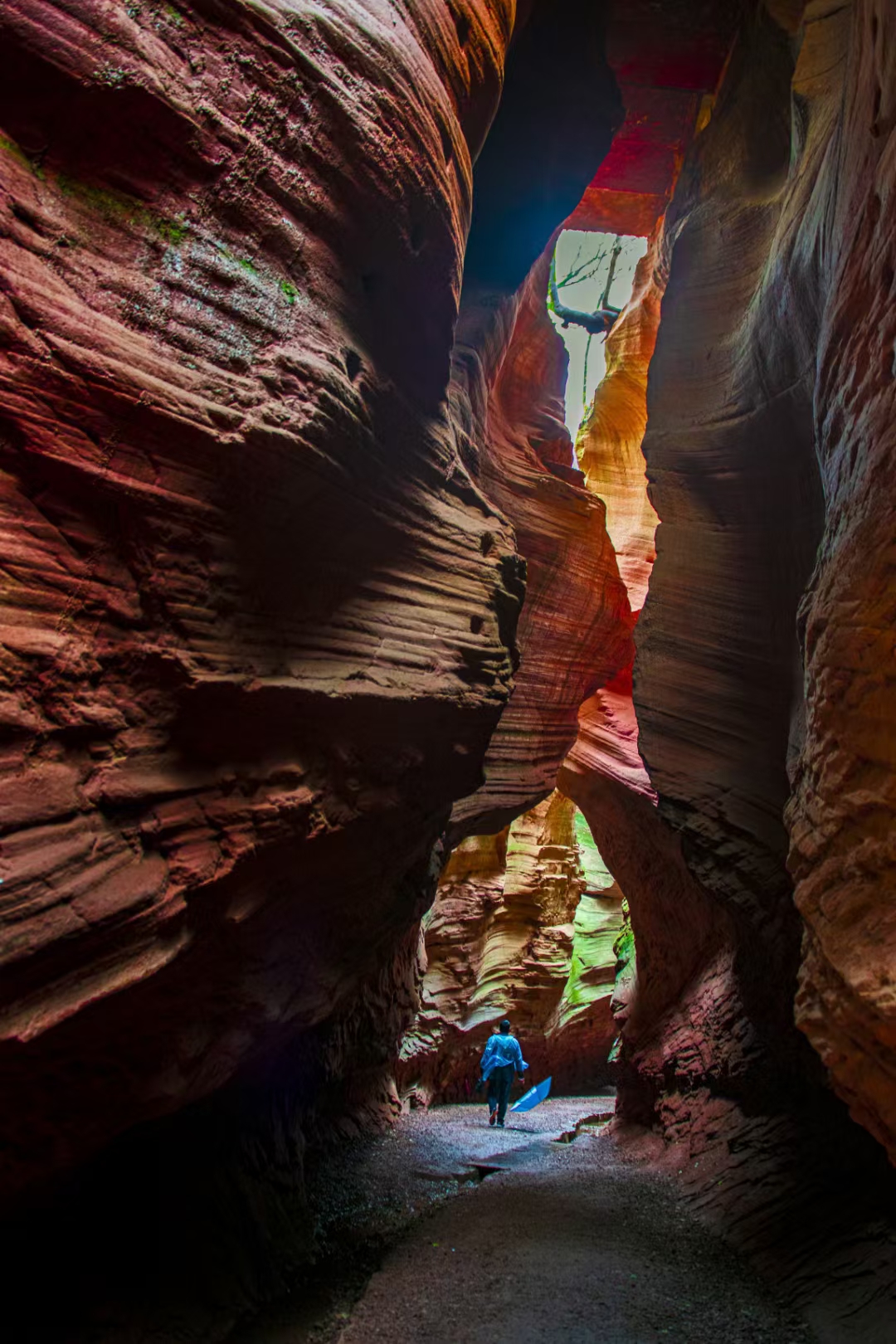 陕西甘泉雨岔大峡谷是一处极具特色的地质奇观,亿万年前,陕北曾发生过一次强烈地震,使黄土大山分开形成一条条裂缝,宽窄不一。之后,经过上亿年高原暴雨导致的山洪暴发,地表不断被切割和冲刷,逐渐形成了如今独特的峡谷,当阳光透过顶部的缝隙照射下来,峡谷的岩壁呈现出鲜红的颜色,而崖壁上的绿苔茵茵,为峡谷增添了一抹鲜亮的色彩,与红色的岩石相互映衬,色彩斑斓。