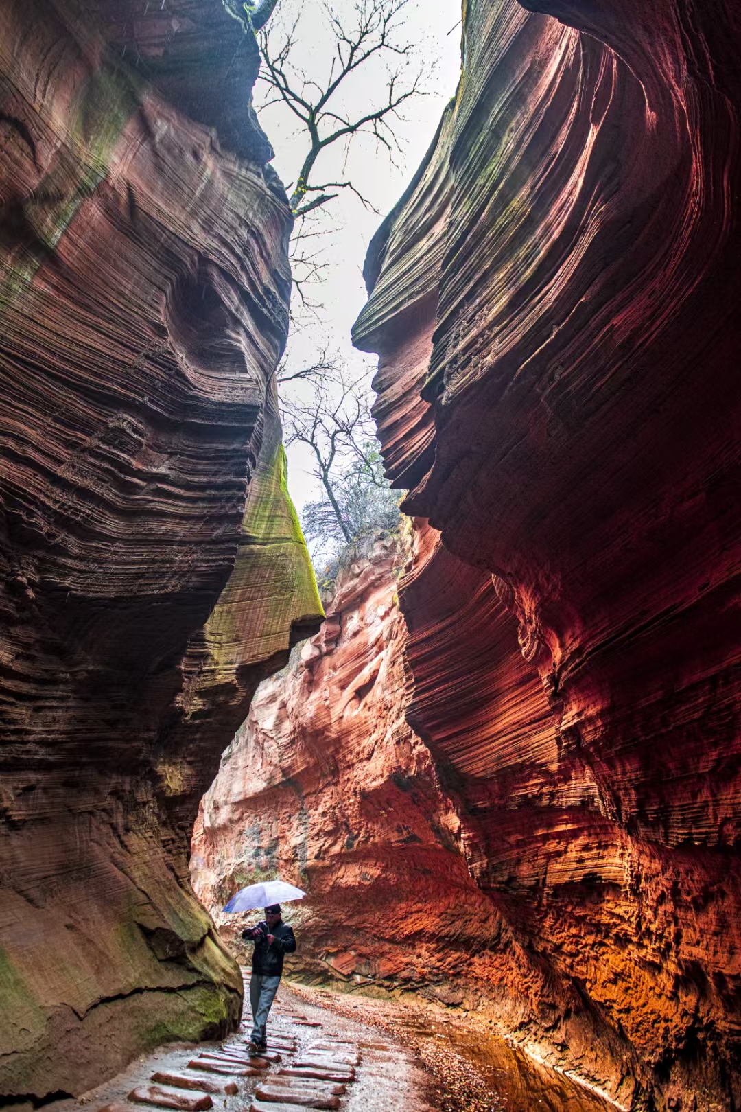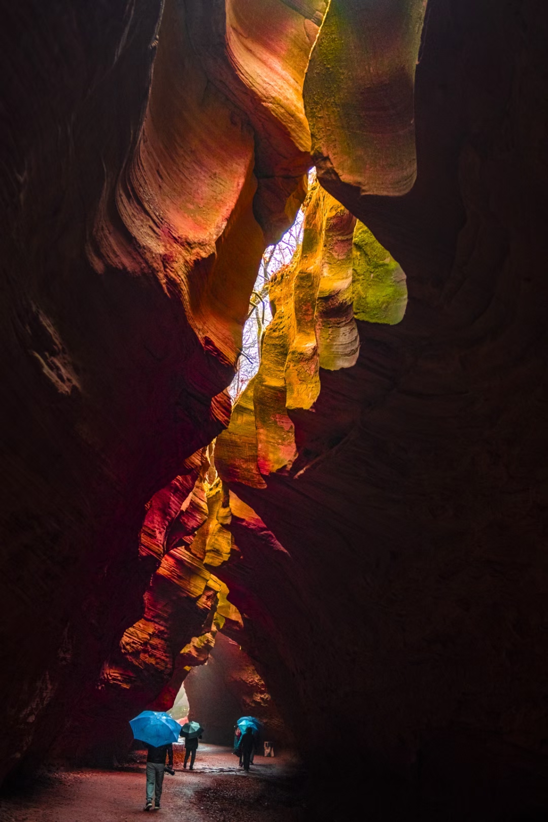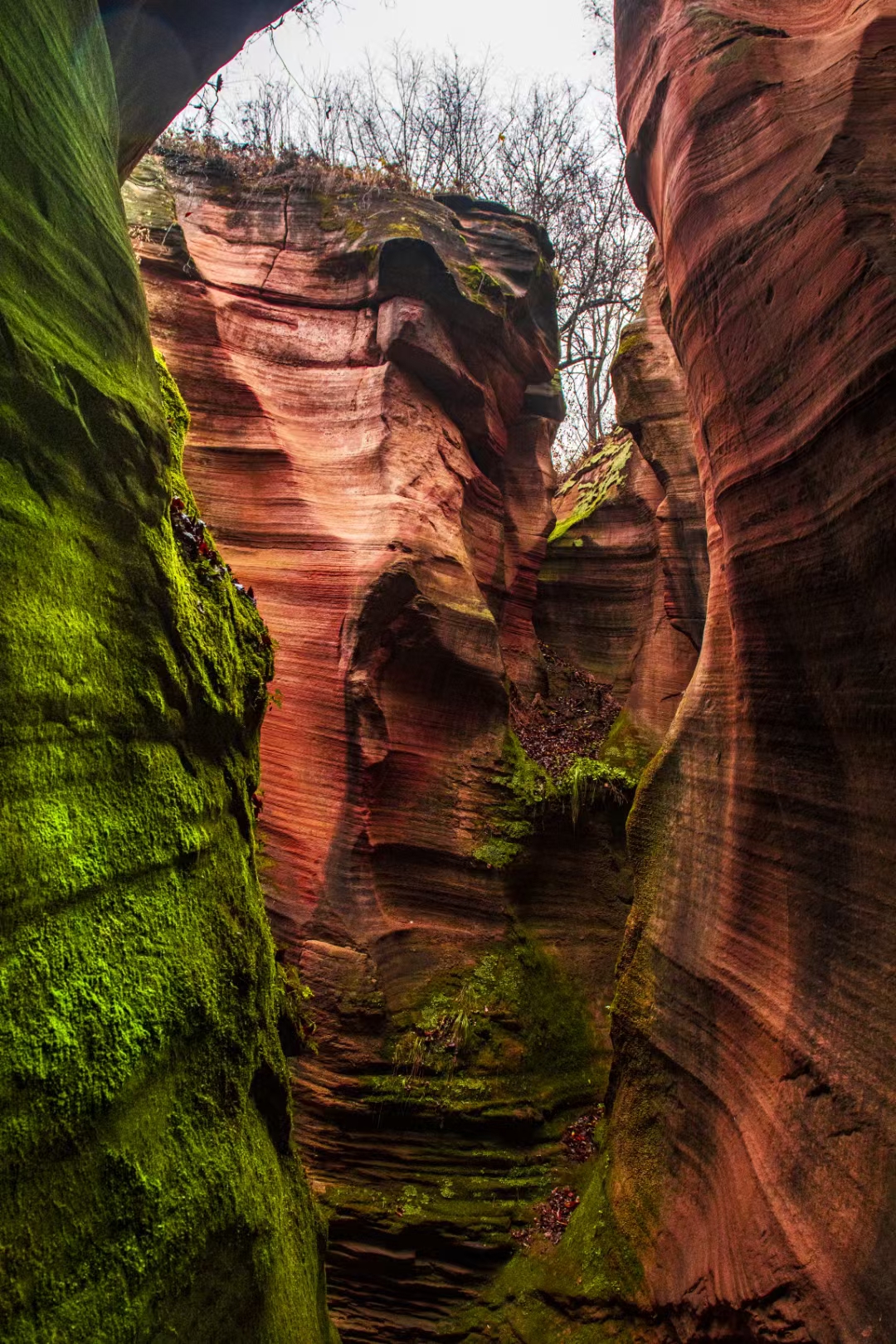 陕西甘泉雨岔大峡谷是一处极具特色的地质奇观,亿万年前,陕北曾发生过一次强烈地震,使黄土大山分开形成一条条裂缝,宽窄不一。之后,经过上亿年高原暴雨导致的山洪暴发,地表不断被切割和冲刷,逐渐形成了如今独特的峡谷,当阳光透过顶部的缝隙照射下来,峡谷的岩壁呈现出鲜红的颜色,而崖壁上的绿苔茵茵,为峡谷增添了一抹鲜亮的色彩,与红色的岩石相互映衬,色彩斑斓。