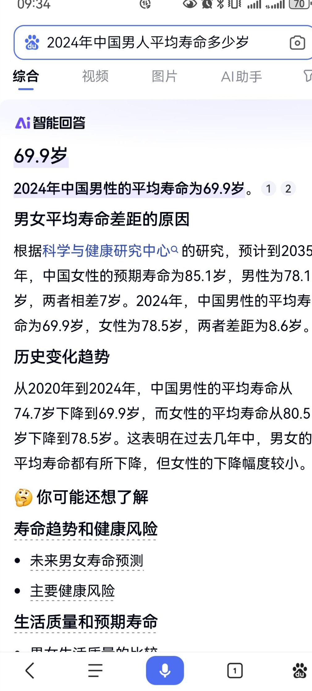 【AI可信吗?】一早,看到有人在群里发了一个关于2024年中国男性平均寿命的视频。于是,随手去百度了下,AI智能回答结果如下:1.“男性”问:2024年中国男性平均寿命多少岁?答:2024年中国男性的平均寿命为69.9岁。2.“男人”问:2024年中国男人平均寿命多少岁?答:2024年中国男性的平均预期寿命为78.5岁。由此可见:1.AI技术有缺陷,远未达到理想的智能化。2.AI是基于网络信息(数据库)提供服务,而信息是可以人为干预(污染)的,切勿忽视信息污染(编造传播谣言之类信息)。3.AI已成为舆论战工具。4.尽信网,不如无网。