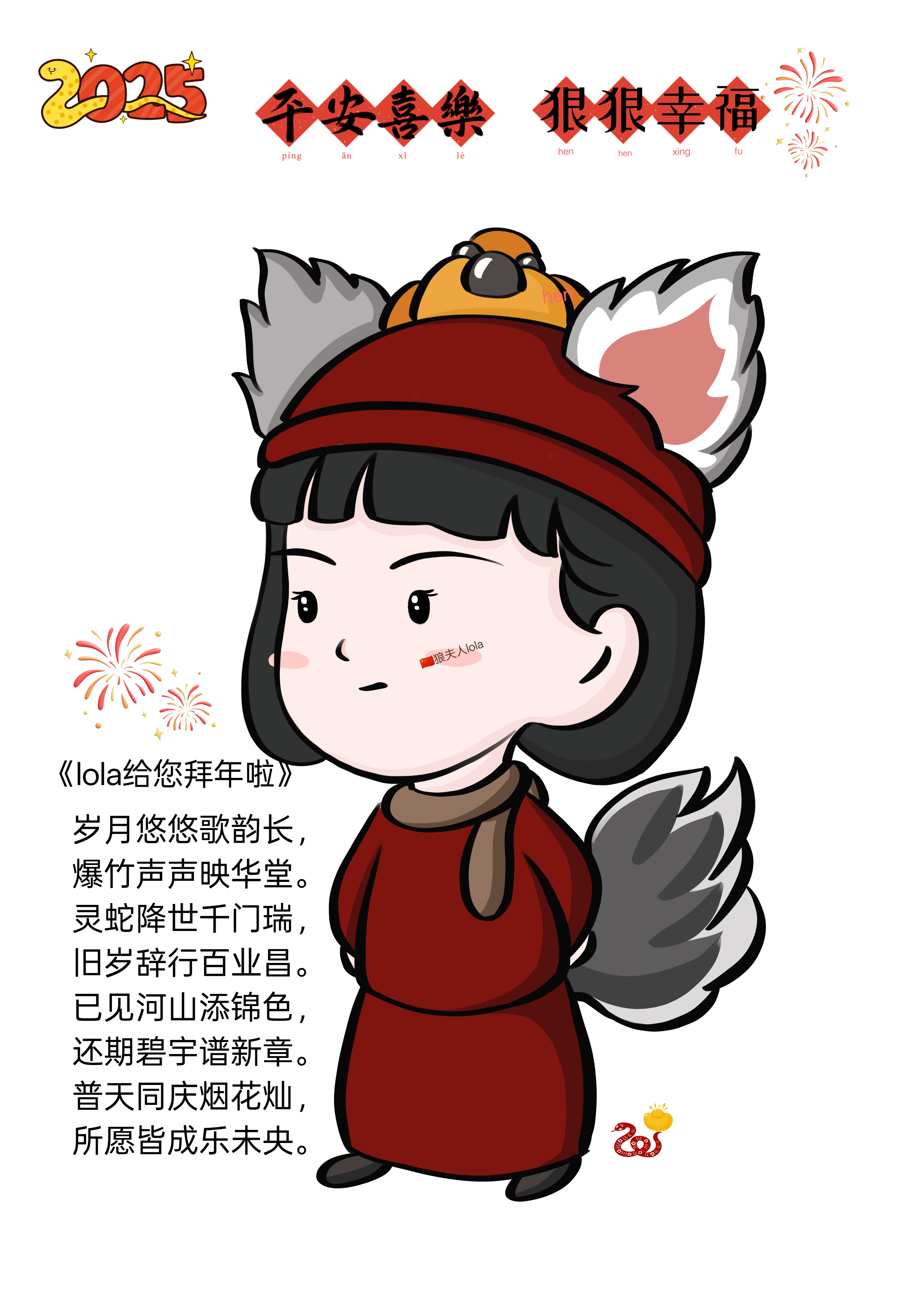 《lola给您拜年啦》~lola 岁月悠悠歌韵长, 爆竹声声映华堂。 灵蛇降世千门瑞, 旧岁辞行百业昌。 已见河山添锦色, 还期碧宇谱新章。 普天同庆烟花灿, 所愿皆成乐未央。#平阳喊你来过年##网络中国节·春节##强城在行动#