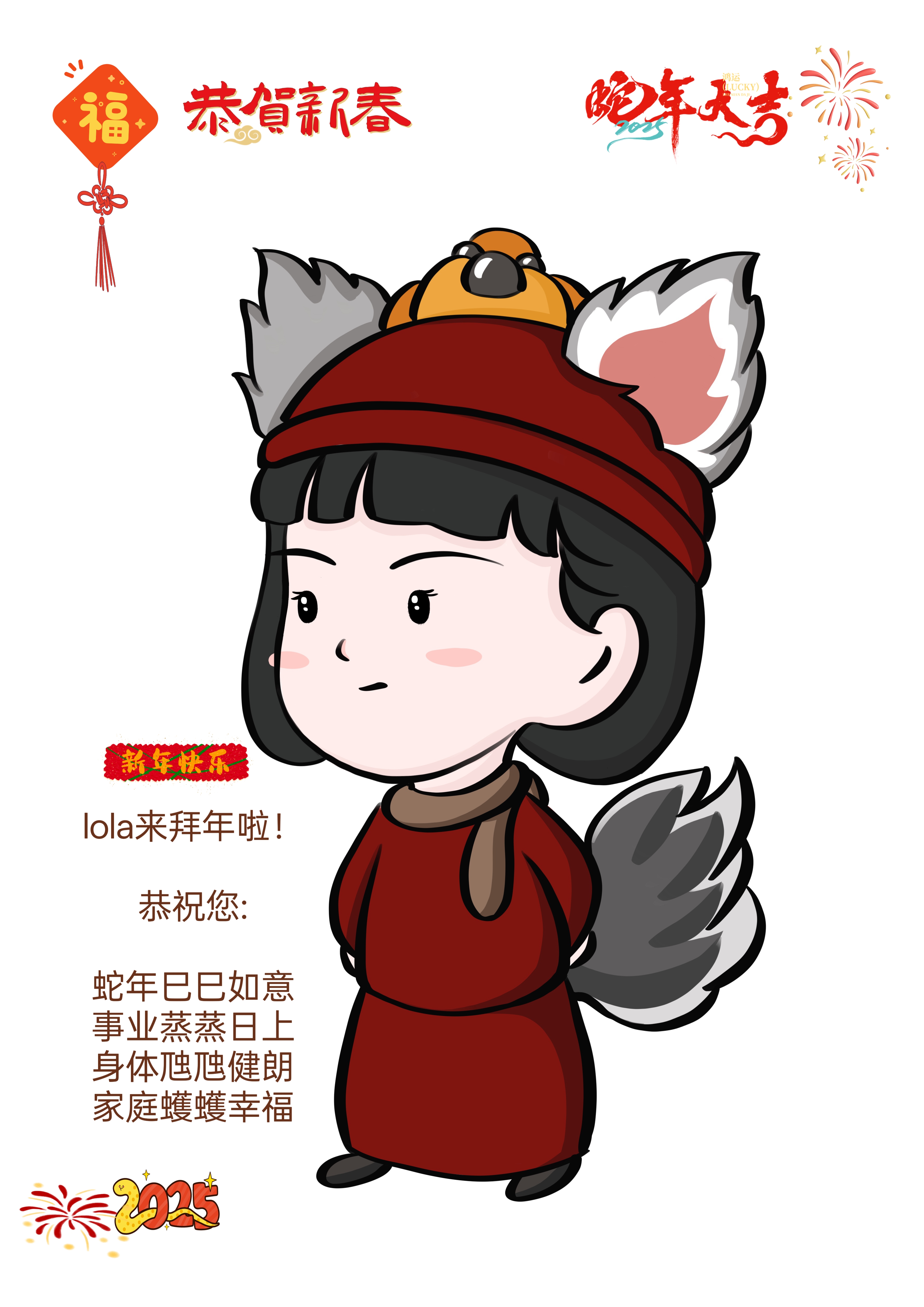lola给全网好友拜年啦[封神第二部][心][作揖] 恭祝您: 蛇年巳巳如意 事业蒸蒸日上 身体虺虺健朗 家庭蠖蠖幸福