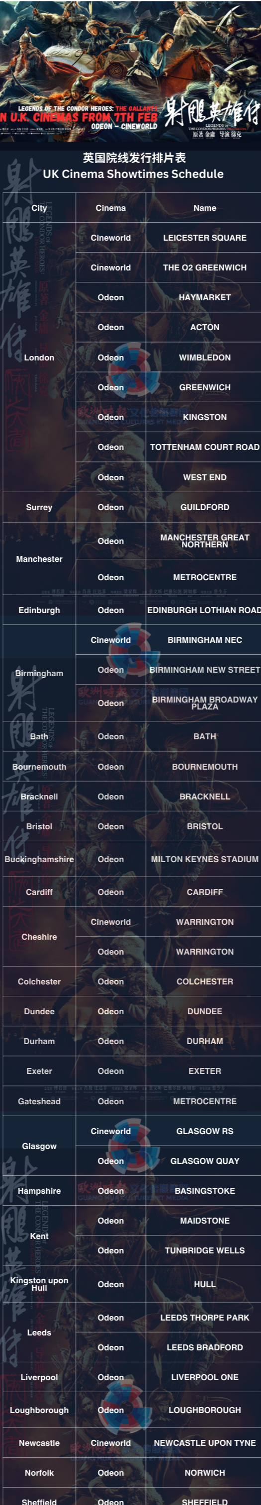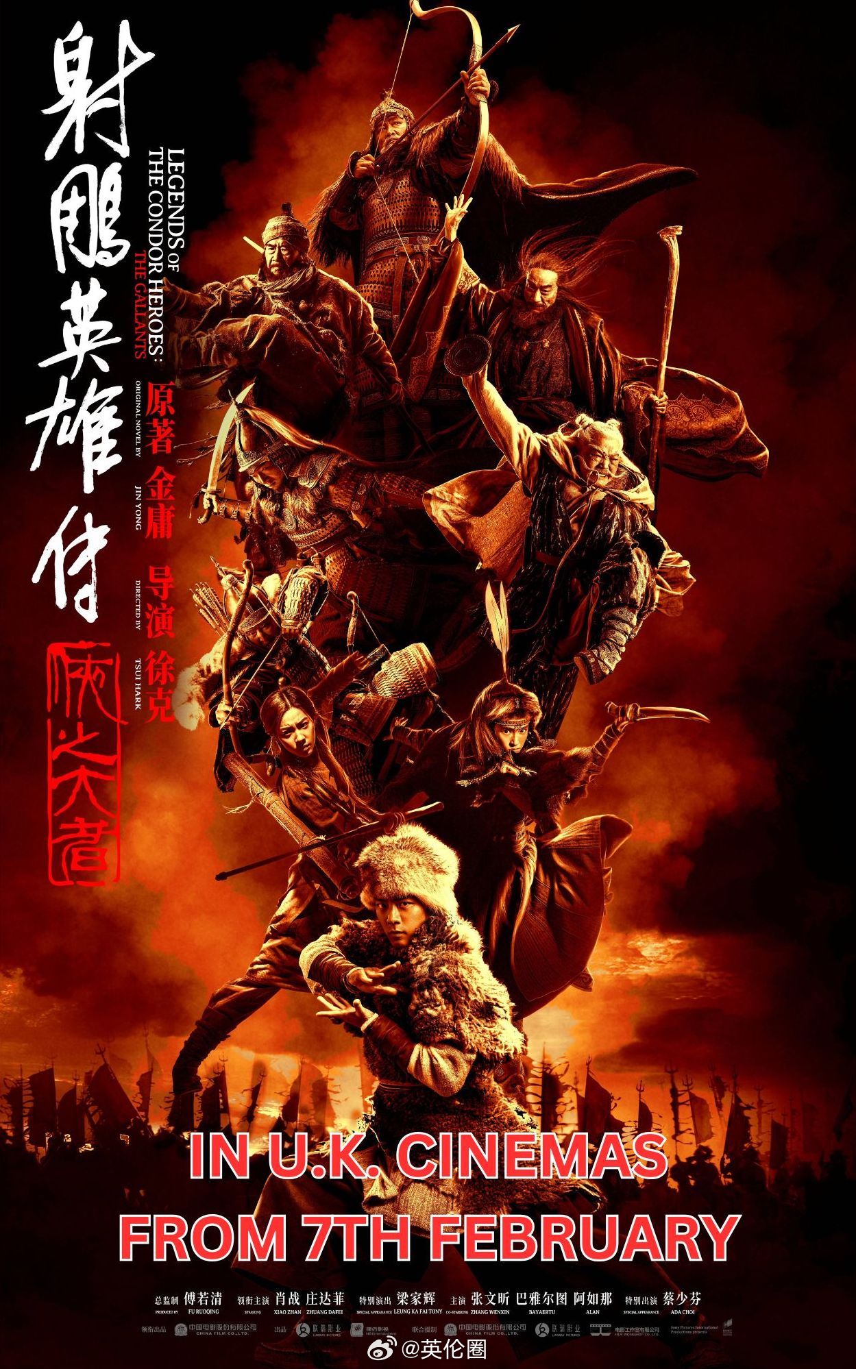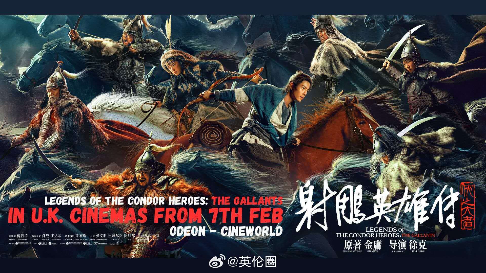 《射雕英雄传之侠之大者》2月7日起将在英国上映! 射雕上线 作为徐克导演《射雕英雄传》三部曲中的第二部, 电影射雕英雄传侠之大者 改编自金庸最受欢迎的武侠小说《射雕英雄传》,春节档已在国内斩获5亿余票房,深受广大影迷的好评。 片中由肖战 X玖少年团肖战DAYTOY 饰演的郭靖在获得天下第一武功“九阴真经”和“降龙十八掌”后成为众矢之的,战乱年代中他与黄蓉携手并肩,力挽狂澜,誓死守护南宋边疆,书写了一段荡气回肠的武侠传奇。肖战,庄达菲,张文昕,梁家辉,蔡少芬组成超一流的卡司阵容,开年武侠大戏不容错过! 《射雕英雄传之侠之大者》将于2月7日起登陆英国,将覆盖伦敦、伯明翰、曼彻斯特等27个城市及42家Odeon和Cineworld影院。让你身在异乡也能原汁原味体验到“侠之大者,为国为民”的武侠精神,快来附近的影院支持一下吧。 欧洲时报文化传媒集团 欧洲时报 作为影片的英国发行商,敬请关注圈哥带来更多的排片信息,让我们一起走进肖战的武侠世界吧~