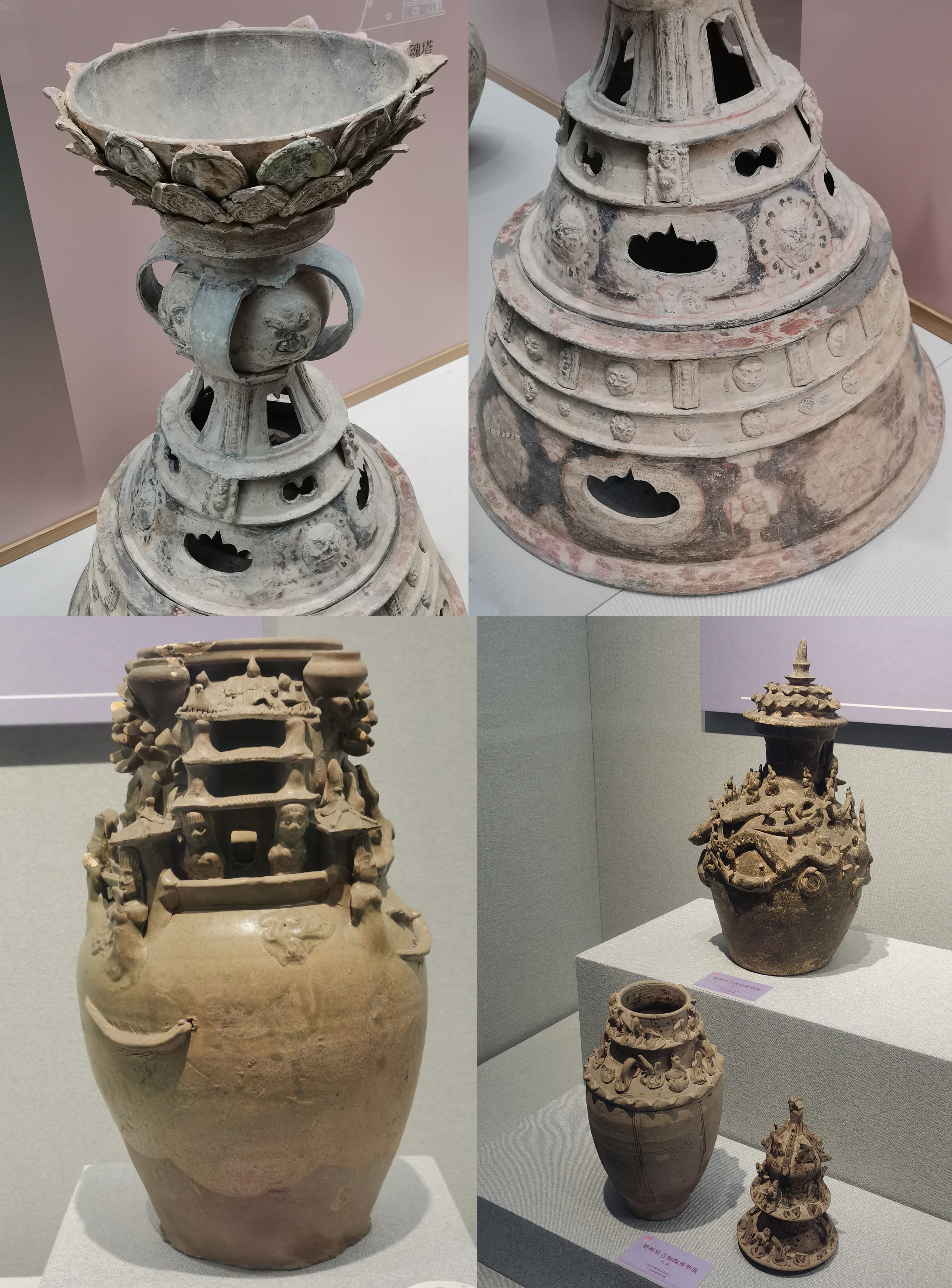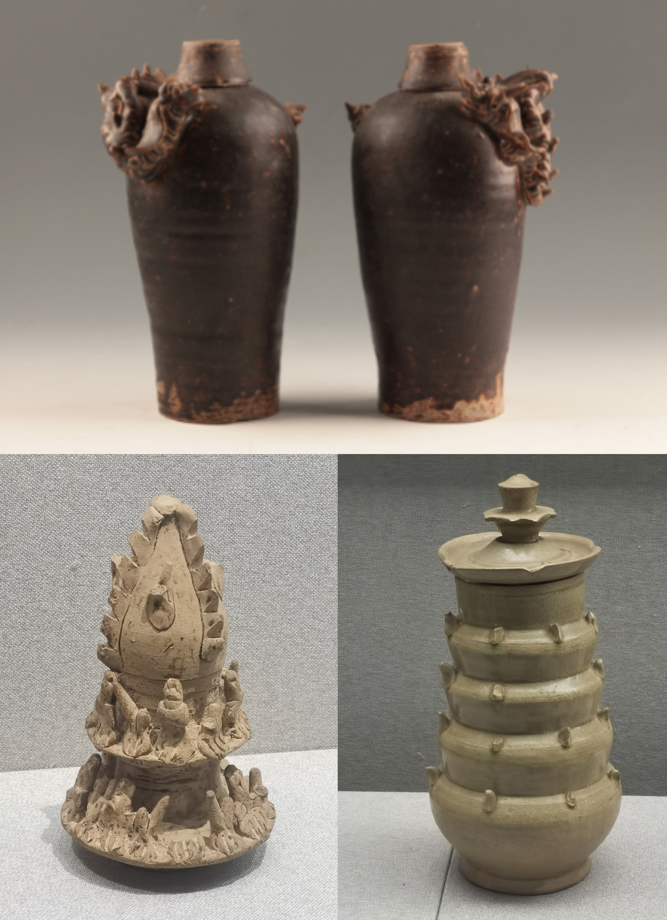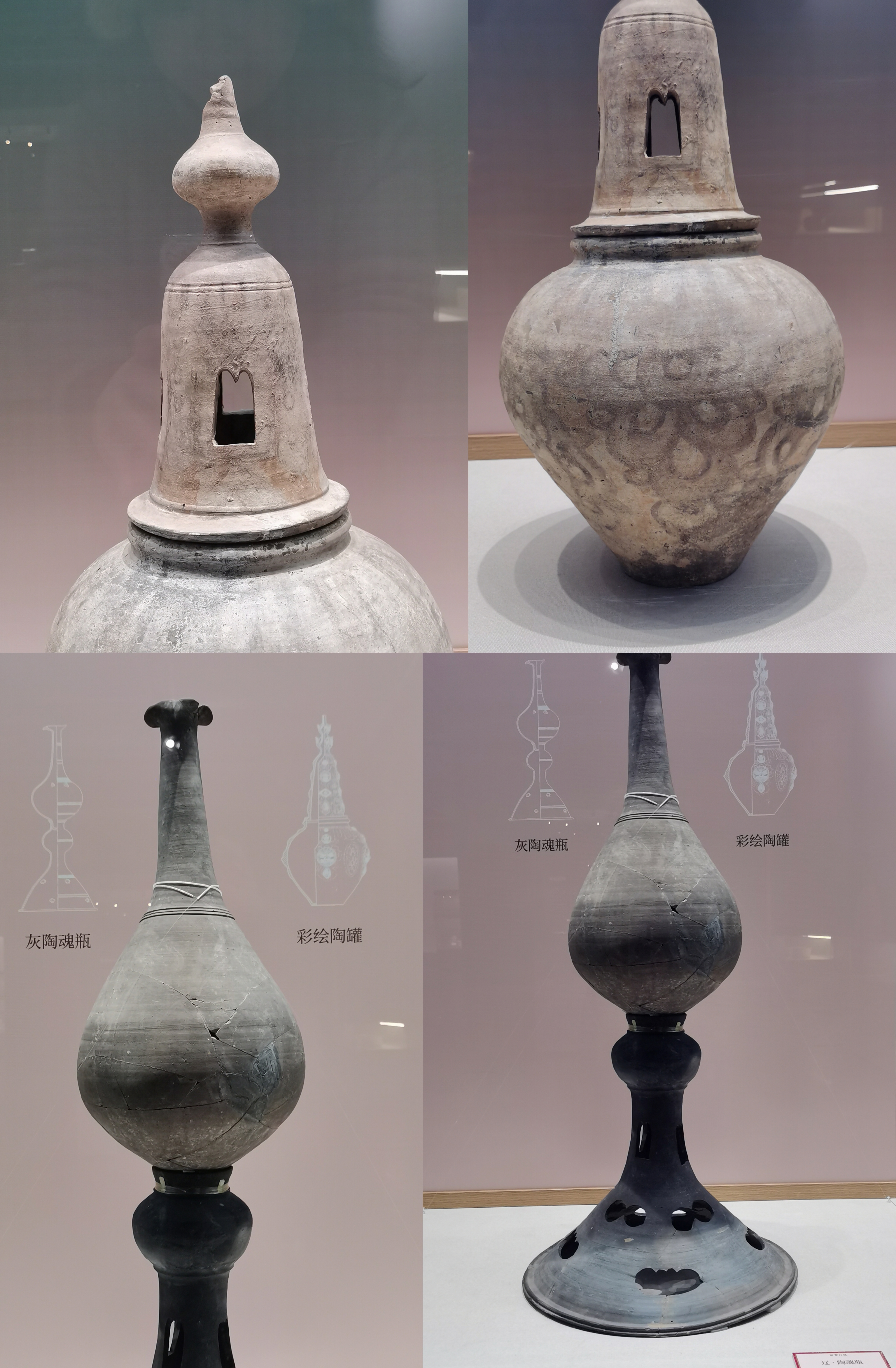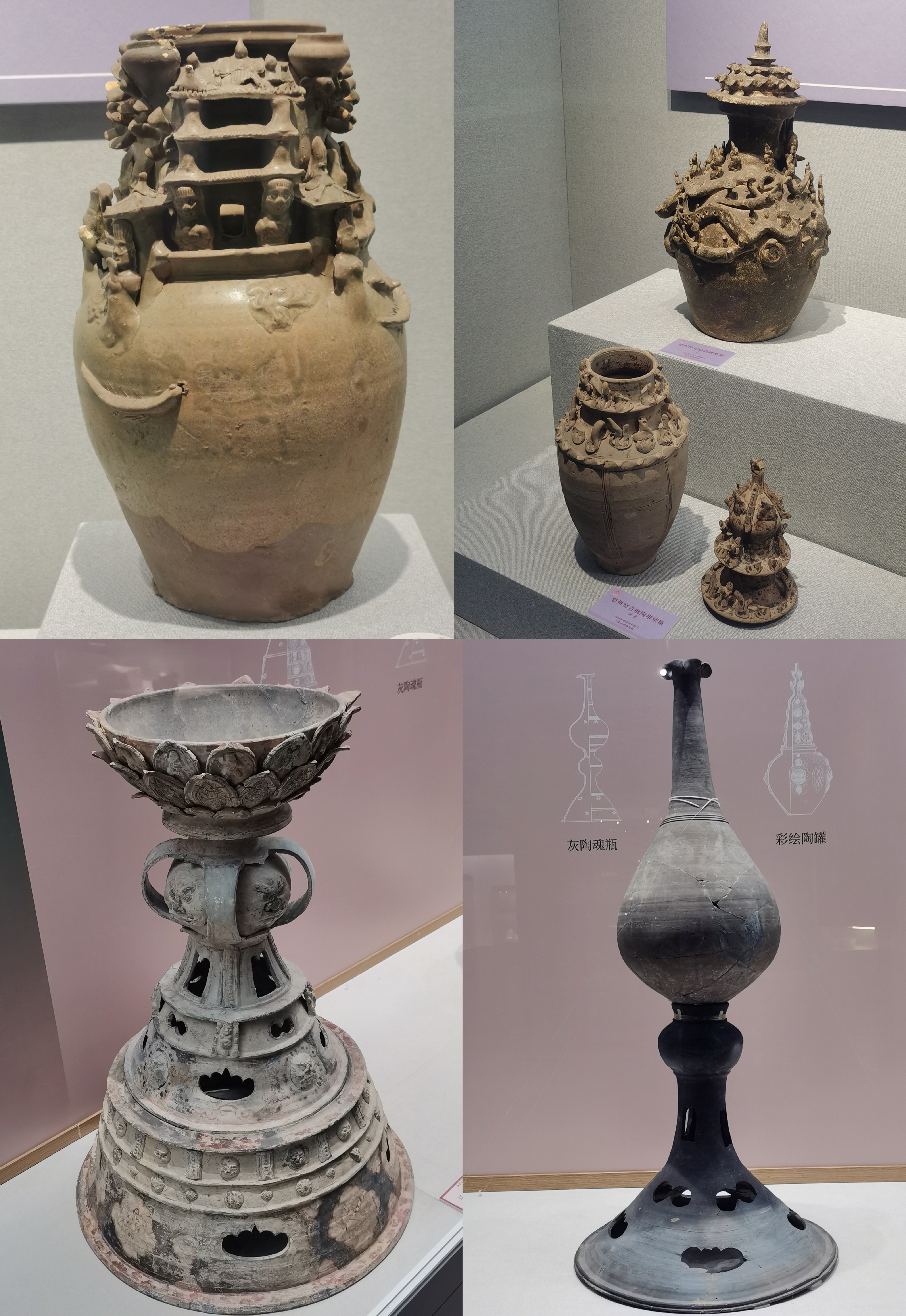谷仓,又称魂瓶、五谷仓,源于三国两晋,由汉代五联罐演变而来,是用来护尸、告慰死者灵魂,寄托生者愿望的随葬明器,也是古人熬谷习俗和神仙飞升信仰的延续。 堆塑瓶,兴起于魏晋时期,常见于江南墓葬,多成对出土,装有五谷。宋元时受道教以及虎崇拜的影响,出现了堆塑的龙虎瓶,多产自越窑、龙泉窑及景德镇窑。 多角瓶流行于唐末五代及两宋时期,常见于湖南、福建地区。因“角”与“谷”音近,故“多角”又寓意“多谷”,寄托了人们对五谷丰收的希冀,以及对亲人无尽的思念与祈愿。清代多管瓶成了装饰品,多用于插花。 堆塑瓶是墓主灵魂寄居的归宿,承担着为灵魂升天保驾护航的职责。瓶身上部堆塑亭台楼阁、飞禽走兽、人物等装饰,颈部常雕刻着亭台仙阁、仙人灵兽等。而飞龙在天、佛道仙人、灵兽莲瓣以及腾云驾雾等形象的交织,体现佛道文化的碰撞和融合。 塔形魂器,又称塔式罐,是唐代至辽初北方地区流行的一种明器,以三彩釉陶、彩绘陶最为多见,体现了佛教安托逝者亡灵的愿望。 晚唐社会动荡,尤其是唐武宗灭佛后,开始流行随葬铁猪石龙等厌胜之物。塔式罐的盖纽一般简化为水滴形,后逐渐消亡。 塔式罐形似佛教中的窣堵坡而得名,罐盖模拟印度佛塔的七重相轮,相当于塔刹;罐腹浑圆相当于塔身;莲瓣模拟了佛塔的须弥座。 大同辽代早期的陶制魂塔,与西安的唐三彩塔式罐较接近。受其影响的还有后来宋元时江南的皈依瓶、元代的四灵塔式罐、明代的将军罐等。