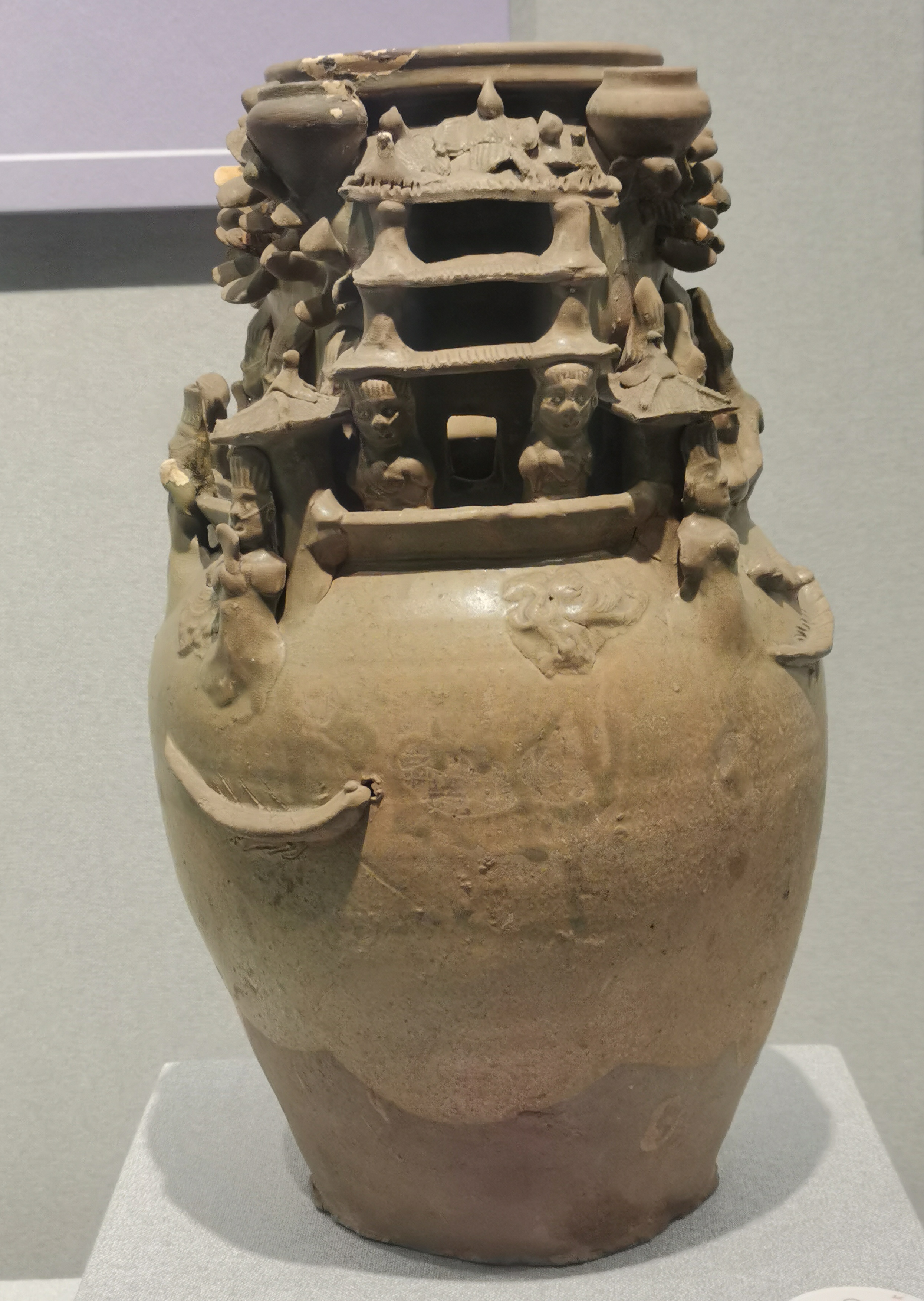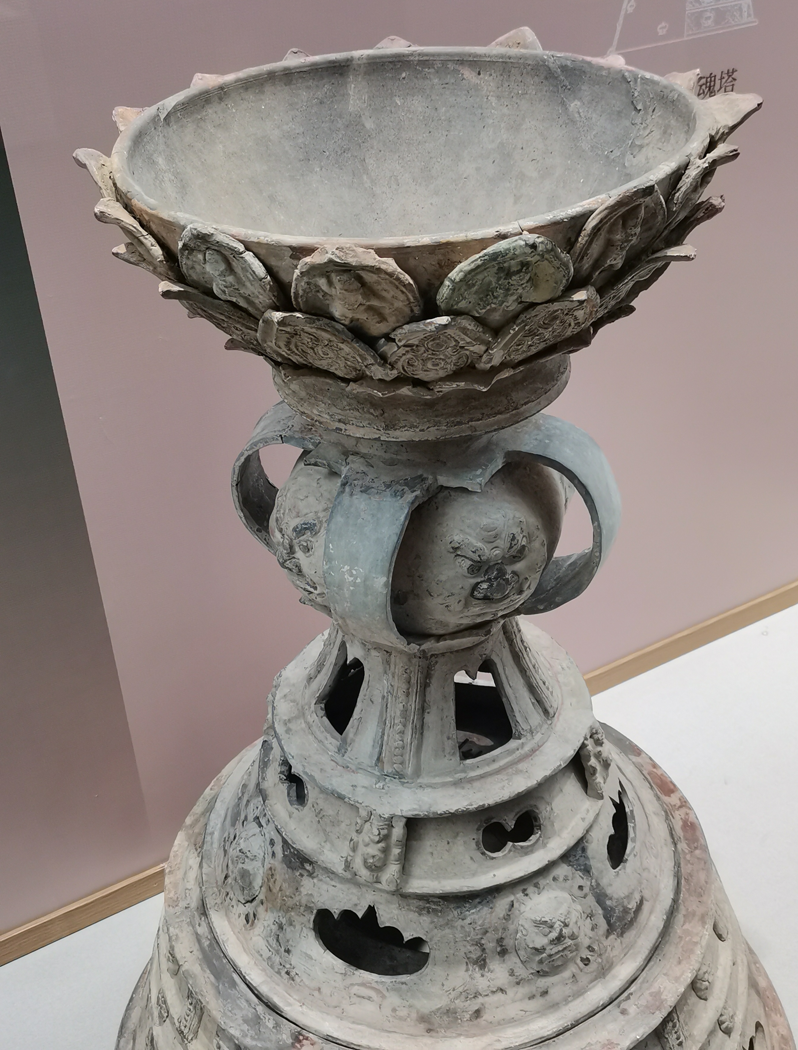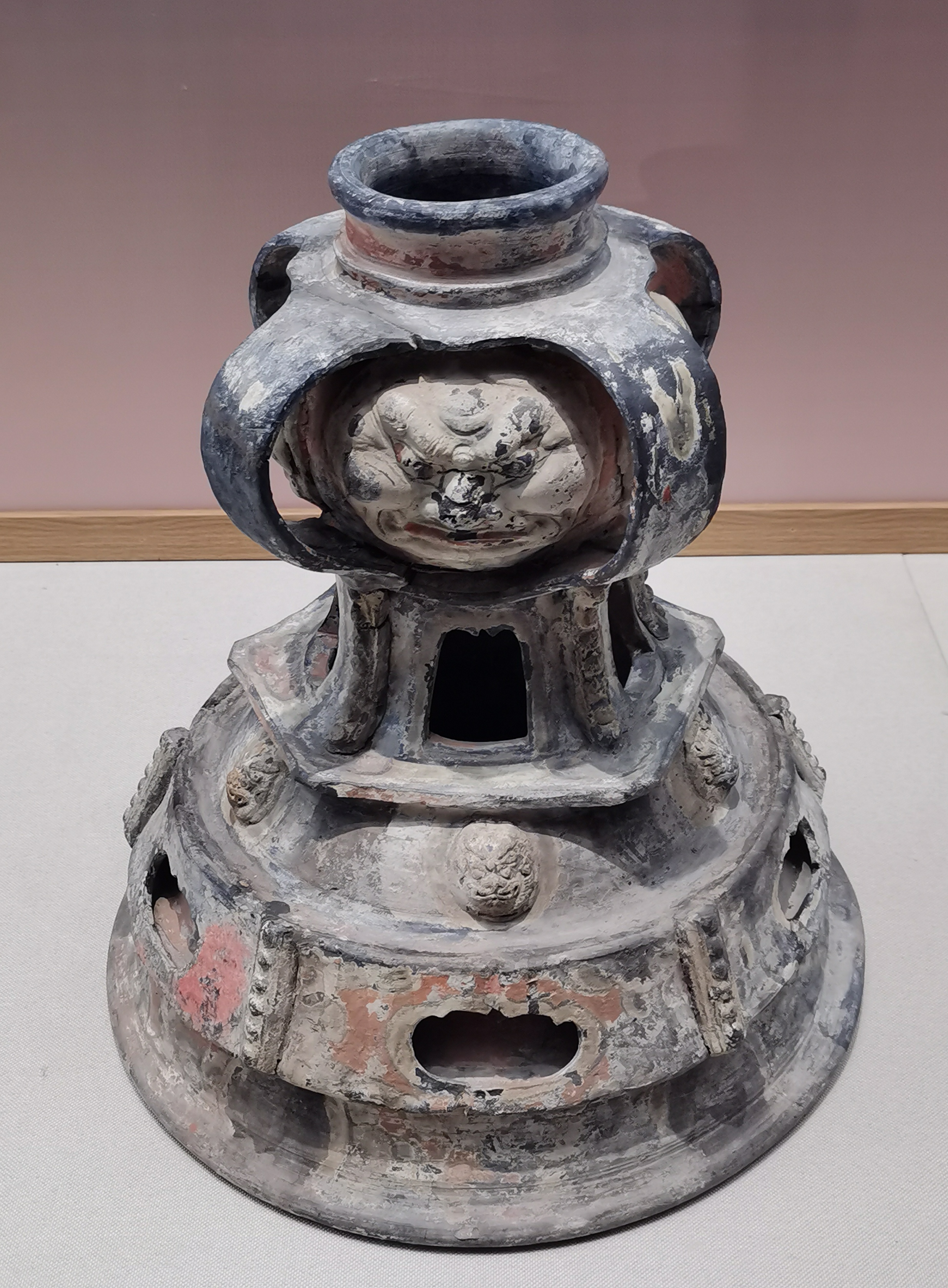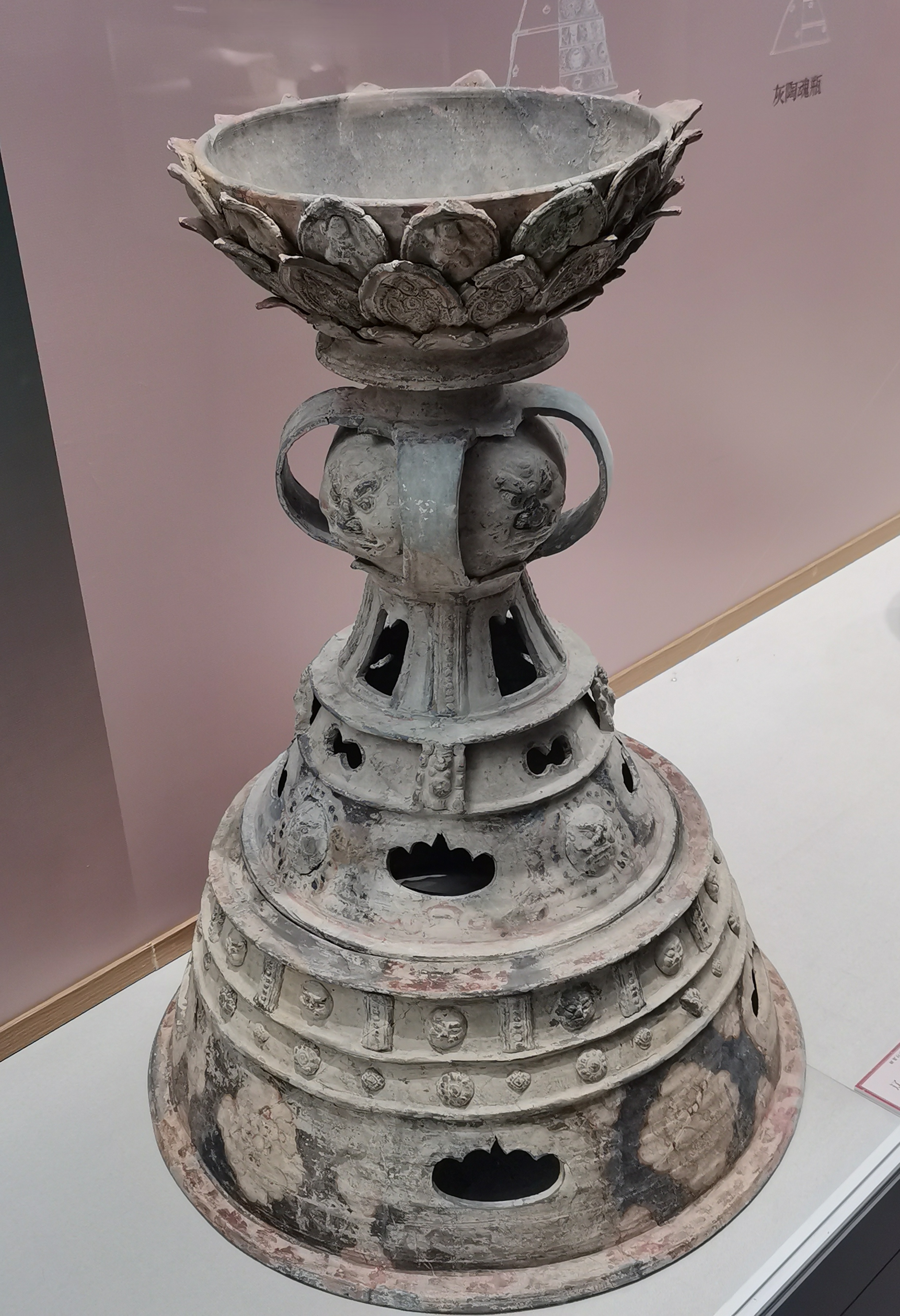 谷仓,又称魂瓶、五谷仓,源于三国两晋,由汉代五联罐演变而来,是用来护尸、告慰死者灵魂,寄托生者愿望的随葬明器,也是古人熬谷习俗和神仙飞升信仰的延续。 堆塑瓶,兴起于魏晋时期,常见于江南墓葬,多成对出土,装有五谷。宋元时受道教以及虎崇拜的影响,出现了堆塑的龙虎瓶,多产自越窑、龙泉窑及景德镇窑。 多角瓶流行于唐末五代及两宋时期,常见于湖南、福建地区。因“角”与“谷”音近,故“多角”又寓意“多谷”,寄托了人们对五谷丰收的希冀,以及对亲人无尽的思念与祈愿。清代多管瓶成了装饰品,多用于插花。 堆塑瓶是墓主灵魂寄居的归宿,承担着为灵魂升天保驾护航的职责。瓶身上部堆塑亭台楼阁、飞禽走兽、人物等装饰,颈部常雕刻着亭台仙阁、仙人灵兽等。而飞龙在天、佛道仙人、灵兽莲瓣以及腾云驾雾等形象的交织,体现佛道文化的碰撞和融合。 塔形魂器,又称塔式罐,是唐代至辽初北方地区流行的一种明器,以三彩釉陶、彩绘陶最为多见,体现了佛教安托逝者亡灵的愿望。 晚唐社会动荡,尤其是唐武宗灭佛后,开始流行随葬铁猪石龙等厌胜之物。塔式罐的盖纽一般简化为水滴形,后逐渐消亡。 塔式罐形似佛教中的窣堵坡而得名,罐盖模拟印度佛塔的七重相轮,相当于塔刹;罐腹浑圆相当于塔身;莲瓣模拟了佛塔的须弥座。 大同辽代早期的陶制魂塔,与西安的唐三彩塔式罐较接近。受其影响的还有后来宋元时江南的皈依瓶、元代的四灵塔式罐、明代的将军罐等。