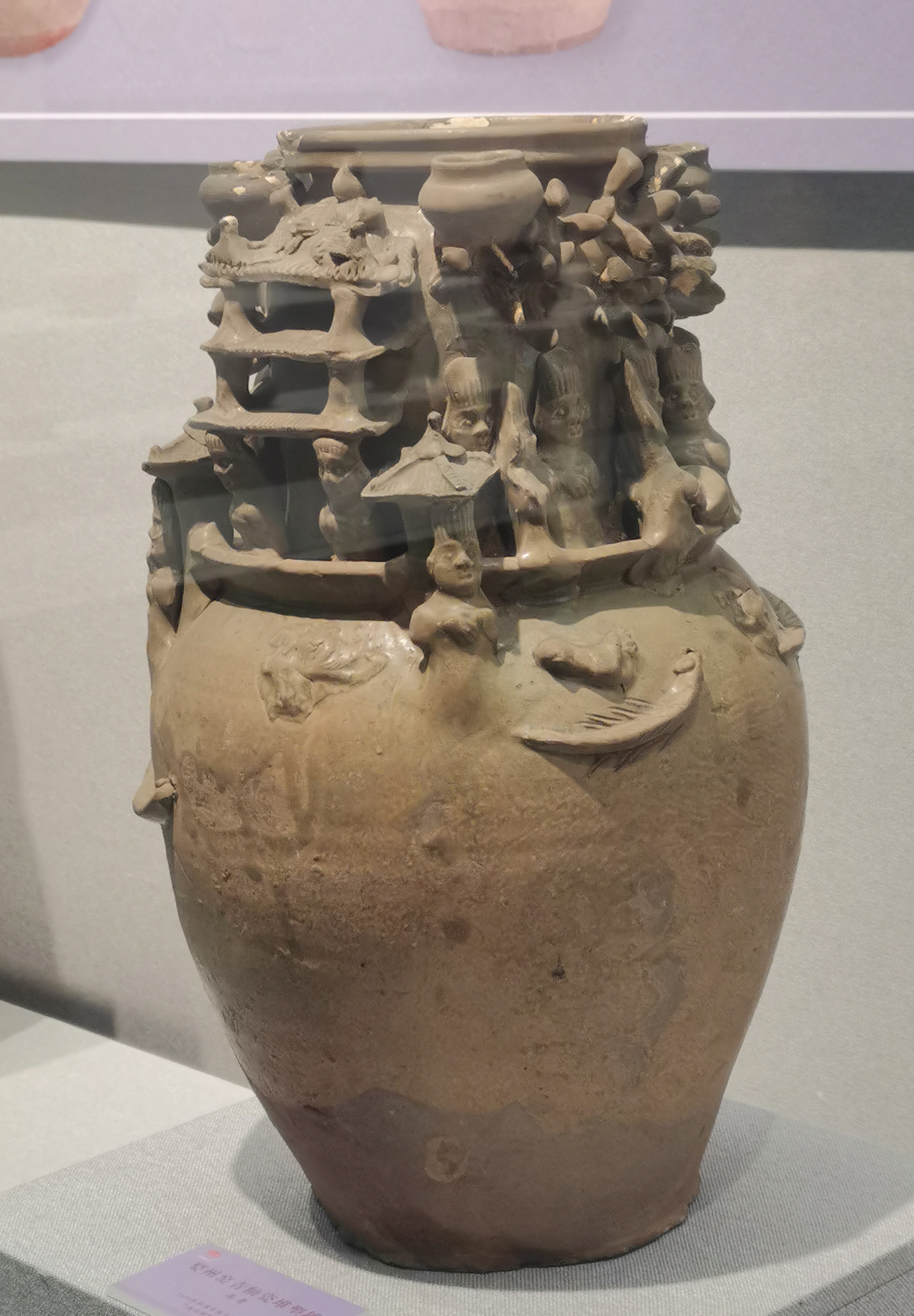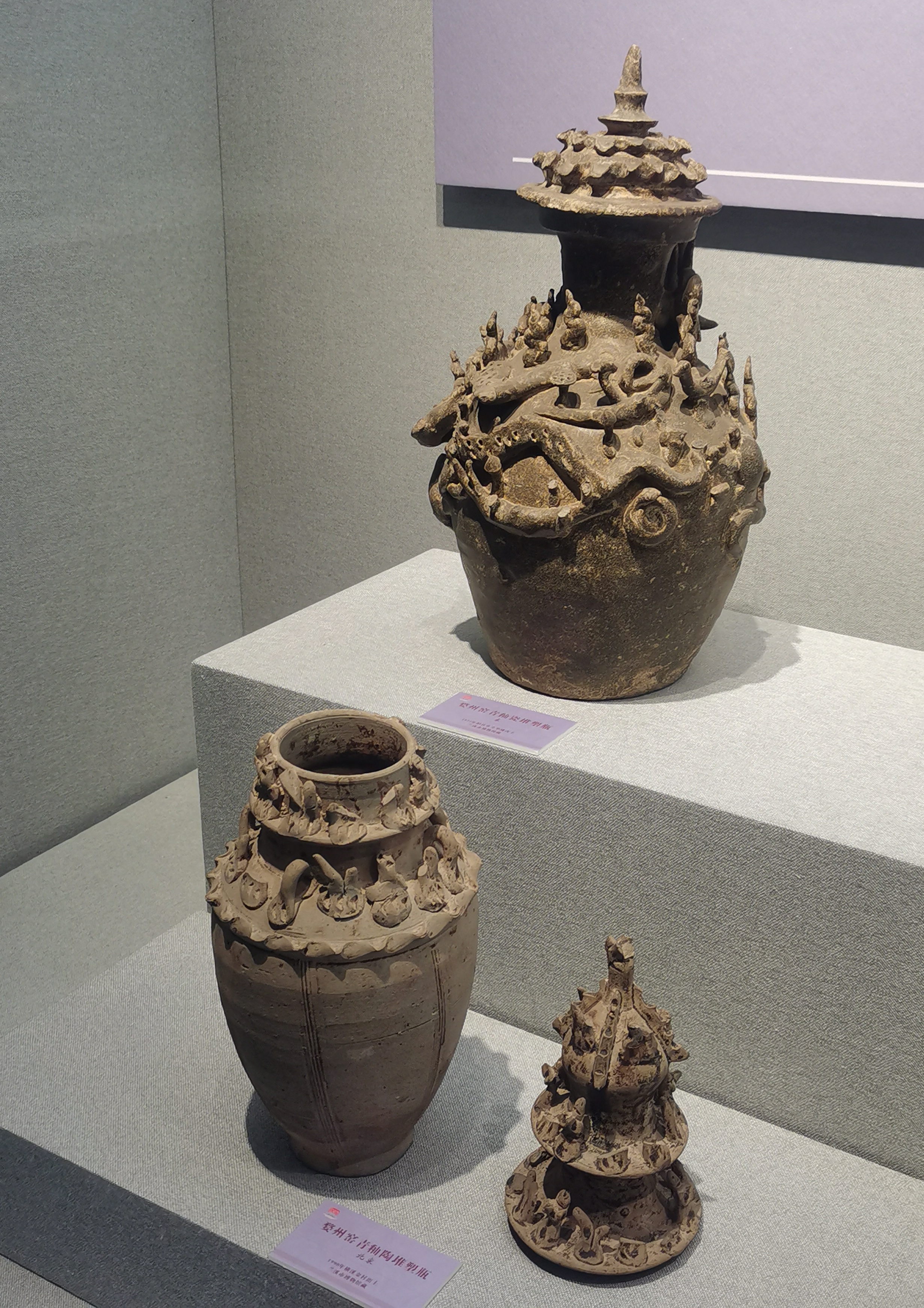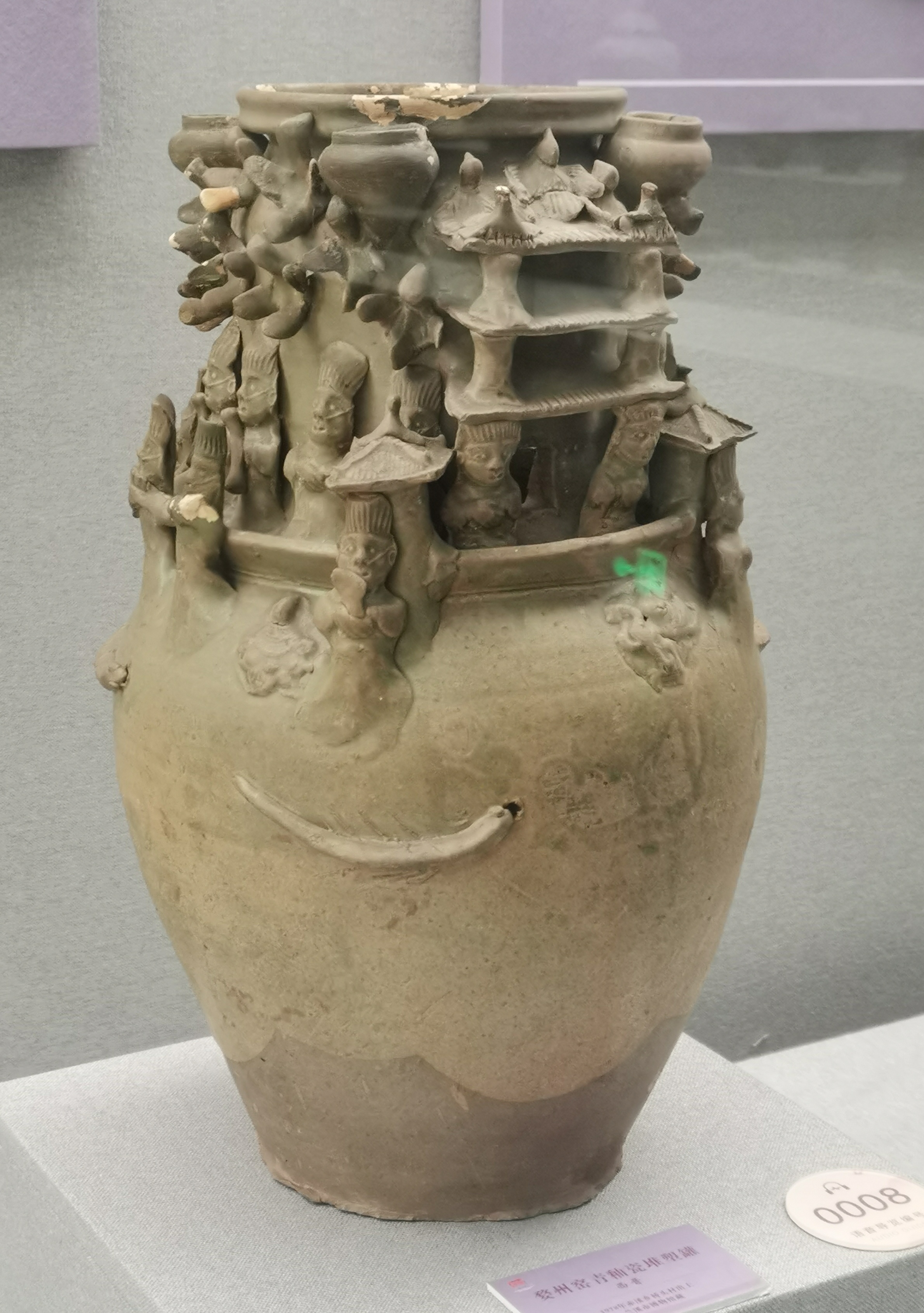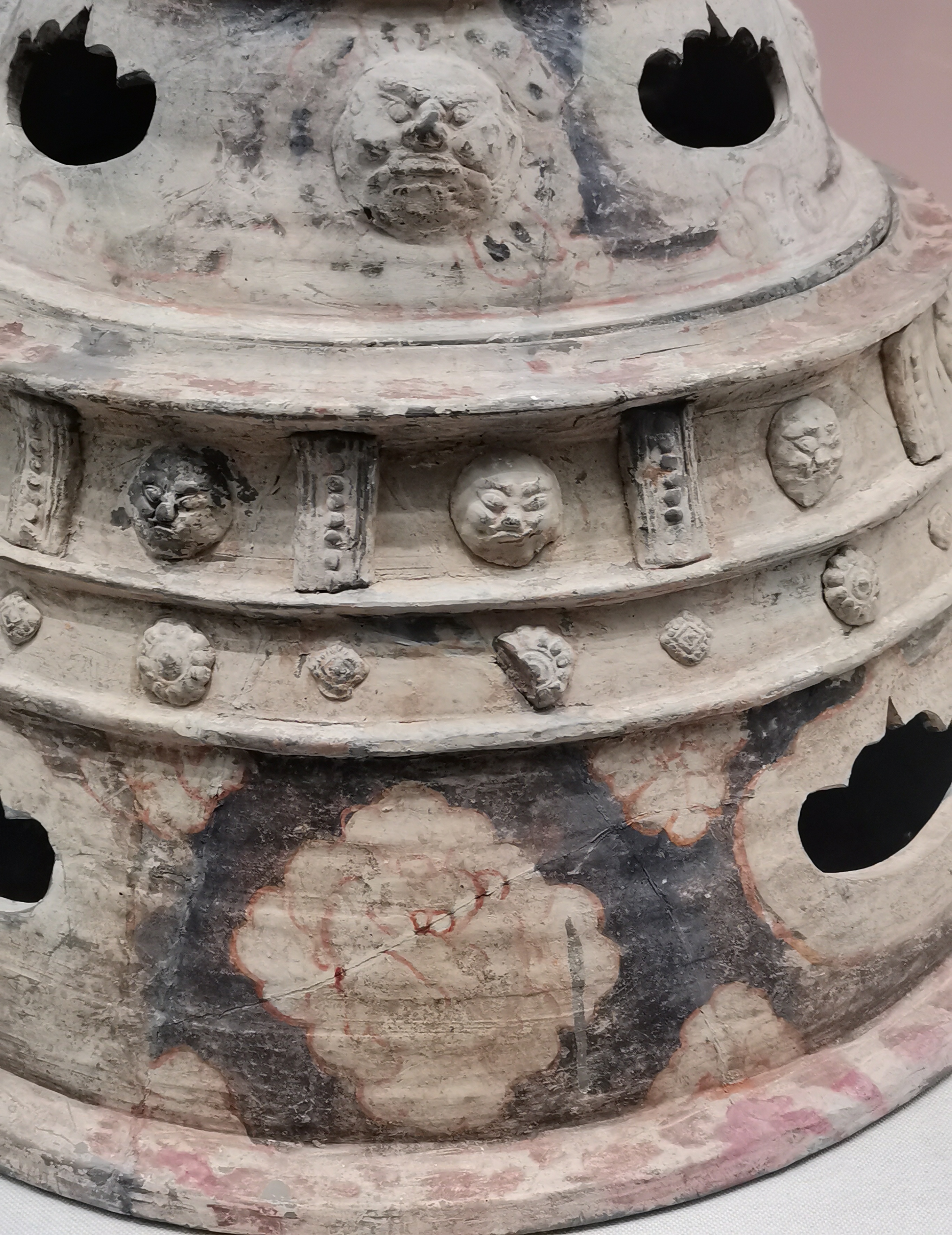 谷仓,又称魂瓶、五谷仓,源于三国两晋,由汉代五联罐演变而来,是用来护尸、告慰死者灵魂,寄托生者愿望的随葬明器,也是古人熬谷习俗和神仙飞升信仰的延续。 堆塑瓶,兴起于魏晋时期,常见于江南墓葬,多成对出土,装有五谷。宋元时受道教以及虎崇拜的影响,出现了堆塑的龙虎瓶,多产自越窑、龙泉窑及景德镇窑。 多角瓶流行于唐末五代及两宋时期,常见于湖南、福建地区。因“角”与“谷”音近,故“多角”又寓意“多谷”,寄托了人们对五谷丰收的希冀,以及对亲人无尽的思念与祈愿。清代多管瓶成了装饰品,多用于插花。 堆塑瓶是墓主灵魂寄居的归宿,承担着为灵魂升天保驾护航的职责。瓶身上部堆塑亭台楼阁、飞禽走兽、人物等装饰,颈部常雕刻着亭台仙阁、仙人灵兽等。而飞龙在天、佛道仙人、灵兽莲瓣以及腾云驾雾等形象的交织,体现佛道文化的碰撞和融合。 塔形魂器,又称塔式罐,是唐代至辽初北方地区流行的一种明器,以三彩釉陶、彩绘陶最为多见,体现了佛教安托逝者亡灵的愿望。 晚唐社会动荡,尤其是唐武宗灭佛后,开始流行随葬铁猪石龙等厌胜之物。塔式罐的盖纽一般简化为水滴形,后逐渐消亡。 塔式罐形似佛教中的窣堵坡而得名,罐盖模拟印度佛塔的七重相轮,相当于塔刹;罐腹浑圆相当于塔身;莲瓣模拟了佛塔的须弥座。 大同辽代早期的陶制魂塔,与西安的唐三彩塔式罐较接近。受其影响的还有后来宋元时江南的皈依瓶、元代的四灵塔式罐、明代的将军罐等。