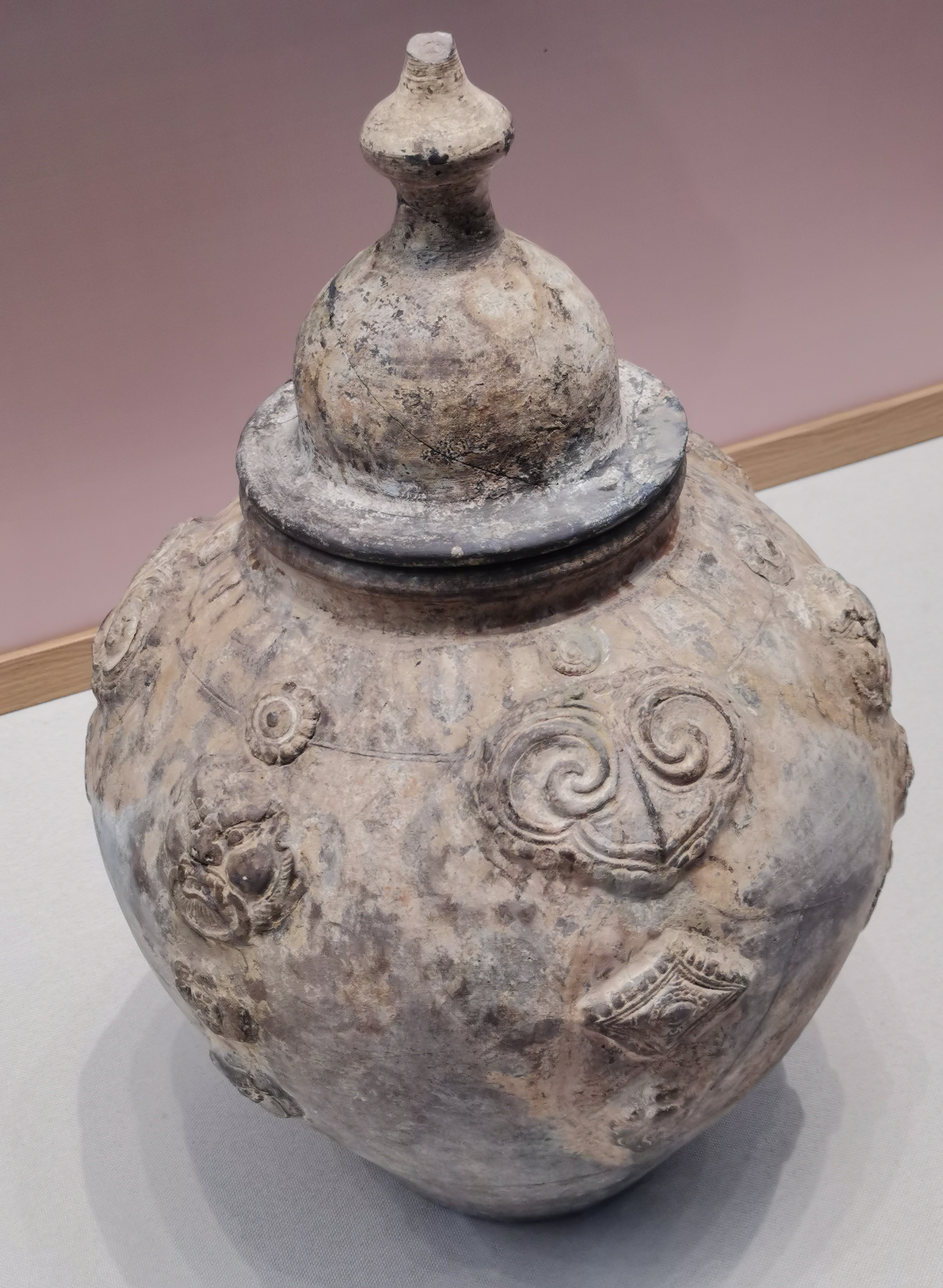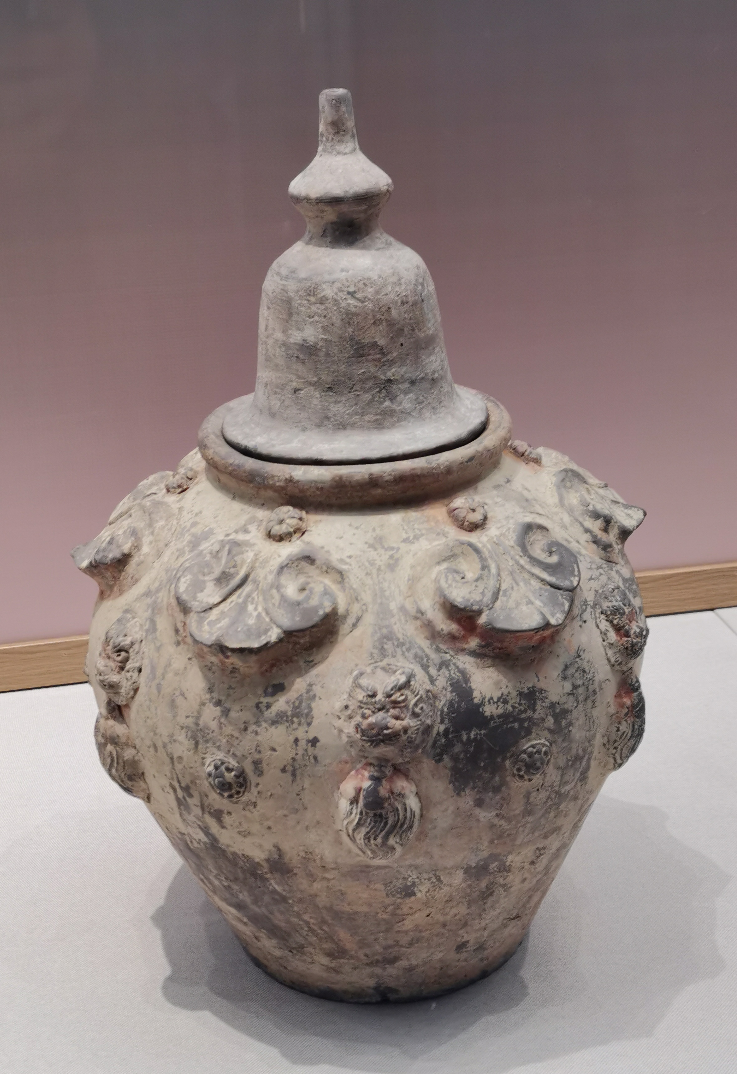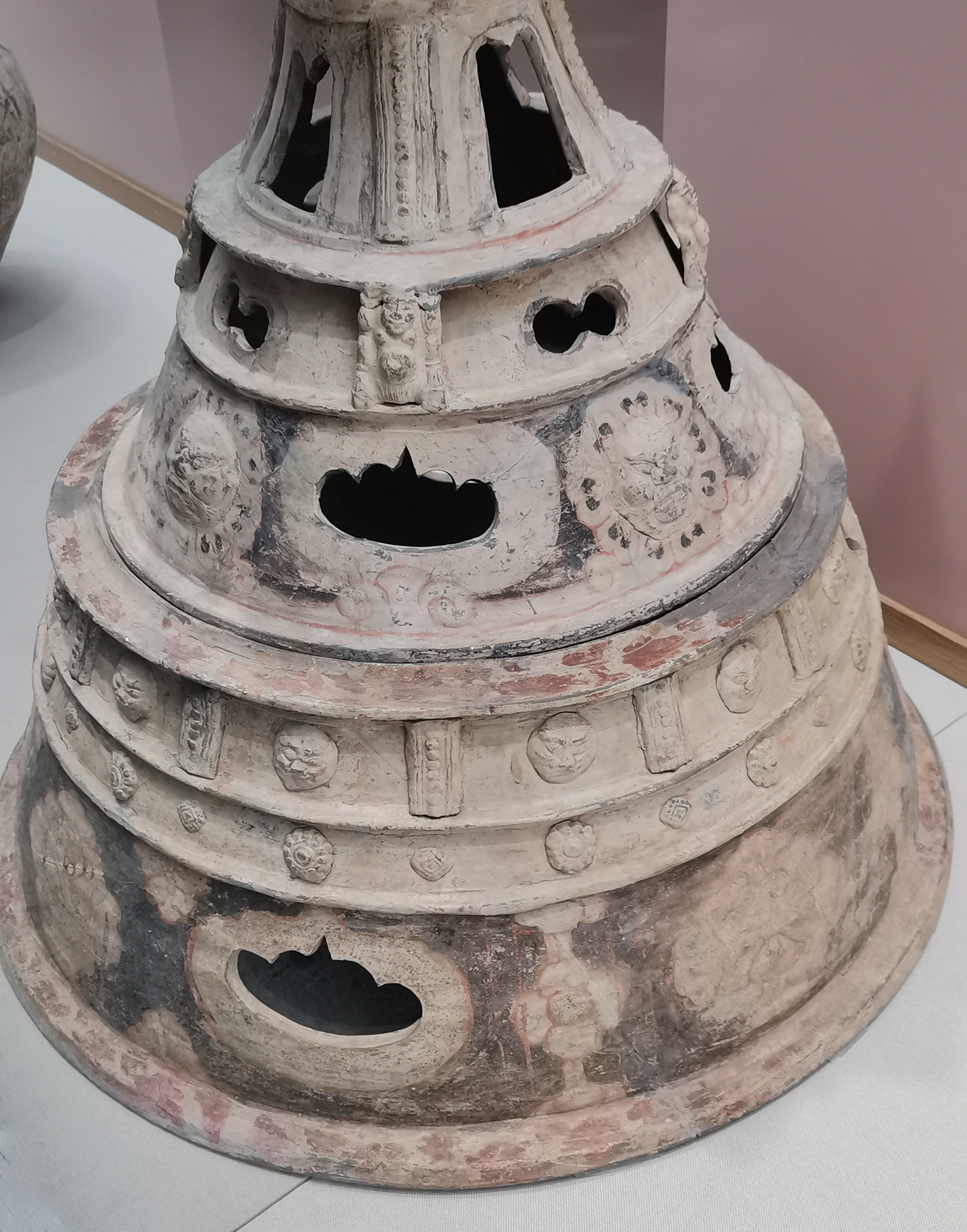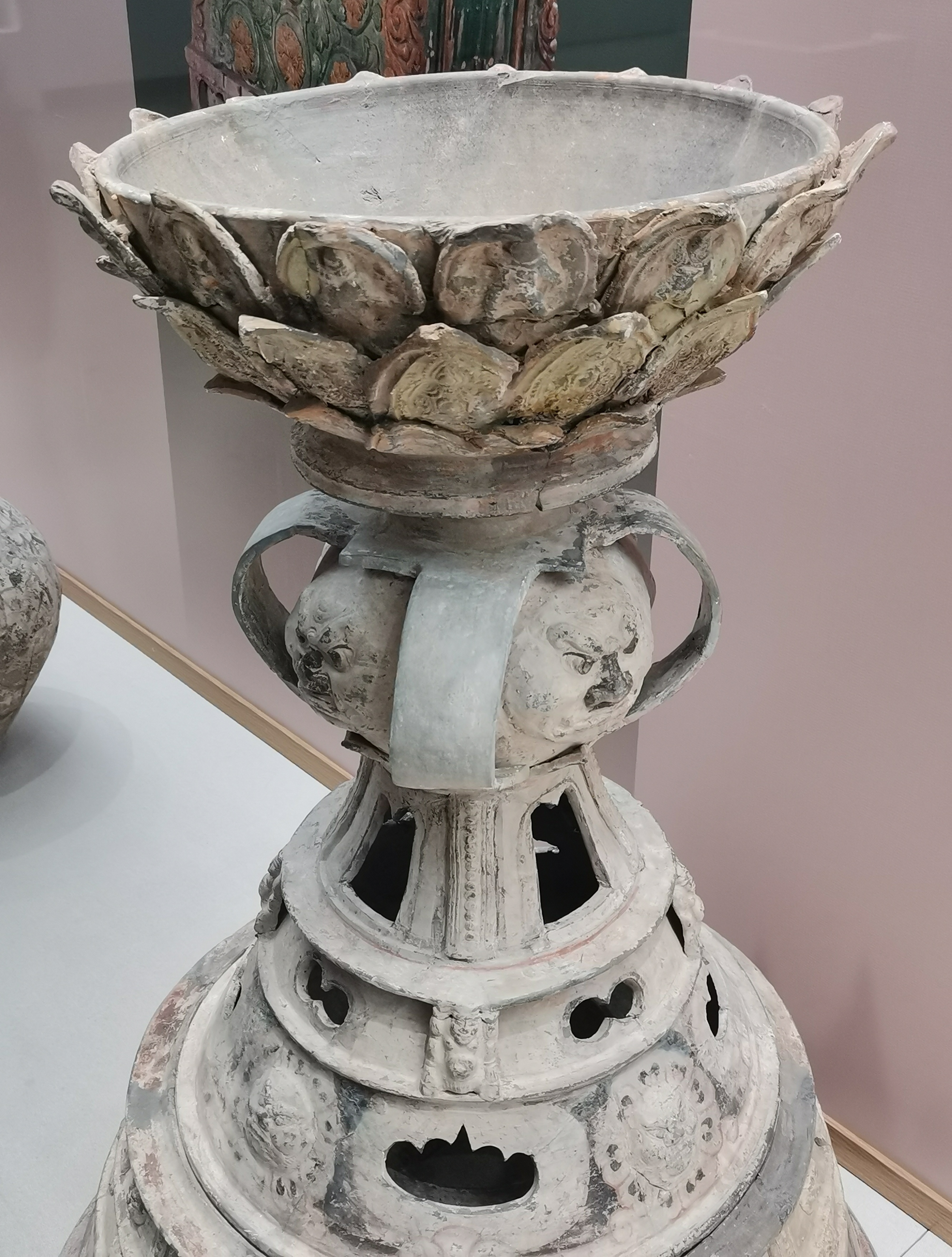 谷仓,又称魂瓶、五谷仓,源于三国两晋,由汉代五联罐演变而来,是用来护尸、告慰死者灵魂,寄托生者愿望的随葬明器,也是古人熬谷习俗和神仙飞升信仰的延续。 堆塑瓶,兴起于魏晋时期,常见于江南墓葬,多成对出土,装有五谷。宋元时受道教以及虎崇拜的影响,出现了堆塑的龙虎瓶,多产自越窑、龙泉窑及景德镇窑。 多角瓶流行于唐末五代及两宋时期,常见于湖南、福建地区。因“角”与“谷”音近,故“多角”又寓意“多谷”,寄托了人们对五谷丰收的希冀,以及对亲人无尽的思念与祈愿。清代多管瓶成了装饰品,多用于插花。 堆塑瓶是墓主灵魂寄居的归宿,承担着为灵魂升天保驾护航的职责。瓶身上部堆塑亭台楼阁、飞禽走兽、人物等装饰,颈部常雕刻着亭台仙阁、仙人灵兽等。而飞龙在天、佛道仙人、灵兽莲瓣以及腾云驾雾等形象的交织,体现佛道文化的碰撞和融合。 塔形魂器,又称塔式罐,是唐代至辽初北方地区流行的一种明器,以三彩釉陶、彩绘陶最为多见,体现了佛教安托逝者亡灵的愿望。 晚唐社会动荡,尤其是唐武宗灭佛后,开始流行随葬铁猪石龙等厌胜之物。塔式罐的盖纽一般简化为水滴形,后逐渐消亡。 塔式罐形似佛教中的窣堵坡而得名,罐盖模拟印度佛塔的七重相轮,相当于塔刹;罐腹浑圆相当于塔身;莲瓣模拟了佛塔的须弥座。 大同辽代早期的陶制魂塔,与西安的唐三彩塔式罐较接近。受其影响的还有后来宋元时江南的皈依瓶、元代的四灵塔式罐、明代的将军罐等。