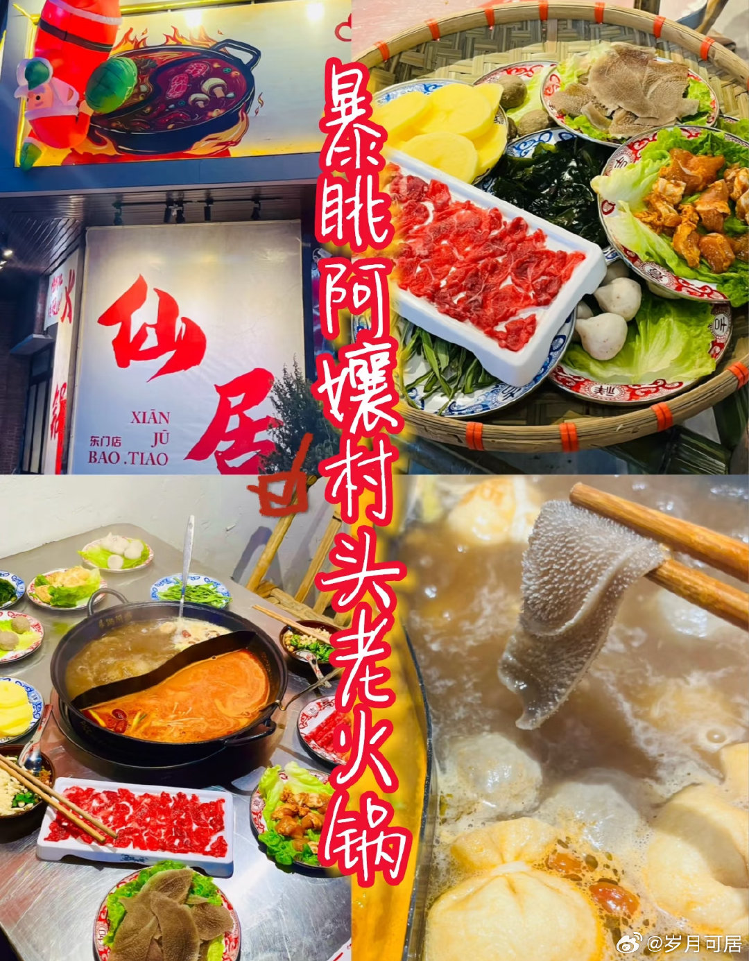 2025台州味蕾周游记|仙居篇,暴跳阿嬢村头老火锅仙居城区和乡镇都有分店,这家是东门店,一到亮堂店铺就觉得门面很有范儿,位置宽敞有两层装修接地气,满满村口聚餐的人间烟火气❗️菜品品类挺多的陈列柜冷藏保鲜,有专人现切的除去内脏之类的看着还是挺新鲜的,统一价位素菜五块一碟、荤菜十块一碟,偏自助类型要吃啥自己拿篮子拿。菜分量不是很多,价位估计与本地火锅店差不多能消费得起算合理。