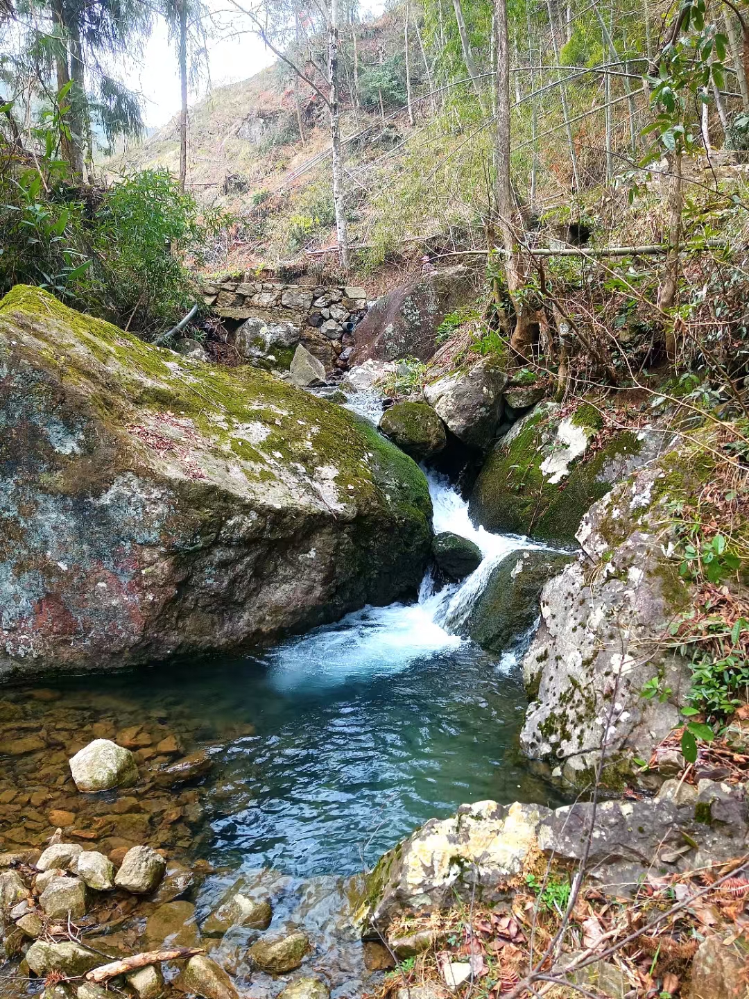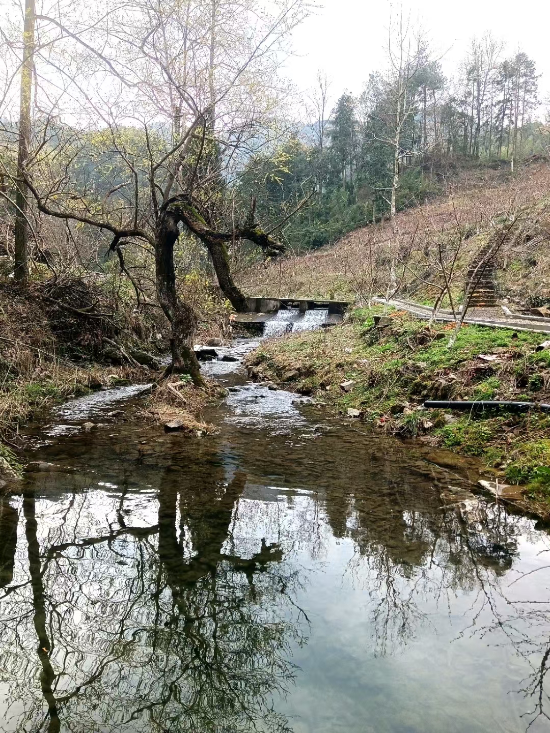 绝句·野趣(平水韵) 浅洼云影天青色 石涧斜枝流水声 一簇野樱无寂寞 零星鸟语似多情