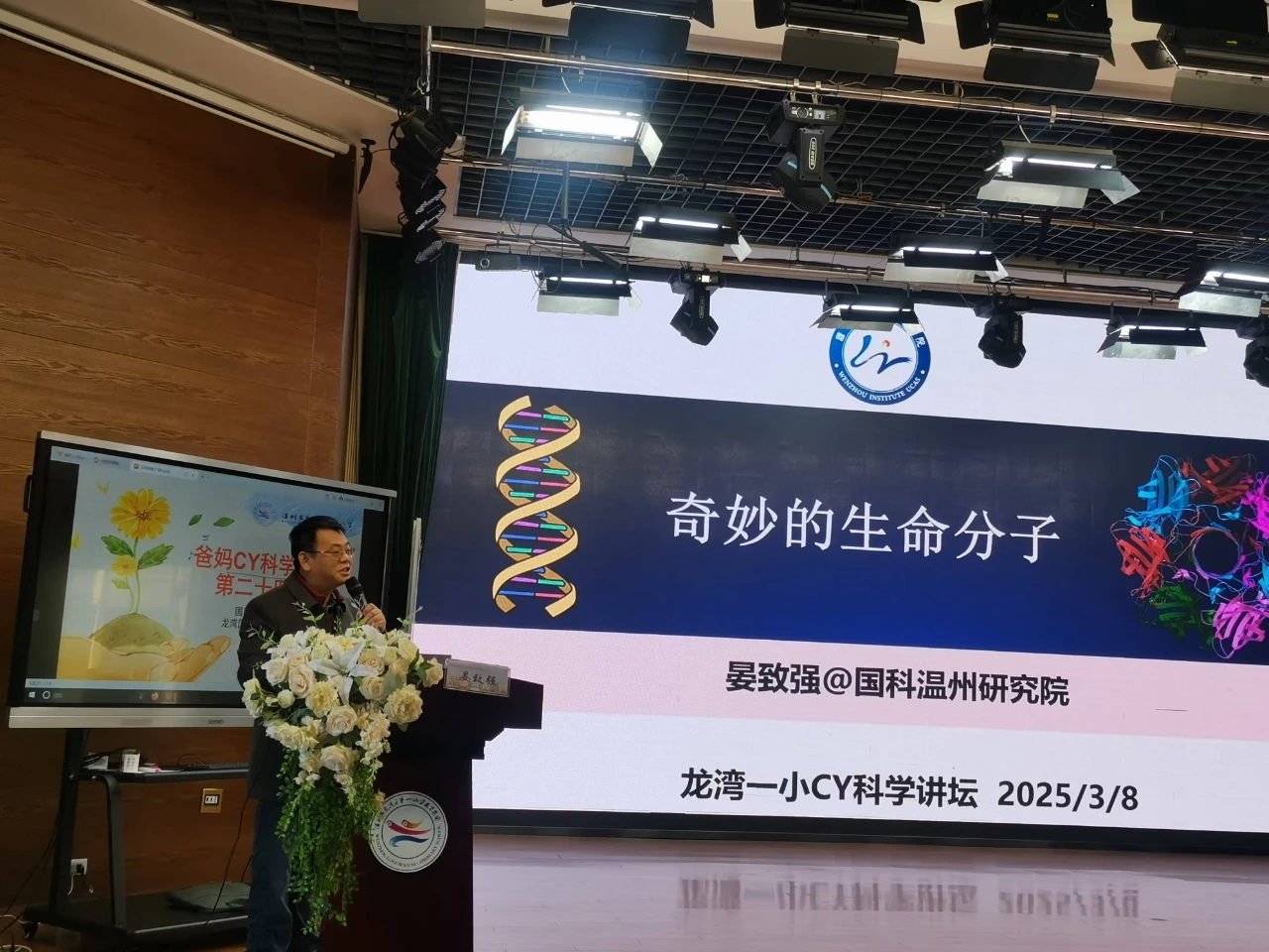 #潮闻小记者# 科学世界的魅力之奇妙的生命分子 第二十四期CY讲坛如约而至,本次讲坛有幸邀请到国科温州研究院的晏致强博士担任主讲嘉宾。同学们怀着期待的心情来到现场,聆听晏致强博士为我们带来的一场生动有趣的《奇妙的生命分子》科普讲座。本次活动以“探索生命奥秘,播撒科学种子”为主题,通过生动的案例、互动实验和科学家成长故事的分享,让同学们近距离感受生命科学的魅力。 小记者团特别报道——走进奇妙的生命分子:与晏致强灿博士的一次有趣又精彩的采访 2025年3月8日上午,龙湾区第一小学教育集团潮新闻代表团非常荣幸地邀请到了国科温州研究院晏致强博士,他带来了一场关乎生命分子奥秘的深度分享。小记者们准备了大家感兴趣和有深度的问题,接下来让我们走进这场精彩的对话感受生命科学带来的神奇力量吧! 小记者李可欣:“晏叔叔,您好!我们是校潮闻小记者李可欣和钱洛曦,听了您的讲座,我们对奇妙的生命分子产生了很大的兴趣,可以问您几个问题吗?” 晏博士:“好的。” 小记者李可欣:“我想问一下晏叔叔,在新闻里、生活中经常看到或听到基因病,这是为什么呢?” 晏博士:“这里有很多环境因素,还有随机因素会导致基因的突变,基因突变之后,就会导致蛋白质发生变化。那么,蛋白质发生变化之后,就会影响这个细胞里的功能,这样就会产生病变。” 小记者李可欣:“晏叔叔,我还有个问题想问你,线粒体为什么会有自己的DNA?它和细胞核的DNA如何合作?” 晏博士:“线粒体里面确实有一部分DNA,它是一个辅助的作用,我们人体主要的信息是在细胞核里。” 小记者钱洛曦:“晏叔叔好,我也有几个问题想问一下,您觉得人工智能是如何帮助生命分子的研究的呢?” 晏博士:“人工智能现在最近五年发展非常快,不仅在我们这个生命分子的设计方面有很大的发展,在其他的方面有很大的发展,就像你们有没有听过阿尔法蛋围棋机器人,但最初在别的地方也有很多发展。在我们生命领域最近几年有突飞猛进的发展,包括这个蛋白质设计,还有这个我们大数据学习已有的这种遗传信息,我们能够去更深刻的了解。这遗传信息之间的这种关联机制,然后为我们后面的蛋白质设计啊,改造啊,还有基因编辑啊,提供这个帮助,是这样的。” 小记者钱洛曦:“还有一个问题,DNA为什么是双螺旋结构?这种结构对于传递一串信息有什么帮助呢?这个问题我在上课的时候还有点不懂。” 晏博士:“DNA双螺旋结构首先它是一个一配对的关系,我今天讲了它有四个碱基,对吧,它是两条链之间相互配对,所以它一定是两条链才能配对,是吧?然后双螺旋,它能够紧密的堆积在一起。用螺旋之后比直线更节省空间,然后螺旋它也容易解开,两条也容易解开,所以它采用这种非常优化的一种结构,它节省空间又能够保持信息的传递。” 小记者钱洛曦、李可欣:“谢谢,谢谢晏叔叔。” 通过这次“爸妈别样课堂”之CY讲坛,我们感受到了生命的神奇,还有科学带来的魅力。这场讲座不仅让同学们领略了生命分子的奇妙,更点燃了他们对科学的热爱与责任感。正如晏博士所言:“每一个孩子都是未来的探索者,今天的科学种子,或许就是明天的创新之花。” 文/小记者 五(2)班 钱洛曦