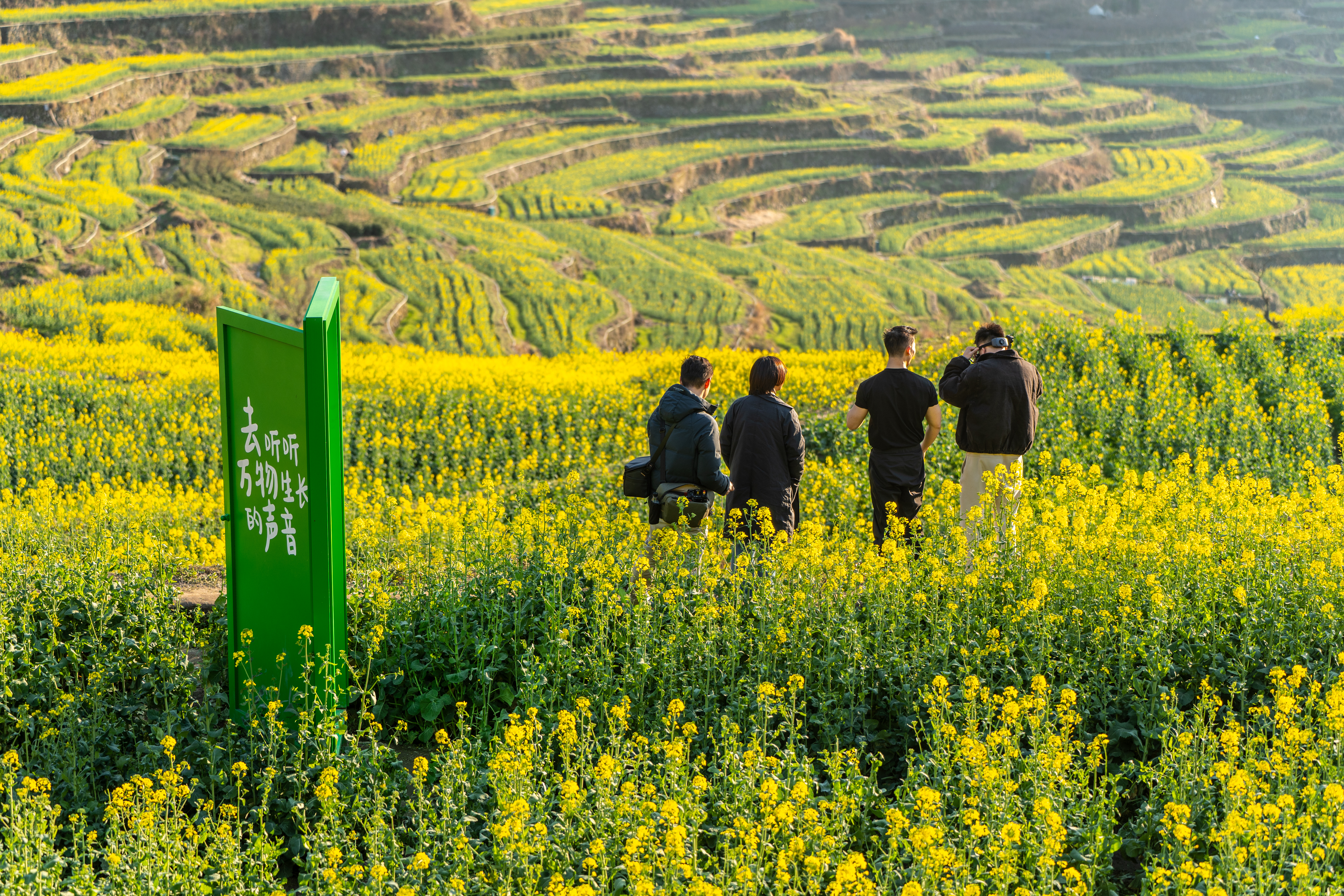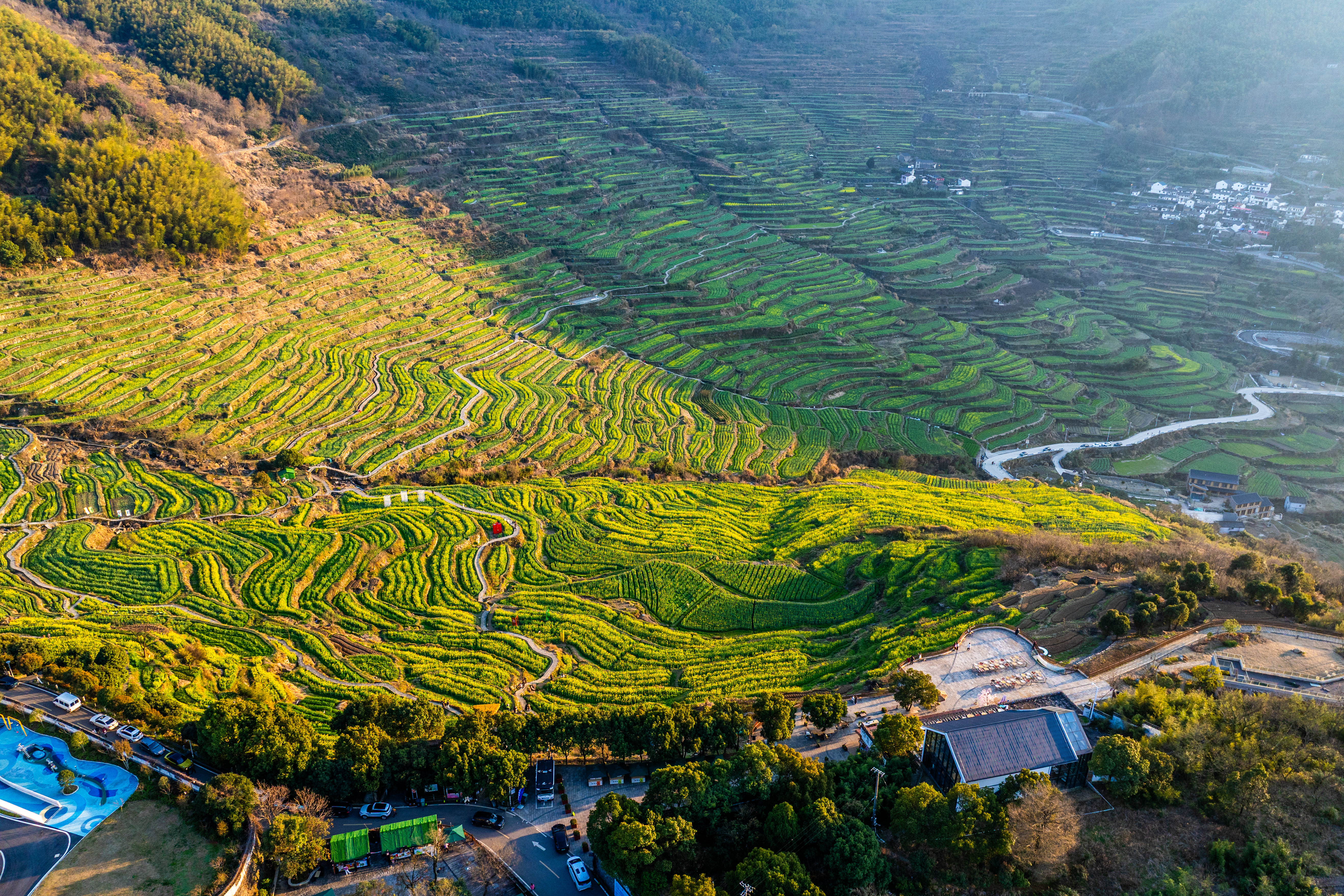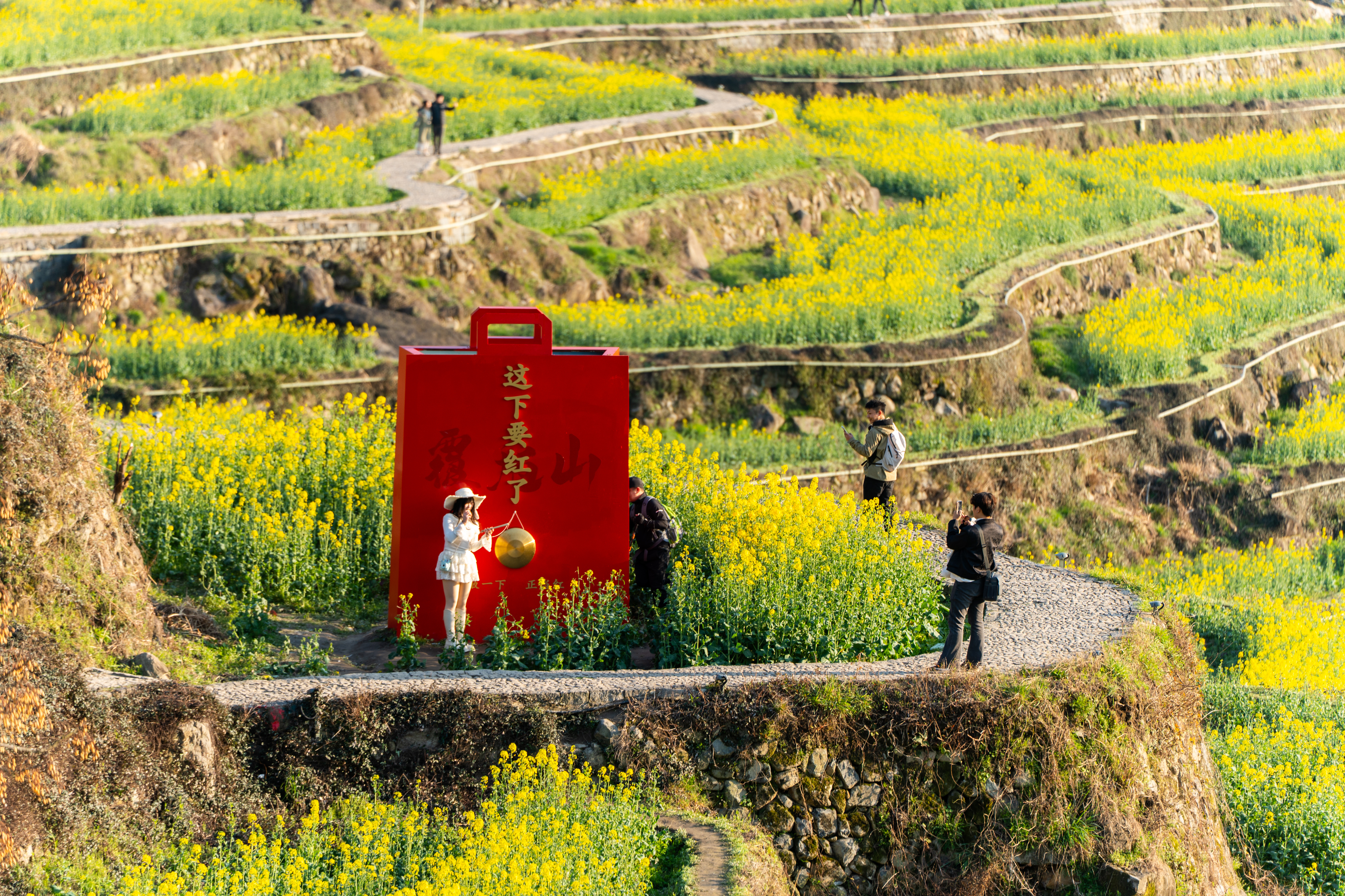 上虞覆卮山的梯田油菜花迎来盛开,游客穿行在梯田的纹理间