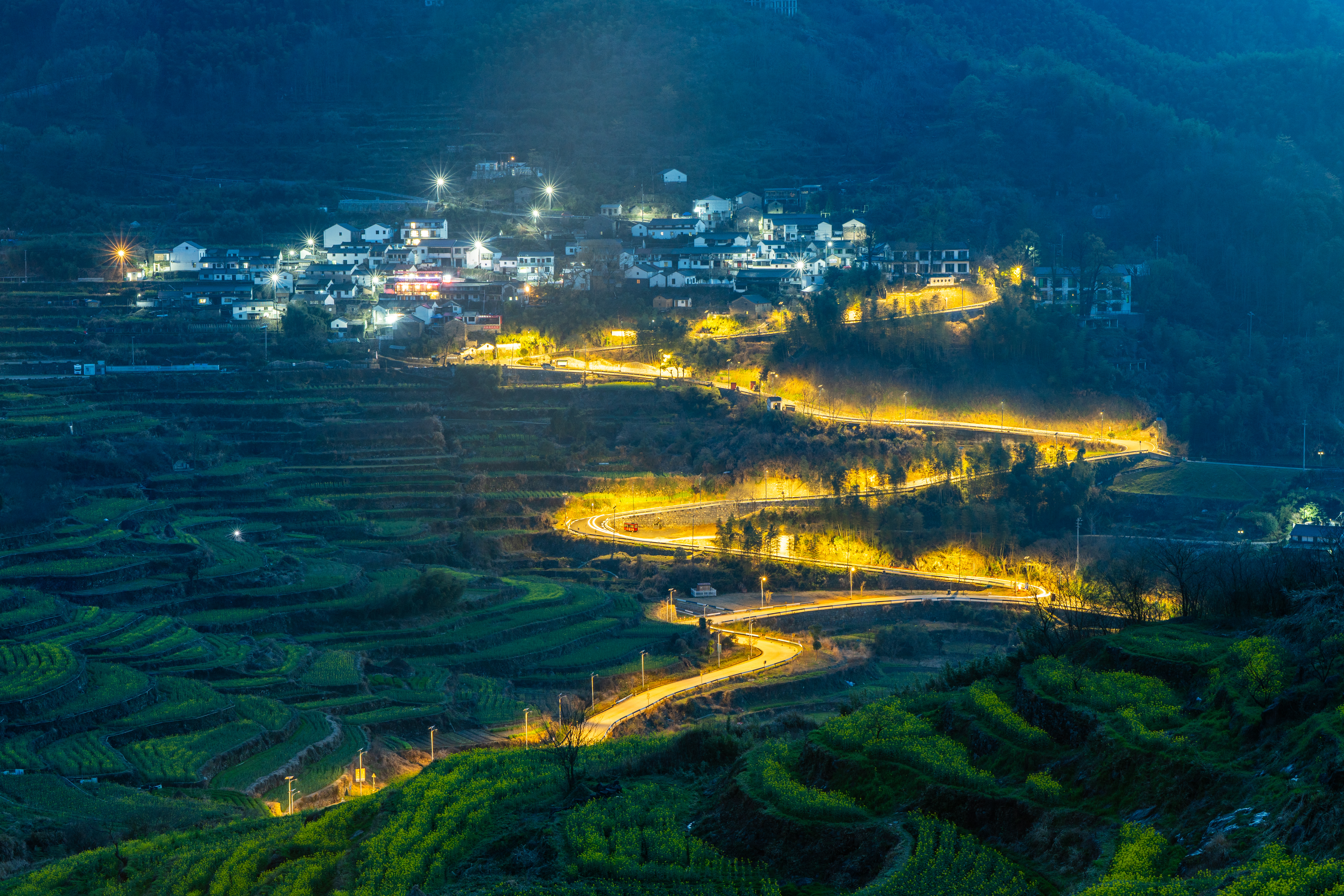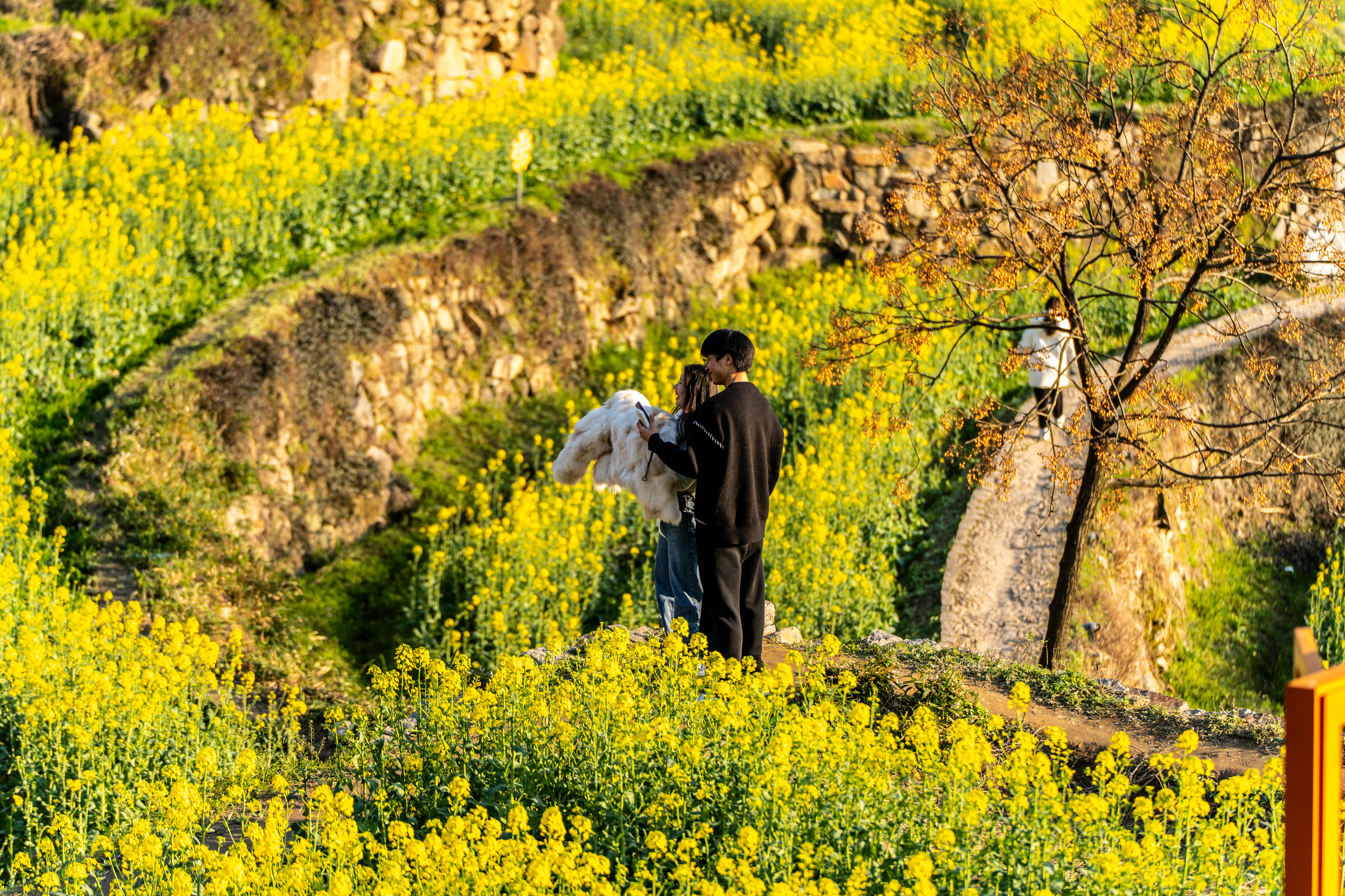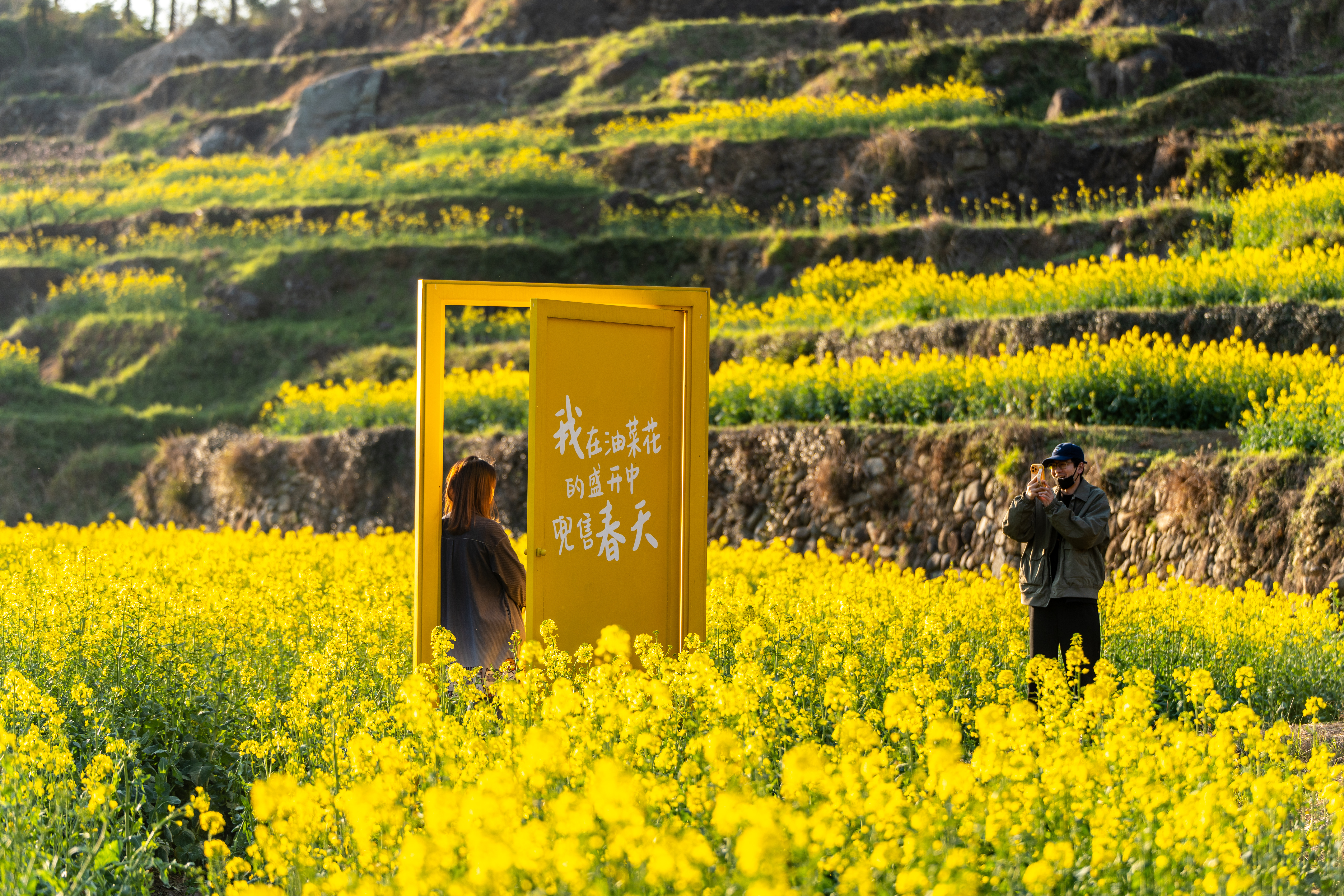 上虞覆卮山的梯田油菜花迎来盛开,游客穿行在梯田的纹理间