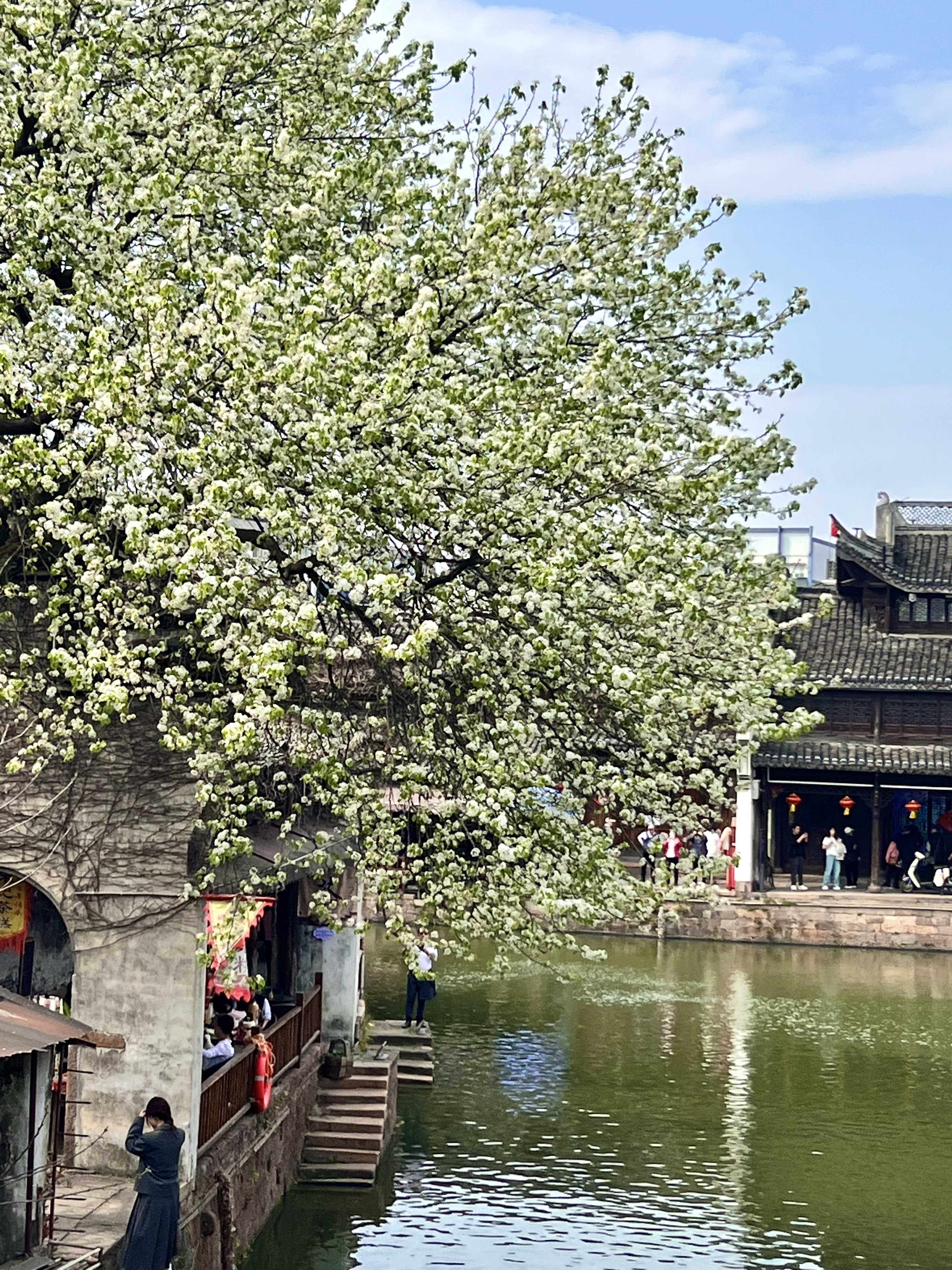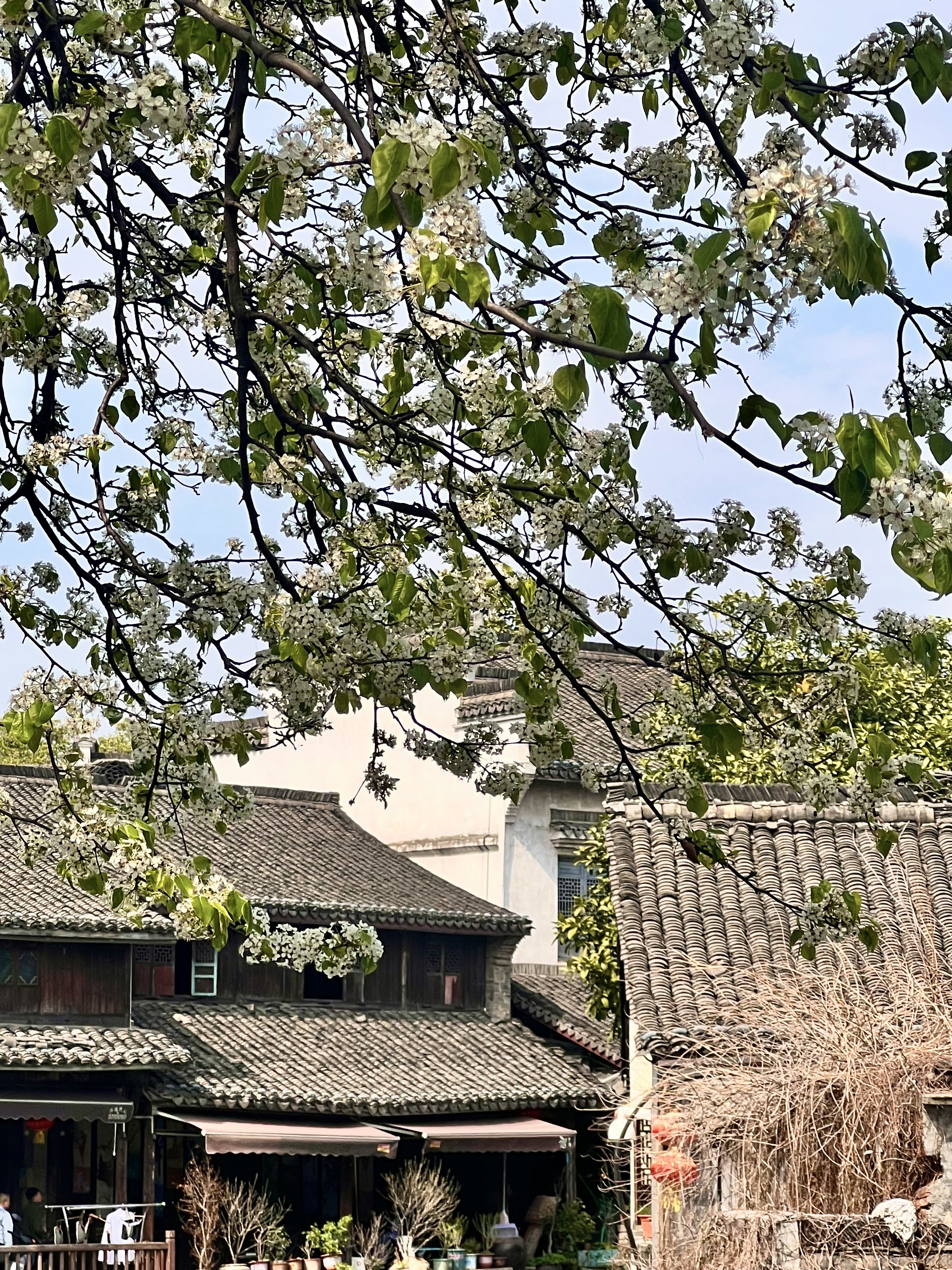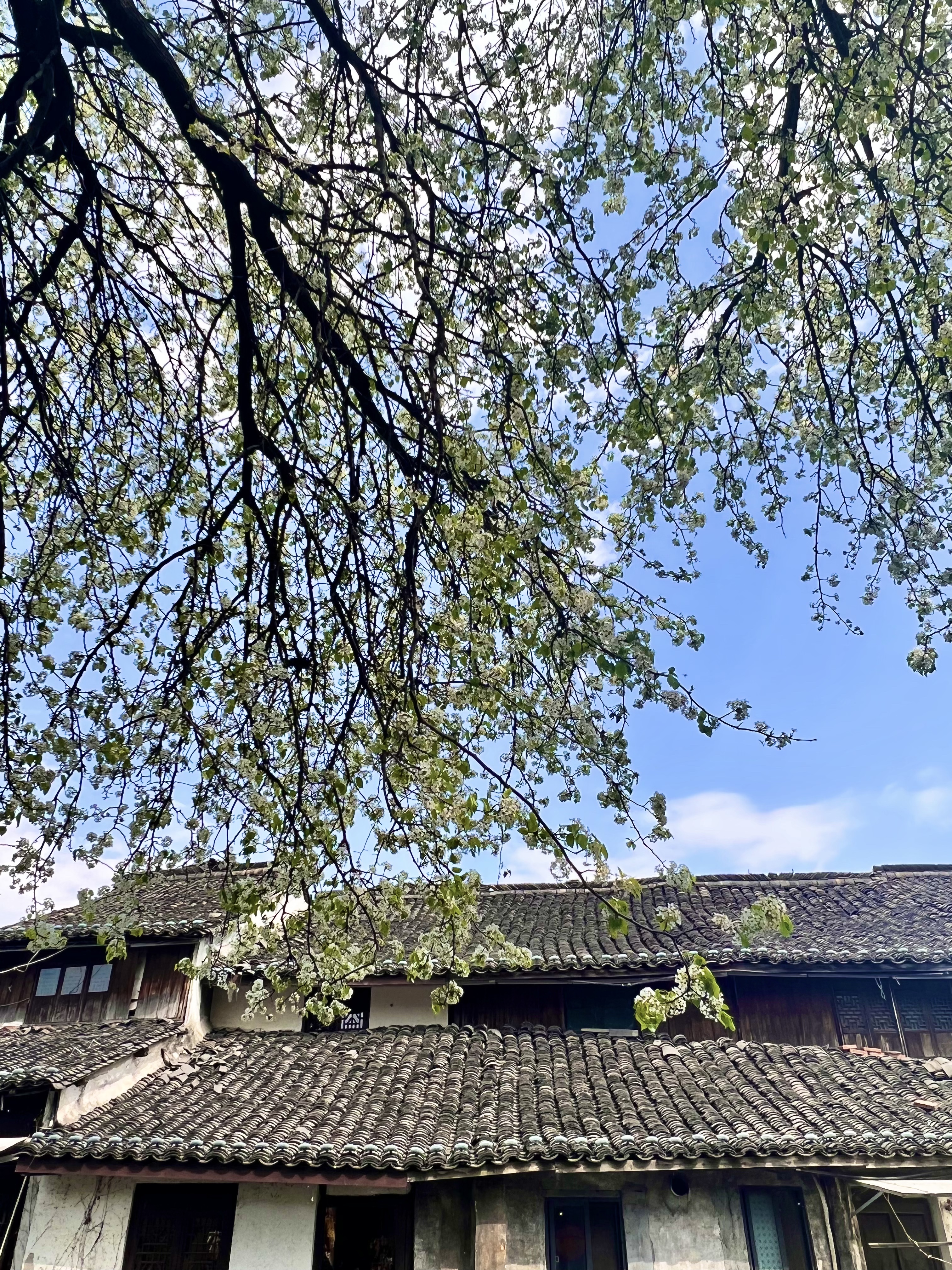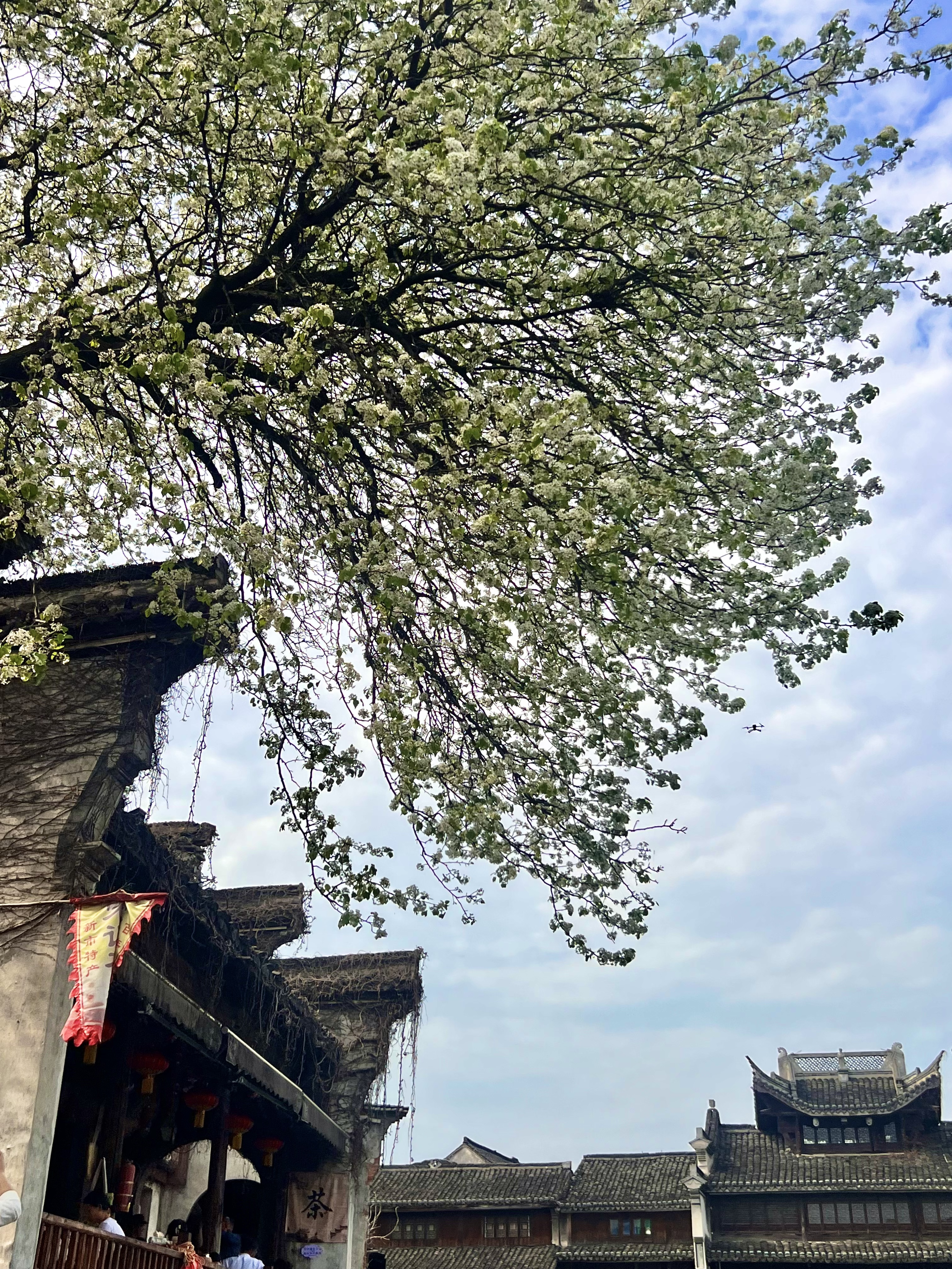 三月去新市古镇,千万别错过了陈家潭的这棵稠李树,树高大、茂密、俊美,高大约有十多米,在那古老的宅屋群落里挺拔耸起,略显向东的招摇斜势,出落得一种惊艳风情,这几天花期已至,开得极旺,远看像是一把大伞被撑开,斜放在西南岸上,路过的人无不惊叹,但大家都把它当作是梨花,只是听当地人说,这树叫稠李树,闻所未闻,春天的花太多又太像,真的很难分辨