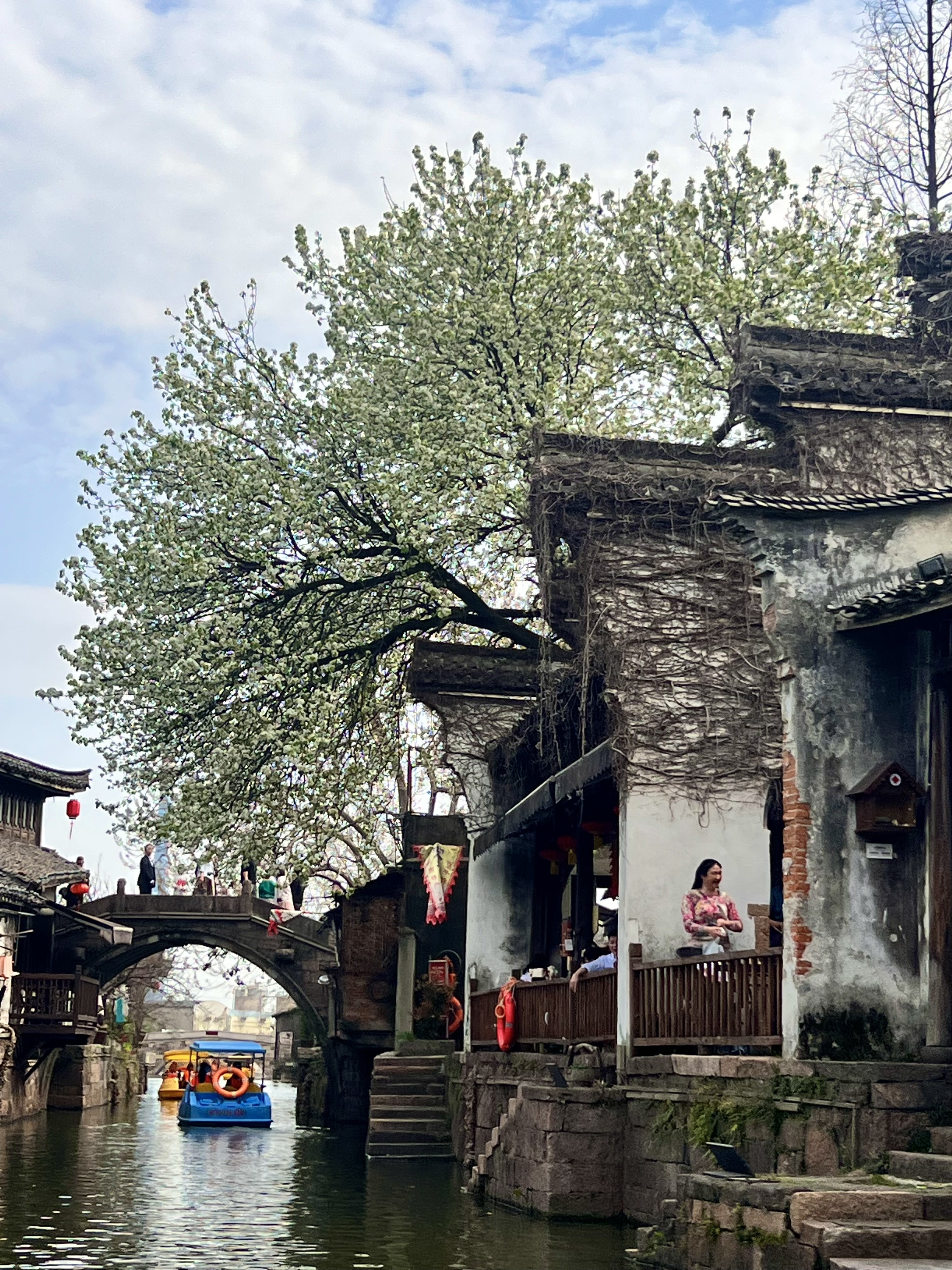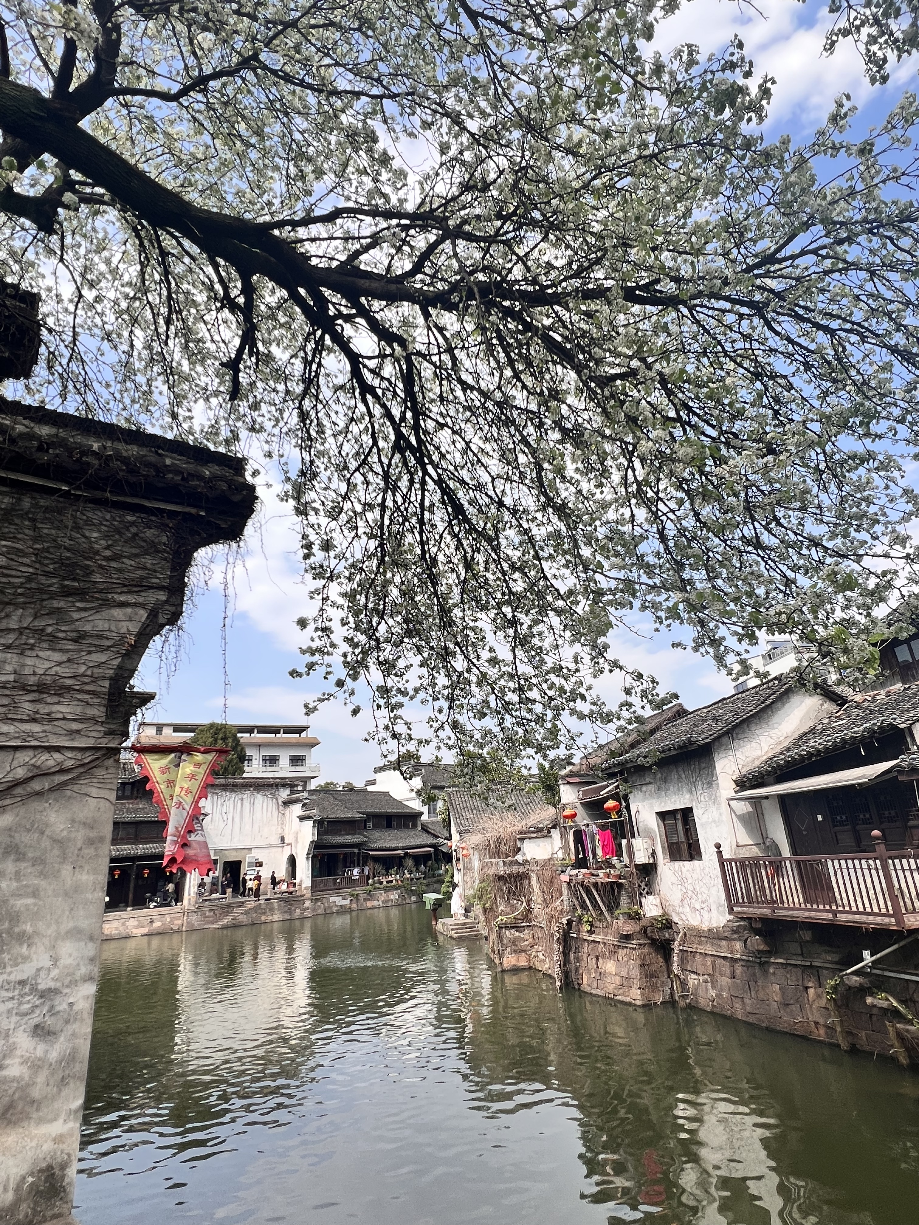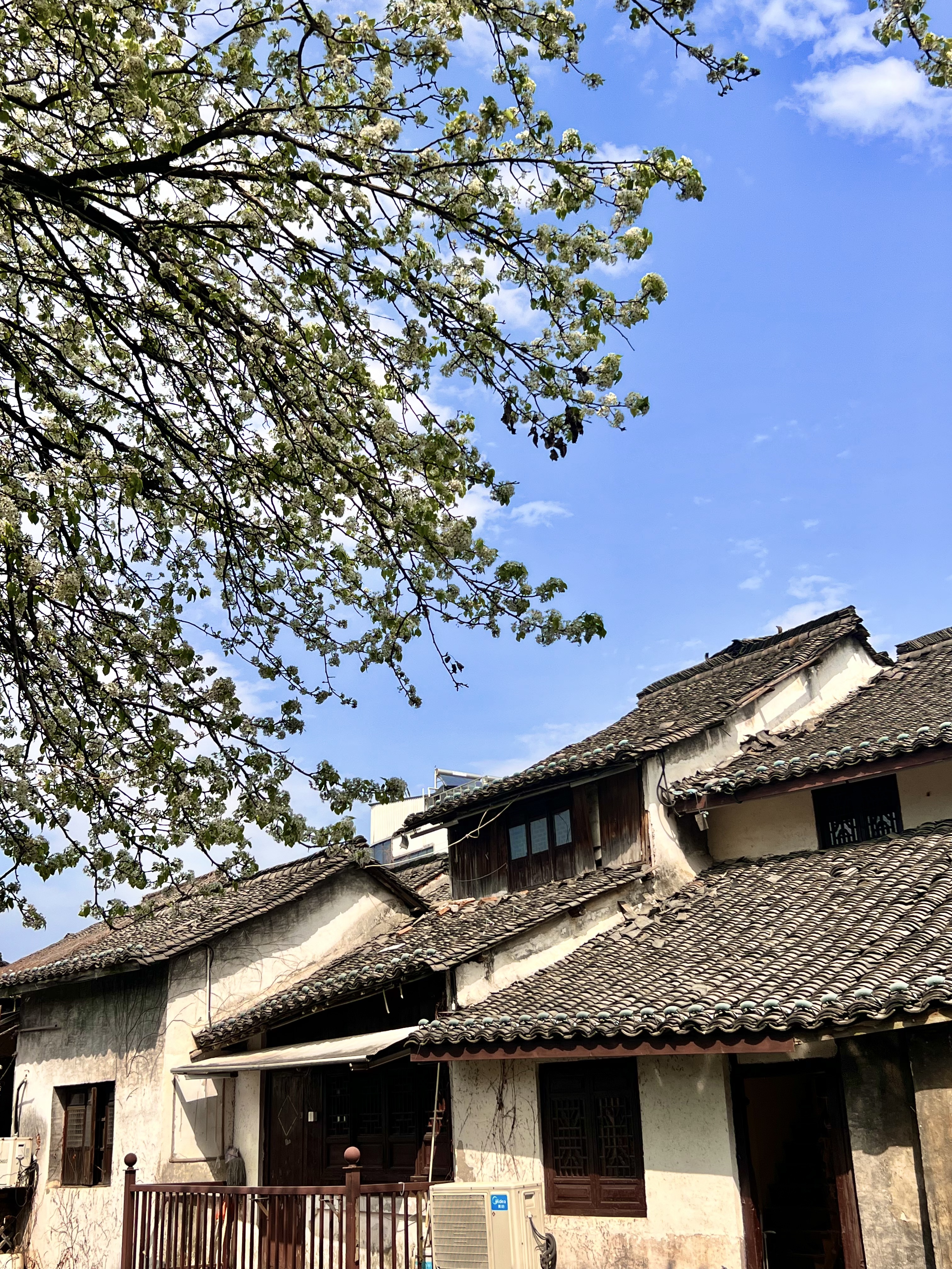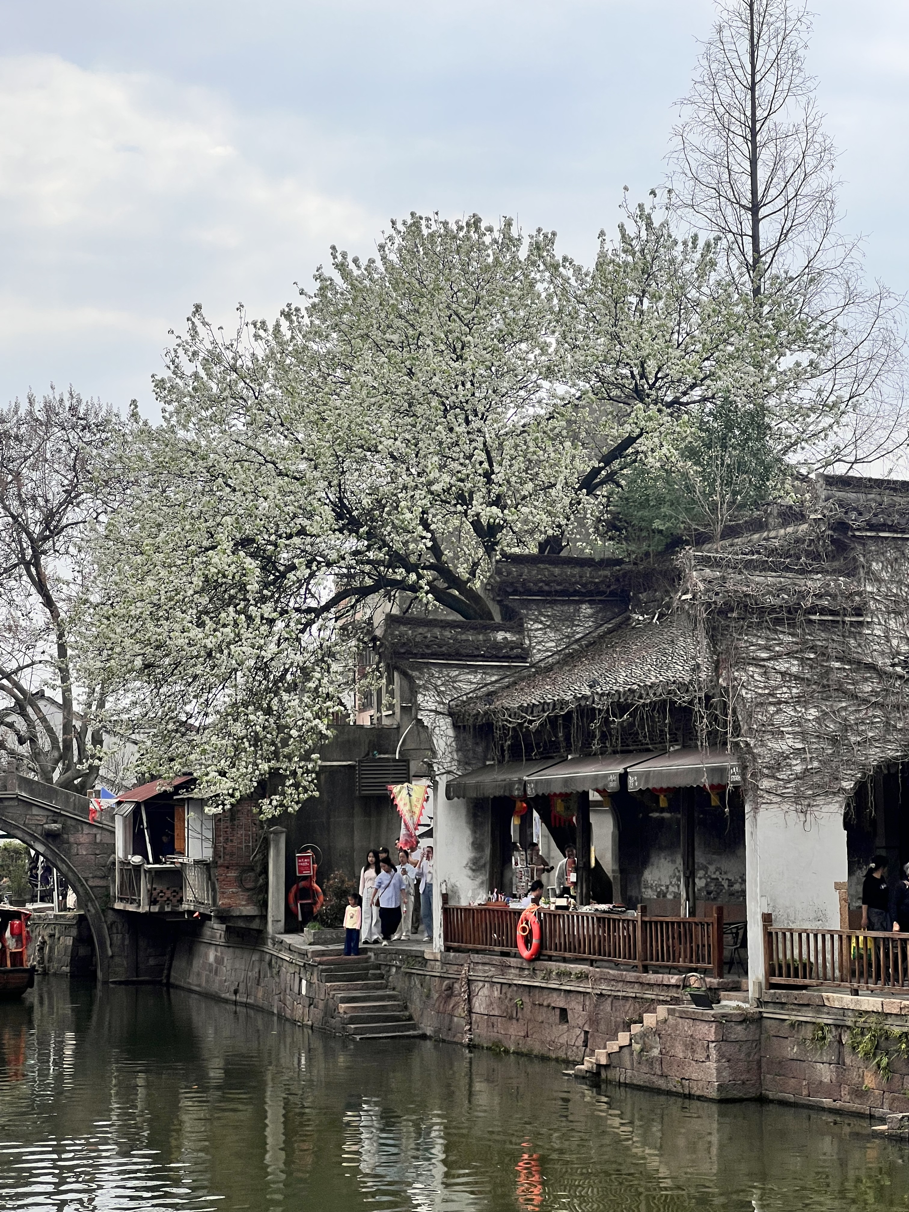 三月去新市古镇,千万别错过了陈家潭的这棵稠李树,树高大、茂密、俊美,高大约有十多米,在那古老的宅屋群落里挺拔耸起,略显向东的招摇斜势,出落得一种惊艳风情,这几天花期已至,开得极旺,远看像是一把大伞被撑开,斜放在西南岸上,路过的人无不惊叹,但大家都把它当作是梨花,只是听当地人说,这树叫稠李树,闻所未闻,春天的花太多又太像,真的很难分辨