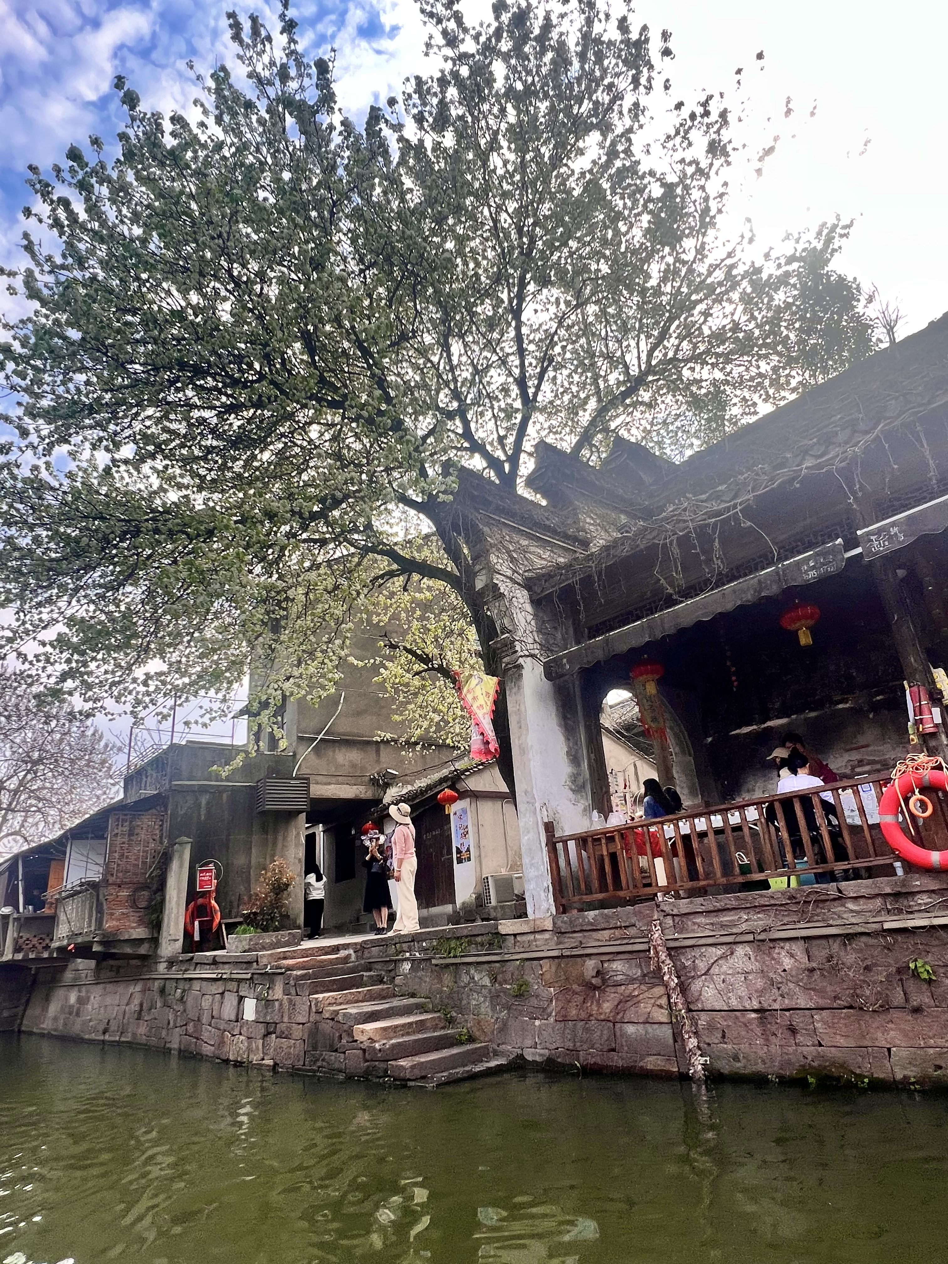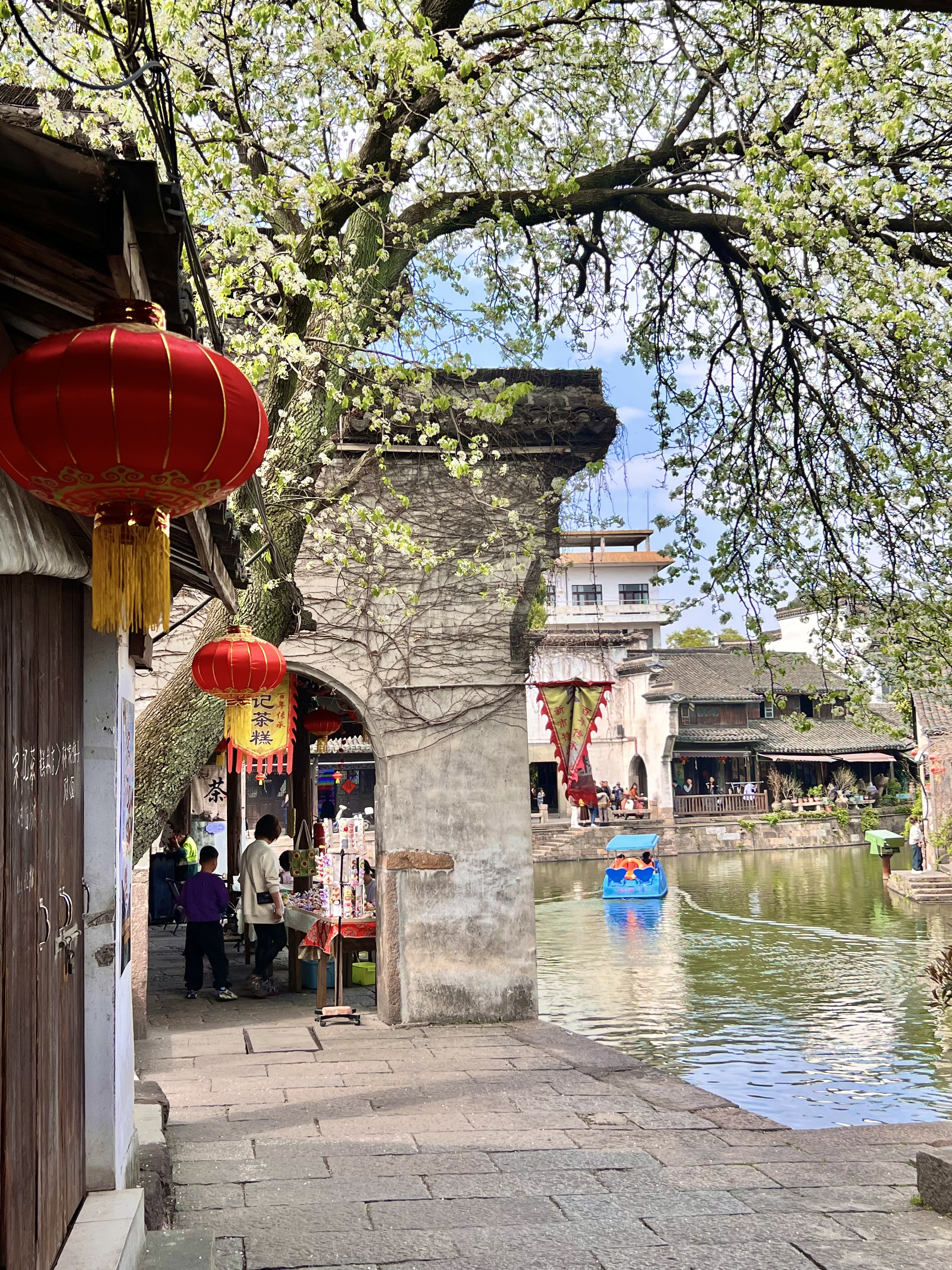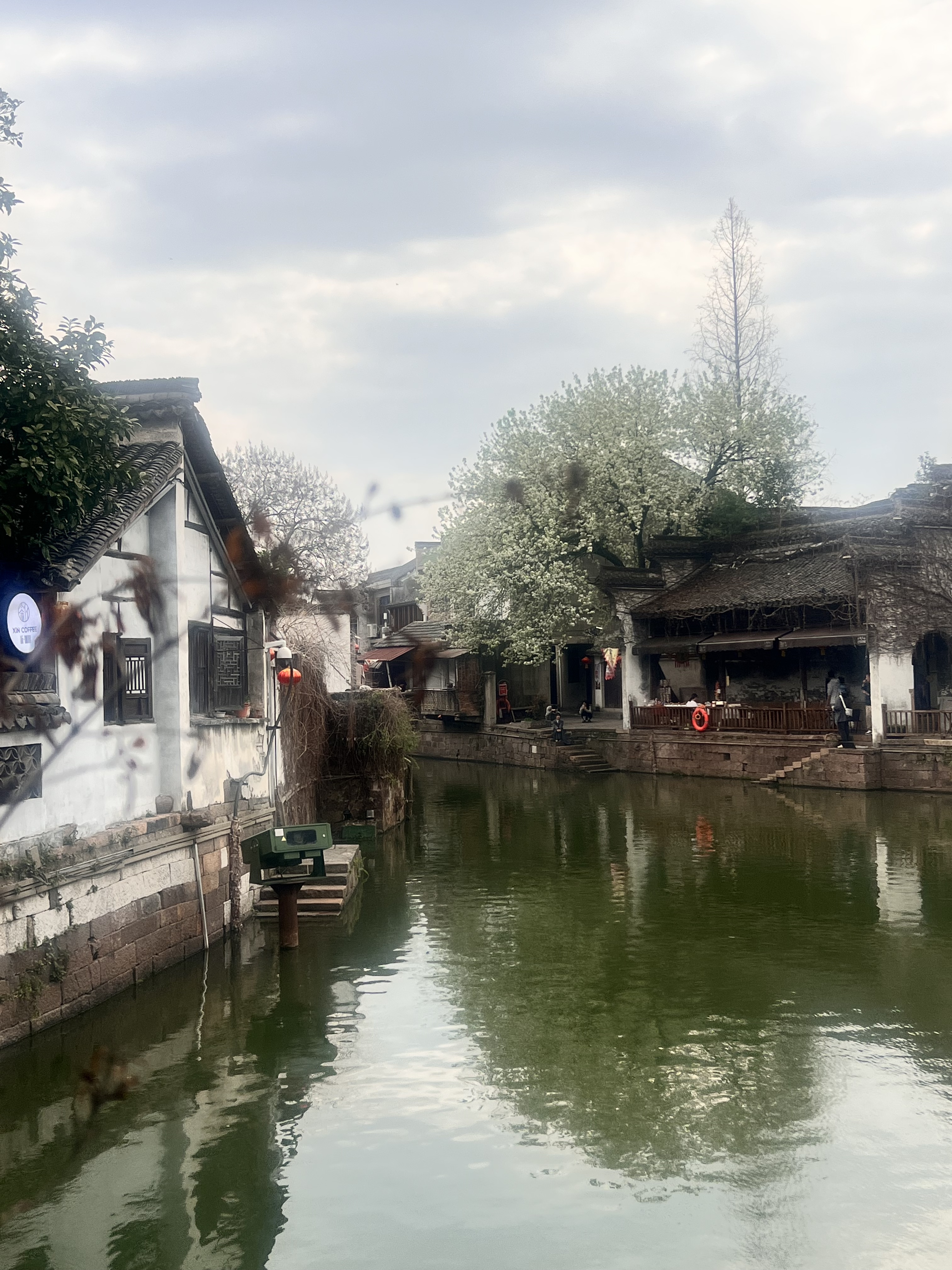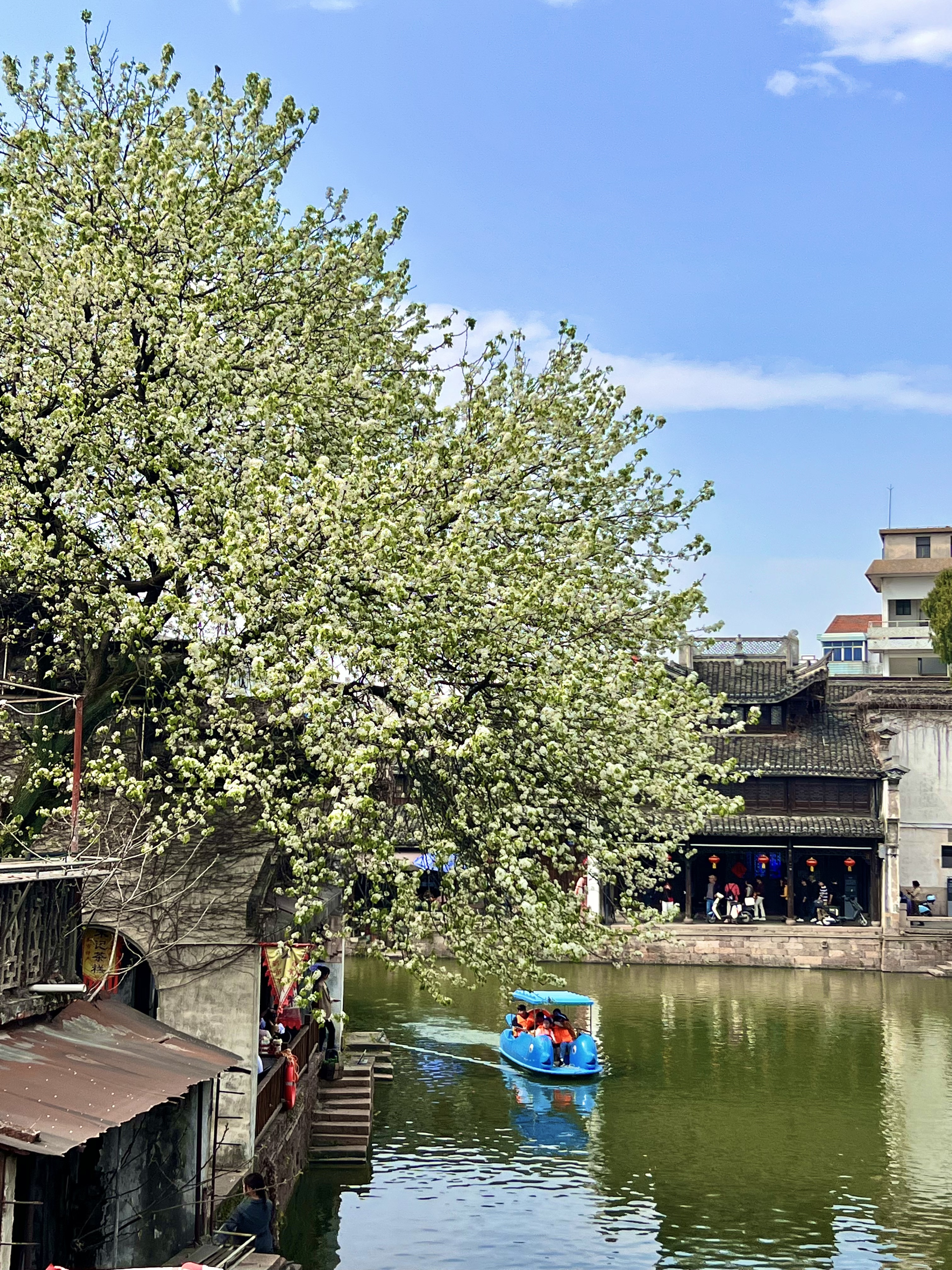三月去新市古镇,千万别错过了陈家潭的这棵稠李树,树高大、茂密、俊美,高大约有十多米,在那古老的宅屋群落里挺拔耸起,略显向东的招摇斜势,出落得一种惊艳风情,这几天花期已至,开得极旺,远看像是一把大伞被撑开,斜放在西南岸上,路过的人无不惊叹,但大家都把它当作是梨花,只是听当地人说,这树叫稠李树,闻所未闻,春天的花太多又太像,真的很难分辨
